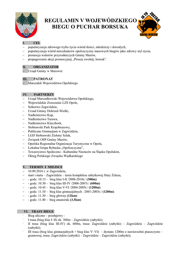 REGULAMIN V WOJEWÓDZKIEGO BIEGU O PUCHAR BORSUKA I. − − − − CEL popularyzacja zdrowego trybu życia wśród dzieci, młodzieży i dorosłych, popularyzacja wśród mieszkańców opolszczyzny masowych biegów jako zdrowy styl życia, promocja walorów przyrodniczych Gminy Murów, propagowanie akcji promocyjnej „Proszę zwolnij, borsuk”. II. ORGANIZATOR − Urząd Gminy w Murowie III. PATRONAT − Marszałek Województwa Opolskiego IV. PARTNERZY − Urząd Marszałkowski Województwa Opolskiego, − Wojewódzkie Zrzeszenie LZS Opole, − Sołectwo Zagwiździe, − Urzad Gminy Dobrzeń Wielki, − Nadleśnictwo Kup, − Nadleśnictwo Turawa, − Nadleśnictwo Kluczbork, − Stobrawski Park Krajobrazowy, − Publiczne Gimnazjum w Zagwiździu, − LGD Stobrawski Zielony Szlak, − Związek OSP Gminy Murów, − Opolska Regionalna Organizacja Turystyczna w Opolu, − Lokalna Grupa Rybacka „Opolszczyzna”, − Towarzystwo Społeczno - Kulturalne Niemców na Śląsku Opolskim, − Okręg Polskiego Związku Wędkarskiego V. − − − − − − − − TERMIN I MIEJSCE 10.09.2016 r. w Zagwiździu, start i meta – Zagwiździe – teren kompleksu zabytkowej Huty Żelaza, - godz. 10.15 – bieg klas I-II /2008-2010r./ (300m) - godz. 10.30 – bieg klas III-IV /2006-2007r./ (600m) - godz. 10.45 – bieg klas V-VI /2004-2005r./ (1200m) - godz. 11.10 – bieg klas gimnazjalnych /2001-2003r./ (1200m) - godz. 11.30 – bieg główny (12km) - godz. 11.40 – bieg amatorski (3,5km) VI. TRASY BIEGU Bieg uliczno – przełajowy : − I trasa (bieg klas I–II) ok. 300m – Zagwiździe (zabytki); − II trasa (bieg klas III-IV) ok. 600m, trasa: Zagwiździe (zabytki) – Zagwiździe – Zagwiździe (zabytki); − III trasa (bieg klas gimnazjalnych + bieg klas V–VI) – dystans 1200m o nawierzchni piaszczysto – gruntowej, trasa: Zagwiździe (zabytki) – Zagwiździe – Zagwiździe (zabytki); − − IV trasa (bieg główny) – dystans 12km o nawierzchni asfaltowej (2km) i piaszczysto – gruntowej (10km), trasa: Zagwiździe (zabytki) do „Wilczej Budy”, powrót tą samą trasą; V trasa (bieg amatorski) – dystans 3,5km o nawierzchni piaszczysto – gruntowej szlakiem ścieżki dydaktycznej, trasa: Zagwiździe (zabytki) – Murów (Kopiec) – Zagwiździe (zabytki). − VII. UCZESTNICTWO Do startu dopuszczeni zostaną zawodnicy, którzy w dniu biegu mają ukończone 18 lat. Zawodnicy niepełnoletni startują tylko i wyłącznie na podstawie pisemnej zgody rodziców (opiekunów) dostarczonej najpóźniej w dniu zawodów. Każdy uczestnik „V WOJEWÓDZKIEGO BIEGU O PUCHAR BORSUKA” biegnie na własną odpowiedzialność. Bieg Główny lub amatorski – możliwe uczestnictwo po ukończeniu 16 roku zycia, za zgodą pisemną rodzica lub prawnego opiekuna. Osoba, która wystartuje w biegu potwierdza tym samym, iż zapoznała się z Regulaminem, a także to, że jej stan zdrowia umożliwia udział w biegach. VIII. ZGŁOSZENIA − drogą elektroniczną na adres mailowy: [email protected] Urzędu Gmniy w Murowie do dnia 08.09.2016r − dodatkowe zgłoszenia w biurze zawodów w dniu 10.09.2016 r., w godz. 900 – 1000 − wszelkie informacje: tel./ fax.: 77 4214034 wew. 105. IX. KLASYFIKACJA A) Bieg główny 12 000 m B) Bieg amatorski 3 500 m C) Bieg szkolno – gimnazjalny: • • • • 1200 m – młodzież gimnazjalna - klasy I – III (kategorie chłopców + dziewcząt) 1200 m – szkoła podstawowa - klasy V – VI (kategorie chłopców + dziewcząt) 600 m – szkoła podstawowa - klasy III – IV (kategorie chłopców + dziewcząt) 300 m – szkoła podstawowa - klasy I – II (kategorie chłopców + dziewcząt) X. NAGRODY − klasyfikacja generalna: Mężczyzn I miejsce Puchar + Medal + II miejsce Puchar + Medal + III miejsce Puchar + Medal + − klasyfikacja generalna: Kobiet I miejsce Puchar + Medal + II miejsce Puchar + Medal + III miejsce Puchar + Medal + − − − − − Bon* o wartości 500,00 PLN Bon* o wartości 300,00 PLN Bon* o wartości 200,00 PLN Bon* o wartości 500,00 PLN Bon* o wartości 300,00 PLN Bon* o wartości 200,00 PLN puchar dla najstarszego uczestnika, młodzież gimnazjalna oraz szkoła podstawowa– I, II, III miejsce: puchar, medal i nagrody rzeczowe, pierwszych 50 uczestników zgłoszonych drogą e-mailową lub telefonicznie do dnia 08.09.2016 r. otrzyma pamiątkowy medal zawodów, dla wszystkich uczestników – pamiątki okolicznościowe, * bon do zrealizowania w sklepie sportowym, wśród wszystkich uczestników biegu głównego i amatorskiego zostaną rozlosowane nagrody w postaci: bieg główny i amatorski - 3 talony każdy wartości 300 zł, dzieci i młodzież – 3 talony każdy wartości 300 zł. /osoba biorąca udział w losowaniu musi być uczestnikiem biegu i go ukończyć, a także uczestniczyć osobiście w trakcie losowania i wręczenia nagrody. Jeśli nie zostaną spełnione przez wylosowaną osobę wszystkie warunki losowania, losowanie zostanie powtórzone/. XI. SPRAWY FINANSOWE − koszty organizacyjne ponosi organizator, − koszty osobowe uczestnicy lub jednostki delegujące. XII. POSTANOWIENIA KOŃCOWE − ostateczne interpretacje Regulaminu należą do organizatora, − impreza odbędzie się bez względu na warunki atmosferyczne, − odbiór numeru startowego jest równoznaczny z akceptacją Regulaminu biegu, − zawodnik ponosi pełną odpowiedzialność za własne działania i zachowanie stosowne do przepisów ruchu drogowego oraz kodeksu cywilnego, − bieg odbywa się przy ograniczonym ruchu drogowym, − ogłoszenie wyników i rozdanie nagród po zakończeniu biegu głównego, osobisty odbiór nagród, − przed losowaniem nagród grupowe zdjęcie uczestników biegu, − kategoria jest uznana jeśli wystartuje min. 5 zawodników, − biuro zawodów: kompleks zabytkowej Huty Żelaza (start i meta), − zaplecze sanitarne w kompleksie zabytkowej Huty Żelaza, − na trasie będą ustawione punkty z niegazowaną wodą, − 