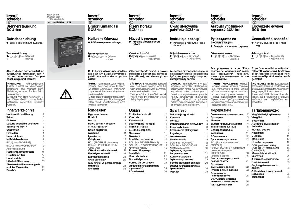 Elster GmbH Postfach 2809 49018 Osnabrück 6.1.2.6 Edition 11.08 D Brennersteuerung GB BCU 4xx D RUS Kullanım Kılavuzu I Bitte H Lütfen okuyun ve saklayın NL lesen und aufbewahren CZ D TR CZ PL TR CZ PL RUS PL řízení hořáku PL BCU 4xx PL Betriebsanleitung TR TR CZ TR Brülör Kumandası CZ BCU 4xx F D D RUS H Návod k provozu Prosíme pročíst a dobře odložit E RUS Układ sterowania RUS palników BCU 4xx Автомат управления H горелкой BCU 4xx Instrukcja obsługi Руководство по эксплуатации H H Égővezérlő egység BCU 4xx Üzemeltetési utasítás Instrukcję przeczytać i prze chować Пожалуйста, прочтите и сохраните Kérjük, olvassa el és őrizze meg Jelmagyarázat , , , ... = tevékenység = tájékoztatás Zeichenerklärung , , , ...= Tätigkeit = Hinweis İşaret açıklaması , , , ... = Çalışma = Uyarı Vysvětlení značek , , , ... = činnost = upozornění Objaśnienie oznaczeń , , , ...= czynność = wskazówka Объяснение знаков , , , ... = Действие = Указание Alle in dieser Betriebsanleitung aufgeführten Tätigkeiten dürfen nur von autorisiertem Fachper sonal ausgeführt werden! Bu kullanım kılavuzunda açıklan mış olan tüm çalışmalar yalnızca yetkili personel tarafından yapıla caktır! Všechny v tomto návodu k provo zu uvedené činnosti smí provádět jen odborný, autorizovaný per sonál! Wszystkie czynności opisane w niniejszej instrukcji obsługi mogą być wykonywane wyłącznie przez autoryzowany serwis! Все указанные в этом “Руко Ezen üzemeltetési utasításban водстве по эксплуатации” дейст felsorolt valamennyi tevékeny вия разрешается проводить séget kizárólag erre feljogosított только уполномоченным на это szakszemélyzettel szabad elvé специалистам! geztetni! WARNUNG! Unsachgemäßer Einbau, Einstellung, Veränderung, Bedienung oder Wartung kann Verletzungen oder Sachschäden verursachen. Anleitung vor dem Gebrauch lesen. Dieses Gerät muss nach den geltenden Vorschriften installiert werden. UYARI! Talimatlara aykırı yapılan montaj, ayar, değiştirme, kullanım ve bakım çalışmaları, yaralanma veya maddi hasarların oluşmasına neden olabilir. Cihazı kullanmadan önce kullanım kılavuzunu okuyun. Bu cihaz geçerli olan teknik yönetmeliklere göre monte edilmelidir. VÝSTRAHA! Neodborné zabudování, nastavení, změny, obsluha nebo údržba mohou vést k ohrožení zdraví a věcným škodám. Před použitím si pročíst návod. Přístroj musí být instalován podle platných předpisů. UWAGA! Niefachowy montaż, regulacja, przeróbki, obsługa lub konserwacja mogą być przyczyną wypadków i szkód materialnych. Przed wykorzystaniem urządzenia należy przeczytać instrukcję obsługi. Montaż urządzenia należy przeprowadzić zgodnie z obowiązującymi przepisami. Inhaltverzeichnis Konformitätserklärung Prüfen Einbauen Leitung auswählen/verlegen Technische Daten Verdrahten Einstellen Kennzeichnen In Betrieb nehmen BCU (ohne PROFIBUS) BCU..B1 mit PROFIBUS-DP Adresseinstellung Hochtemperaturbetrieb Funktion prüfen Handbetrieb Hilfe bei Störungen Ablesen des Flammensignals und der Parameter Zubehör İçindekiler 2 3 4 4 6 7 11 12 12 12 16 16 21 22 23 26 35 38 Uygunluk beyanı Kontrol Montaj Kablo seçimi / döşeme Teknik özellikler Kablo bağlantısı Ayarlama İşaretleme Çalıştırma BCU (PROFIBUS elemansız) BCU..B1 PROFIBUS-DP ile Adres ayarı Yüksek sıcaklık işletmesi Fonksiyon kontrolü Manuel çalıştırma Arıza yardımları Alev sinyali ve parametrenin okunması Aksesuar 2 3 4 4 6 7 11 12 12 12 16 16 21 22 23 26 35 38 Obsah Prohlášení o shodě 2 Kontrola 3 Zabudování 4 Výběr vodičů / uložení 4 Technické údaje 6 Elektrické zapojení 7 Nastavení 11 Označení 12 Spuštění do provozu 12 BCU (bez PROFIsběrnice) 12 BCU..B1 s profisběrnicí-DP 16 Nastavení adresy 16 Provoz při vysokých teplotách 21 Kontrola funkce 22 Manuální provoz 23 Pomoc při poruchách 26 Odečtení signálu plamene a parametrů 35 Příslušenství 38 -1- Spis treści Deklaracja zgodności Kontrola Montaż Dobór/układanie przewodów Dane techniczne Podłączenie elektryczne Regulacja Oznakowanie Uruchomienie BCU (bez PROFIBUS) BCU..B1 z PROFIBUS-DP Nastawienie adresu Tryb pracy wysoko temperaturowej Kontrola działania Tryb obsługi ręcznej Pomoc przy zakłóceniach Odczyt sygnału płomienia i parametrów Osprzęt 2 3 4 4 6 7 11 12 12 12 16 16 21 22 23 26 35 38 ПРЕДУПРЕЖДЕНИЕ! Непра вильные монтаж, наладка, примене ние, управление и техническое обслуживание могут привести к несчастному случаю и аварии. Перед применением прочесть “Руководство”. Прибор должен быть смонтирован согласно действующих предписаний и норм. FIGYELMEZTETÉS! Szakszerűtlen beszerelés, beállítás, módosítás, kezelés vagy karbantartás sérüléseket vagy anyagi károkat okozhat. Használat előtt olvassa el az utasítást. Ezt a készüléket a hatályos előírásoknak megfelelően kell beépíteni. Содержание Tartalomjegyzék Заявление о соответствии Проверка Монтаж Выбор/прокладка кабеля Технические данные Электропроводка Установки Обозначения Пуск в эксплуатацию BCU (без интерфейса шины PROFIBUS) Автомат BCU..B1 с интерфейсом шины обмена данных PROFIBUS-DP Установка адреса Высокотемпературный режим работы Проверка функцио