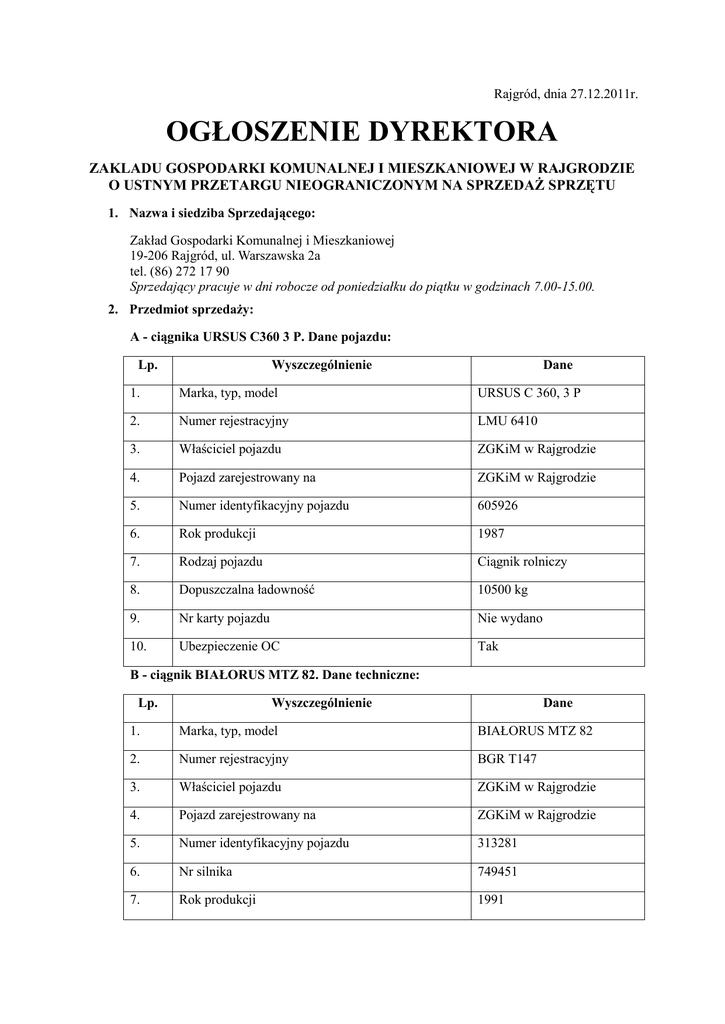 Rajgród, dnia 27.12.2011r. OGŁOSZENIE DYREKTORA ZAKLADU GOSPODARKI KOMUNALNEJ I MIESZKANIOWEJ W RAJGRODZIE O USTNYM PRZETARGU NIEOGRANICZONYM NA SPRZEDAŻ SPRZĘTU 1. Nazwa i siedziba Sprzedającego: Zakład Gospodarki Komunalnej i Mieszkaniowej 19-206 Rajgród, ul. Warszawska 2a tel. (86) 272 17 90 Sprzedający pracuje w dni robocze od poniedziałku do piątku w godzinach 7.00-15.00. 2. Przedmiot sprzedaży: A - ciągnika URSUS C360 3 P. Dane pojazdu: Wyszczególnienie Lp. Dane 1. Marka, typ, model URSUS C 360, 3 P 2. Numer rejestracyjny LMU 6410 3. Właściciel pojazdu ZGKiM w Rajgrodzie 4. Pojazd zarejestrowany na ZGKiM w Rajgrodzie 5. Numer identyfikacyjny pojazdu 605926 6. Rok produkcji 1987 7. Rodzaj pojazdu Ciągnik rolniczy 8. Dopuszczalna ładowność 10500 kg 9. Nr karty pojazdu Nie wydano 10. Ubezpieczenie OC Tak B - ciągnik BIAŁORUS MTZ 82. Dane techniczne: Wyszczególnienie Lp. Dane 1. Marka, typ, model BIAŁORUS MTZ 82 2. Numer rejestracyjny BGR T147 3. Właściciel pojazdu ZGKiM w Rajgrodzie 4. Pojazd zarejestrowany na ZGKiM w Rajgrodzie 5. Numer identyfikacyjny pojazdu 313281 6. Nr silnika 749451 7. Rok produkcji 1991 8. Rodzaj pojazdu Ciągnik rolniczy 9. Dopuszczalna ładowność 15000 10. Nr karty pojazdu Nie wydano 11. Ubezpieczenie OC Tak 12. Liczba osi 2 C – przyczepa ciężarowa. Dane techniczne: Wyszczególnienie Lp. Dane 1. Marka, typ, model AUTOSAN D-732 03 2. Numer rejestracyjny BGR P 627 3. Właściciel pojazdu ZGKiM w Rajgrodzie 4. Pojazd zarejestrowany na ZGKiM w Rajgrodzie 5. Numer identyfikacyjny pojazdu 53013 6. Rok produkcji 1987 7. Rodzaj pojazdu Przyczepa ciężarowa 8. Dopuszczalna ładowność 4000 9. Nr karty pojazdu Nie wydano 10. Ubezpieczenie OC TAK D – wóz asenizacyjny. Dane techniczne: Wyszczególnienie Lp. Dane 1. Marka, typ, model Wóz asenizacyjny PN-90 2. Numer rejestracyjny Nie posiada 3. Właściciel pojazdu ZGKiM w Rajgrodzie 4. Pojazd zarejestrowany na NIE 5. Numer identyfikacyjny pojazdu 183581 6. Rok produkcji 1986 7. Rodzaj pojazdu Wóz asenizacyjny (beczka) 8. Pojemność beczki 9,00 m3 9. Nr karty pojazdu Nie wydano 10. Ubezpieczenie OC TAK 3. Cena wywoławcza sprzętu: A - ciągnika URSUS C360 3 P: 7 000 zł (słownie: siedem tysięcy złotych), B - ciągnik BIAŁORUS MTZ 82: 8 000 zł (słownie: osiem tysięcy złotych), C - przyczepa ciężarowa: 800 zł (słownie: osiemset złotych), D - wóz asenizacyjny: 1 600 zł (słownie: tysiąc sześćset złotych). 4. Przedmiot sprzedaży został podzielony na cztery części : A, B, C, D. W związku z powyższym dopuszcza się możliwość licytowania poszczególnego sprzętu oddzielnie. 5. Warunki aukcji: wysokości postąpienia decydują uczestnicy przetargu, z tym że postąpienie nie może wynieść mniej niż 1 % ceny wywoławczej ustalonej na poszczególny sprzęt, z zaokrągleniem w górę do pełnych dziesiątek złotych, po ustaniu postąpień prowadzący aukcję, uprzedzając obecnych, po trzecim ogłoszeniu zamyka aukcję i udziela przybicia licytantowi, który zaoferował najwyższą cenę, w wyniku przybicia następuje zawarcie umowy sprzedaży przedmiotu aukcji pomiędzy sprzedającym a nabywcą po zatwierdzeniu protokołu z postępowania. 6. Miejsce i termin przetargu: Przetarg odbędzie się w dniu 09.01.2012r. o godzinie 900 w pokoju Dyrektora Zakładu Gospodarki Komunalnej i Mieszkaniowej w Rajgrodzie ul. Warszawska 2A, 19-206 Rajgród. 7. Miejsce zamieszczenia ogłoszenia: Ogłoszenie zostało wywieszone w siedzibie Sprzedającego, na tablicy ogłoszeń w budynku Urzędu Miejskiego w Rajgrodzie, jak również na stronie internetowej Urzędu Miejskiego w Rajgrodzie: http://www.um.rajgrod.pl oraz w Biuletynie Informacji Publicznej Urzędu Miejskiego w Rajgrodzie: http://bip.um.rajgrod.wrotapodlasia.pl/. 8. Miejsce i termin, w którym można obejrzeć sprzęt: Sprzęt jest udostępniony na terenie siedziby Zakładu Gospodarki Komunalnej i Mieszkaniowej w Rajgrodzie przy ul. Warszawskiej 2A, 19-206 Rajgród do dnia 05.01.2012r. w dni robocze od poniedziałku do piątku w godzinach od 700 do 1500. 9. Warunki przystąpienia do przetargu: w postępowaniu brać udział mogą tylko pełnoletni i posiadający pełne zdolności do czynności prawnych, będzie okazanie komisji przetargowej: a). dowodu wpłaty wadium, b). w przypadku osób fizycznych dowodu tożsamości i upoważnienia współmałżonka do udziału w przetargu, c). w przypadku osób prawnych i jednostek organizacyjnych nie posiadających osobowości prawnej – aktualnego wypisu z rejestru, właściwych pełnomocnictw, dowodów tożsamości osób reprezentujących podmiot, jest wpłata wadium w wysokości 10% ceny wywoławczej określonej na poszczególny sprzęt: - za część A ciągnik URSUS C360 3 P – 700 zł (słownie: siedemset złotych), - za część B ciągnik BIAŁORUS MTZ 82 – 800zł (słownie: osiemset złotych), - za część C przyczepę ciężarową – 80 zł (słownie osiemdziesiąt złotych), - za część D wóz asenizacyjny – 160 zł (słownie: sto sześćdziesiąt złotych) komisja przetargowa, niezwłocznie przed wywołaniem aukcji sprawdza, czy oferenci wnieśli wadium w należytej wysokości, wadium należy wpłacić na konto ZGKiM w Rajgrodzie: BS w Szczuczynie Oddział w Rajgrodzie nr: 80 8768 0003 3905 0092 2000 0010 z wyszczególnieniem sprzętu, którego dana wpłata dotyczy, za datę wpływu uważać się będzie datę wpływu pieniędzy na rachunek bankowy Sprzedającego, wadium należy wpłacić do dnia 05.01.2012r. wadium złożone przez Nabywcę zostanie zaliczone na poczet ceny, pozostałym osobom wadium zwraca się w terminie 3 dni od daty zamknięcia przetargu – warunkiem jest podanie konta, na które powinno być zwrócone wadium, wadium nie podlega zwrotowi w przypadku, gdy: - żaden z uczestników przetargu nie zaoferuje, co najmniej ceny wywoławczej, - uczestnik przetargu, który wygrał przetarg uchyli się od zawarcia umowy 10. Informacje dotyczące pł