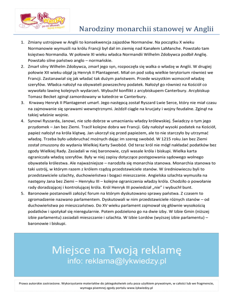 Narodziny monarchii stanowej w Anglii 1. Zmiany ustrojowe w Anglii to konsekwencja zajazdów Normanów. Na początku X wieku Normanowie wymusili na królu Francji był dał im ziemię nad Kanałem LaManche. Powstało tam księstwo Normandia. W połowie XI wieku władca Normandii Wilhelm Zdobywca podbił Anglię. Powstało silne paostwo anglo – normaoskie. 2. Zmarł silny Wilhelm Zdobywca, zmarł jego syn, rozpoczęła się walka o władzę w Anglii. W drugiej połowie XII wieku objął ją Henryk II Plantagenet. Miał on pod sobą wielkie terytorium również we Francji. Zastanawiał się jak władad tak dużym paostwem. Przede wszystkim wzmocnił władzę szeryfów. Władca nałożył na obywateli powszechny podatek. Nałożył go również na Kościół co wywołało lawinę kolejnych wydarzeo. Wybuchł konflikt z arcybiskupem Canterbury. Arcybiskup Tomasz Becket zginął zamordowany w katedrze w Canterbury. 3. Krwawy Henryk II Plantagenet umarł. Jego następcą został Ryszard Lwie Serce, który nie miał czasu na zajmowanie się sprawami wewnętrznymi. Jeździł ciągle na krucjaty i wojny feudalne. Zginął na takiej właśnie wojnie. 4. Synowi Ryszarda, Janowi, nie szło dobrze w umacnianiu władzy królewskiej. Świadczy o tym jego przydomek – Jan bez Ziemi. Tracił kolejne dobra we Francji. Gdy nałożył wysoki podatek na Kościół, papież nałożył na króla klątwę. Jan ukorzył się przed papieżem, ale to nie starczyło by utrzymad władzę. Trzeba było udobruchad możnych dając im szereg swobód. W 1215 roku Jan bez Ziemi został zmuszony do wydania Wielkiej Karty Swobód. Od teraz król nie mógł nakładad podatków bez zgody Wielkiej Rady. Zasiadali w niej baronowie, czyli wasale króla i biskupi. Wielka karta ograniczała władzę szeryfów. Były w niej zapisy dotyczące postępowania sądowego wolnego obywatela królestwa. Ale najważniejsze – narodziła się monarchia stanowa. Monarchia stanowa to taki ustrój, w którym razem z królem rządzą przedstawiciele stanów. W średniowieczu byli to przedstawiciele szlachty, duchowieostwa i bogaci mieszczanie. Angielska szlachta wymusiła na następny Jana bez Ziemi – Henryku III – kolejne ograniczenia władzy króla. Chodziło o powołanie rady doradzającej i kontrolującej króla. Król Henryk III powiedział „nie” i wybuchł bunt. 5. Baronowie postanowili założyd forum na którym dyskutowano sprawy paostwa. Z czasem to zgromadzenie nazwano parlamentem. Dyskutowali w nim przedstawiciele różnych stanów – od duchowieostwa po mieszczaostwo. Do XV wieku parlament zajmował się głównie wysokością podatków i spotykał się nieregularnie. Potem podzielono go na dwie izby. W Izbie Gmin (niższej izbie parlamentu) zasiadali mieszczanie i szlachta. W Izbie Lordów (wyższej izbie parlamentu) – baronowie i biskupi. Prawa autorskie zastrzeżone. Wykorzystanie materiałów do jakiegokolwiek celu poza użytkiem prywatnym, w całości lub we fragmencie, wymaga pisemnej zgody portalu www.lykwiedzy.pl
