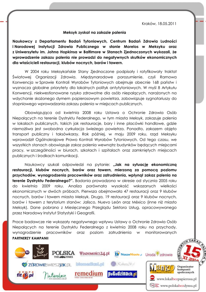 Kraków, 18.05.2011 Meksyk zyskał na zakazie palenia Naukowcy z Departamentu Badań Tytoniowych, Centrum Badań Zdrowia Ludności i Narodowej Instytucji Zdrowia Publicznego w stanie Morelos w Meksyku oraz z Uniwersytetu im. Johna Hopkinsa w Baltimore w Stanach Zjednoczonych wykazali, że wprowadzenie zakazu palenia nie prowadzi do negatywnych skutków ekonomicznych dla właścicieli restauracji, klubów nocnych, barów i tawern. W 2004 roku Meksykańskie Stany Zjednoczone podpisały i ratyfikowały traktat Światowej Organizacji Zdrowia. Międzynarodowe porozumienie, czyli Ramowa Konwencja w Sprawie Kontroli Wyrobów Tytoniowych obejmuje obecnie 168 państw i wyznacza globalne priorytety dla lokalnych polityk antytytoniowych. W myśl 8 Artykułu Konwencji, niekwestionowane ryzyko zdrowotne dla osób niepalących, narażonych na wdychanie skażonego dymem papierosowym powietrza, zobowiązuje sygnatariuszy do stopniowego wprowadzania zakazu palenia w miejscach publicznych. Obowiązująca od kwietnia 2008 roku Ustawa o Ochronie Zdrowia Osób Niepalących na terenie Dystryktu Federalnego, w tym miasta Meksyk, zakazuje palenia w lokalach publicznych, takich jak restauracje, bary i inne placówki handlowe, gdzie niemożliwa jest swobodna cyrkulacja świeżego powietrza. Ponadto, zakazem objęto transport publiczny i taksówkarzy. Rok później, w maju 2009 roku, rząd Meksyku wprowadził Ogólnokrajowe Prawo Kontroli Wyrobów Tytoniowych. Od tego czasu, we wszystkich stanach obowiązuje zakaz palenia wewnątrz budynków będących miejscami pracy, w szczególności w biurach, szkołach i szpitalach oraz zamkniętych miejscach publicznych i środkach komunikacji. Naukowcy szukali odpowiedzi na pytanie: „Jak na sytuację ekonomiczną restauracji, klubów nocnych, barów oraz tawern, mierzoną za pomocą poziomu przychodów, wynagrodzenia pracowników oraz zatrudnienia, wpłynął zakaz palenia na terenie Dystryktu Federalnego?”. Badania prowadzono w okresie od stycznia 2005 roku do kwietnia 2009 roku. Analiza porównała wysokość wskazanych wielkości ekonomicznych w dwóch próbach. Pierwsza obejmowała 47 restauracji oraz 9 klubów nocnych, barów i tawern miasta Meksyk. Druga, 19 restauracji oraz 9 klubów nocnych, barów i tawern z terytorium stanów: Jalisco, Nuevo León oraz México (inne niż miasto Meksyk). Dane pobrano z Miesięcznego Przeglądu Sektora Usług, opracowywanego przez Narodowy Instytut Statystyki i Geografii. Prace badawcze nie wykazały negatywnego wpływu Ustawy o Ochronie Zdrowia Osób Niepalących na terenie Dystryktu Federalnego z kwietnia 2008 roku na przychody, wynagrodzenie pracowników oraz poziom zatrudnienia w monitorowanych PARTNERZY KAMPANII restauracjach, klubach nocnych, barach oraz tawernach. W restauracjach miasta Meksyk, przychody, płace oraz liczba pracowników, wzrosły odpowiednio o 24,8%, 28,2% oraz 16,2%. W klubach nocnych, barach i tawernach, odnotowano spadek przychodów o 1,5%, wzrost wynagrodzenia o 0,1% oraz podniesienie poziomu zatrudnienia o 3%. Równocześnie Narodowy Instytut Zdrowia Publicznego potwierdził zmniejszenie stężenia dymu nikotynowego w lokalach Dystryktu Federalnego w ostatnich 13 miesiącach badań. Analiza udowodniła więc występowanie pozytywnego wpływu zakazu palenia zarówno na zdrowie klientów, jak i wyniki ekonomiczne lokali gastronomiczno-rozrywkowych. Co więcej, działania Zgromadzenia Ustawodawczego Dystryktu Federalnego zdobyło społeczną aprobatę. W marcu 2008 roku, miesiąc przed wejściem w życie ustawy, 80% mieszkańców miasta Meksyk poparło nowe regulacje prawne dotyczące restauracji. W grudniu 2008 roku „za” opowiedziało się już 93%. Zakaz palenia w barach również wywołał pozytywną zmianę nastawienia wśród ludności. 61% obywateli Dystryktu Federalnego akceptowało projekt w marcu, natomiast w grudniu grono zwolenników wzrosło do 71% . Wnioski dla Meksyku korespondują z wynikami rosnącej liczby ogólnoświatowych badań nad ekonomicznymi skutkami ograniczeń przestrzeni dla palaczy. Pozytywny lub neutralny wpływ zakazu palenia potwierdzają: Afryka Południowa, Nowa Zelandia, Hong Kong, stan Tasmania w Australii, Urugwaj, Kanada, stany Kalifornia, Massachusetts, Arizona oraz miasto New York w Stanach Zjednoczonych. PARTNERZY KAMPANII
