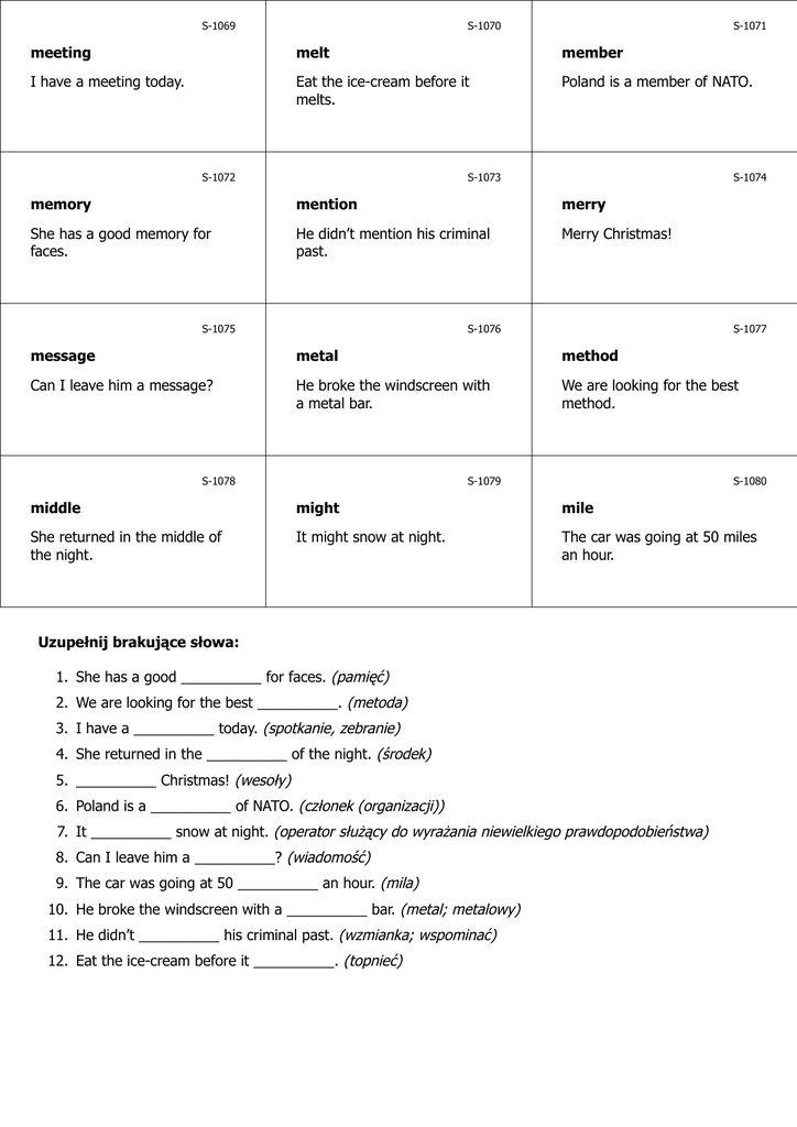 S-1069 S-1070 S-1071 meeting melt member I have a meeting today. Eat the ice-cream before it melts. Poland is a member of NATO. S-1072 S-1073 S-1074 memory mention merry She has a good memory for faces. He didn’t mention his criminal past. Merry Christmas! S-1075 S-1076 S-1077 message metal method Can I leave him a message? He broke the windscreen with a metal bar. We are looking for the best method. S-1078 S-1079 S-1080 middle might mile She returned in the middle of the night. It might snow at night. The car was going at 50 miles an hour. Uzupełnij brakujące słowa: 1. She has a good __________ for faces. (pamięć) 2. We are looking for the best __________. (metoda) 3. I have a __________ today. (spotkanie, zebranie) 4. She returned in the __________ of the night. (środek) 5. __________ Christmas! (wesoły) 6. Poland is a __________ of NATO. (członek (organizacji)) 7. It __________ snow at night. (operator służący do wyrażania niewielkiego prawdopodobieństwa) 8. Can I leave him a __________? (wiadomość) 9. The car was going at 50 __________ an hour. (mila) 10. He broke the windscreen with a __________ bar. (metal; metalowy) 11. He didn’t __________ his criminal past. (wzmianka; wspominać) 12. Eat the ice-cream before it __________. (topnieć) S-1071 S-1070 S-1069 członek (organizacji) topnieć spotkanie, zebranie Polska jest członkiem NATO. Zjedz lody, zanim stopnieją. Mam dziś zebranie. www.isel.edu.pl www.isel.edu.pl www.isel.edu.pl S-1074 S-1073 S-1072 wesoły wzmianka; wspominać pamięć Wesołych Świąt! Nie wspomniał o swojej kryminalnej przeszłości. Ona ma dobrą pamięć do twarzy. www.isel.edu.pl www.isel.edu.pl www.isel.edu.pl S-1077 S-1076 S-1075 metoda metal; metalowy wiadomość Szukamy najlepszej metody. Wybił przednią szybę (samochodu) metalowym prętem. Mogę zostawić mu wiadomość? www.isel.edu.pl www.isel.edu.pl www.isel.edu.pl S-1080 S-1079 S-1078 mila Samochód jechał z prędkością 50 mil na godzinę. operator służący do wyrażania niewielkiego prawdopodobieństwa środek Wróciła w środku nocy. W nocy może padać śnieg. www.isel.edu.pl Odpowiedzi: 1. memory 2. method 3. meeting 4. middle 5. Merry 6. member 7. might 8. message 9. miles 10. metal 11. mention 12. melts www.isel.edu.pl www.isel.edu.pl