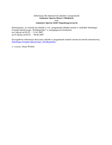 Informacja dla chętnych do udziału w programach Animator Sportu Dzieci i Młodzieży oraz Animator Sportu Osób Niepełnosprawnych Informujemy, że wnioski do udziału w ww. programach składać można w siedzibie Szkolnego Związku Sportowego „Wielkopolska” w następujących terminach: na I edycję od 02.01. – 31.01.2007 na II edycję od 02.01. – 08.06.2007 Szczegółowe informacje dotyczące udziału w programach znaleźć można na stronie internetowej Szkolnego Związku Sportowego „Wielkopolska” st. wizytator Alicja Wróbel