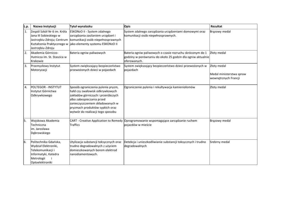 L.p. 1. Nazwa instytucji Tytuł wynalazku Opis Rezultat Zespól Szkół Nr 6 im. Króla Jana III Sobieskiego w Jastrzębiu-Zdroju; Centrum Kształcenia Praktycznego w Jastrzębiu-Zdroju Akademia GórniczoHutnicza im. St. Staszica w Krakowie Przemysłowy Instytut Motoryzacji ESKONzO II - System zdalnego System zdalnego zarządzania urządzeniami domowymi oraz zarządzania zasilaniem urządzeń i komunikacji osób niepełnosprawnych. komunikacji osób niepełnosprawnych jako elementy systemu ESKONzO II 4. POLTEGOR - INSTYTUT Instytut Górnictwa Odkrywkowego Sposób ograniczenia pylenia pryzm, hałd czy zwałowisk odkrywkowych zakładów górniczych i przeróbczych albo zabezpieczania przed zanieczyszczeniem składowanych w pryzmach produktów sypkich oraz wytwór do realizacji tego sposobu 5. Wojskowa Akademia Techniczna im. Jarosława Dąbrowskiego CART - Creative Application to Remedy Oprogramowanie wspomagające zarządzanie ruchem Traffics pojazdów w mieście Brązowy medal 6. Politechnika Gdańska, Wydział Elektroniki, Telekomunikacji i Informatyki, Katedra Metrologii i Optoelektroniki Utylizacja substancji toksycznych oraz Detekcja i unieszkodliwianie substancji toksycznych i trudno trudno degradowalnych z użyciem degradowalnych domieszkowanych borem elektrod nanodiamentowych. Srebrny medal 2. 3. Bateria ogniw paliwowych System zwiększający bezpieczeństwo przewożonych dzieci w pojazdach Brązowy medal Bateria ogniw paliwowych o czasie rozruchu skróconym do 1 Złoty medal godziny w porównaniu do około 25 godzin dla ogniw aktualnie oferowanych. System zwiększający bezpieczeństwo dzieci przewożonych w Złoty medal pojazdach Medal ministerstwa spraw wewnętrznych Francji Ograniczenie pylenia i rekultywacja kamieniołomów Złoty medal 7. Politechnika Gdańska, Wydział Chemiczny Ekologiczna, kompostowalnakompozycja polimerowa Nowy biodegradowalny materiał do produkcji plastikowych pojemników, opakowań i narzędzi Złoty medal 8. Politechnika Gdańska, Wydział Mechaniczny Satelitowy agregat pompowy Wydajny agregat pompowy o rewolucyjnej budowie do użytku przemysłowego Złoty medal 9. Politechnika Gdańska Wydział Elektroniki, Telekomunikacji i Informatyki Sposób kanonicznej konwersji napięcia Oszczędny konwerter napięcia pozwalający uzyskać i układ do realizacji sposobu – planowane napięcie przy użyciu minimalnej liczby „magiczna” pompa ładunkowa kondensatorów Brązowy medal 10. Instytut Mechaniki Precyzyjnej Antybakteryjne powłoki kompozytowe Antybakteryjne powłoki kompozytowe z porowatego tlenku z porowatego tlenku glinu ze srebrem glinu zawierającego nanocząstki srebra, wytwarzane na na powierzchniach aluminiowych powierzchniach aluminiowych Złoty medal 11. Instytut Mechaniki Precyzyjnej Innowacyjna metoda fluidalnego azotowania narzędzi skrawających w aktywnych chemicznie mikroproszkach. Nowa, wydajna i proekologiczna technologia hartowania elementów narzędzi skrawających Srebrny medal 12. Uniwersytet Jagielloński Monolityczny układ katalityczny do usuwania podtlenku azotu Katalityczny układ do ekologicznego usuwania podtlenku azotu z gazów odlotowych instalacji przemysłowych Srebrny medal 13. Uniwersytet Jagielloński Wielofunkcyjne kompozyty chitozannanocząstki tlenku cynku do zastosowań medycznych i kosmetycznych Wynalazek dotyczy nowej metody syntezy Brązowy medal nanokompozytowego materiału oraz składu samego materiału, który stanowią nanokompozyty tlenku cynku (ZnO) zmodyfikowane powierzchniowo biokompatybilnym polimerem – chitozanem. Dzięki temu uzyskano materiał o unikalnych właściwościach biomedycznych. Medal ministerstwa ds. europejskich Francji 14. Uniwersytet Jagielloński 15. Uniwersytet Jagielloński Sposób modyfikacji naturalnych szczepów drożdży Saccharomyces sp., zmodyfikowany szczep drożdży Saccharomyces sp. oraz sposób izolacji komórek spoczynkowych drożdży Kompozycja farmaceutyczna do stosowania w leczeniu lub profilaktyce ryb Otrzymywanie szczepów drożdży o lepszej przeżywalności dla Srebrny medal winiarstwa, piwowarstwa, piekarnictwa i produkcji kosmetyków Suplement diety do stosowania w leczeniu lub profilaktyce chorób ryb ozdobnych i przeznaczonych do konsumpcji Brązowy medal 16. Instytut Biopolimerów i Włókien Chemicznych Biodegradowalne doniczki zawierające Biodegradowalne doniczki stosowane do rozwoju siewek Srebrny medal nawóz, przeznaczone do rozwoju (młodych roślin z nasion), które po okresie wstępnego młodych roślin z nasion wzrostu przesadzane są do ziemi. Zaletą doniczek biodegradowalnych jest możliwość zasadzenia rośliny w glebie bez konieczności usuwania doniczki, która ulega rozkładowi w glebie dostarczając roślinie nawozu w postaci siarczanu potasu. 17. Instytut Włókiennictwa Sposób biofunkcjonalizacji materiałów Użycie krzemianu miedzi w celu nadania materiałom włókienniczych włókienniczym właściwości antybakteryjnych i antygrzybicznych Brązowy medal 18. Uniwersytet Mikołaja Kopernika w Toruniu Węgle aktywowane o wysokiej zawartości azotu i wysokim przewodnictwie elektrycznym oraz sposób otrzymywania węgli aktywowanych zwłaszcza do wytwarzania elektrod Złoty medal 19. Uniwersytet Mikołaja Kopernika w Toruniu System do wspomagania rozwoju System wspomagania rozwoju percepcyjno-poznawczego Złoty medal percepcyjno-poznawczego niemowląt i niemowląt i małych dzieci oraz detekcji zaburzeń tego rozwoju małych dzieci i ich leczenia Węgle aktywowane wytwarzane z chityny lub chitozanu, o wysokiej zawartości azotu i wysokim przewodnictwie elektrycznym, do wytwarzania elektrod niezawierających metali szlachetnych lub ciężkich 20. Instytut Mechanizacji Budownictwa i Górnictwa Skalnego Termiczna metoda utylizacji odpadów niebezpiecznych, pozwalająca na wytworzenie kruszywa lekkiego, jako zamiennika naturalnej krzemionki Wynalazek dotyczy termicznej metody utylizacji Srebrny medal odpadów niebezpiecznych, która pozwal