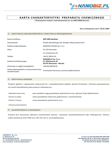 KARTA CHARAKTERYSTYKI PREPARATU CHEMICZNEGO [ SPORZĄDZONA ZGODNIE Z ROZPORZĄDZENIEM WE NR 1907/2006 (REACH) ] DATA SPORZĄDZENIA KARTY: 20.01.2009 1. IDENTYFIKACJA SUBSTANCJI /PREPARATU I IDENTYFIKACJA PRZEDSIĘBIORSTWA Nazwa handlowa NPS 200 Sanitizer Zastosowanie Środek dezynfekujący do różnego rodzaju powierzchni Podmiot odpowiedzialny NANOPAC POLSKA Sp. Z o.o. Adres 41‐219 Sosnowiec ul. Lenartowicza 24 Telefon +48 32 298 01 03 Podmiot konfekcjonujący NANOBIZ.PL Sp. Z o.o. Ul. Mickiewicza 39 05‐075 Warszawa ‐ Wesoła Informacja w nagłych przypadkach +48 022/490 60 05 Osoba odpowiedzialna za opracowanie karty Przemysław Konieczny, [email protected] charakterystyki 2. IDENTYFIKACJA ZAGROŻEŃ Preparat zgodnie z najnowszymi wytycznymi EU i ustawodawstwem polskim, danymi firmowymi i literaturą specjalistyczną nie został sklasyfikowany jako preparat niebezpieczny. NARAŻENIE INHALACYJNE: pary produktu mogą powodować podrażnienie nosa i górnych dróg oddechowych. KONTAKT ZE SKÓRĄ: może powodować miejscowe podrażnienie i zaczerwienienie. KONTAKT Z OCZAMI: może powodować podrażnienie oczu. Chronić przed dziećmi. 3. SKŁAD/INFORMACJA O SKŁADNIKACH Preparat jest mieszaniną substancji wymienionych poniżej i substancji niesklasyfikowanych jako niebezpieczne. Zawiera srebro metaliczne (CAS 7440‐22‐4, WE 231‐131‐3, nie klasyfikowane). „NANOBIZ.PL” Sp. z o.o. ul. Mickiewicza 39 05‐075 Warszawa‐Wesoła tel. +48 022/490 60 05; fax. +48 022/490 60 28 www.nanobiz.pl; e‐mail: [email protected] nr konta: 63 1160 2202 0000 0001 0098 3848 Sąd Rejonowy dla M. St. Warszawy w Warszawie XIII Wydział Gospodarczy KRS: 0000287517 NIP: 952‐203‐14‐41; REGON: 141123390 Nazwa substancji Numer CAS Izopropanol Numer indeksowy Numer WE 67-63-0 200-661-7 Stężenie, Klasyfikacja % wag. F, Xi, R11, R36, 40 R67 Etanol Srebro Ag 64-17-5 7440-22-4 200-578-6 231-131-3 20 0,002 F, R11 4. PIERWSZA POMOC DROGI ODDECHOWE: Wyprowadzić na świeże powietrze; w przypadku trudności z oddychaniem skontaktować się z lekarzem. KONTAKT Z OCZAMI: Przemywać wielokrotnie dużą ilością czystej wody trzymając szeroko otwarte powieki przez 10 min. Skontaktować się z lekarzem. Zdjąć zanieczyszczoną odzież. Skórę przemyć wodą. Nie wymuszać wymiotów. Przepłukać usta wodą. Pić wodę. Skontaktować się z lekarzem. Osobie nieprzytomnej nie podawać niczego do ust. KONTAKT ZE SKÓRĄ: SPOŻYCIE: 5. postępowanie w przypadku pożaru Zawiadomić otoczenie o pożarze, powiadomić Straż Pożarną, a w razie konieczności także Policję. Usunąć z obszaru zagrożenia wszystkie osoby niebiorące udziału w likwidowaniu pożaru. Preparat zawiera dużą ilość wysoce łatwopalnych składników w roztworze wodnym. Preparat wysoce łatwopalny ŚRODKI GAŚNICZE ZALECANE: Piana odporna na działanie , agregaty CO2 , proszek lub rozpryskujący się strumień wody ŚRODKI GAŚNICZE NIEODPOWIEDNIE: Zwarty strumień wody NIEBEZPIECZNE PRODUKTY ROZKŁADU W wyniku rozkładu w czasie spalanie mogą powstawać toksyczne gazy ŚRODKI OCHRONY OSOBISTEJ: Odzież ognioodporna i aparat izolujący do oddychania. 6. POSTĘPOWANIE W PRZYPADKU NIEZAMIERZONEGO UWOLNIENIA DO ŚRODOWISKA INDYWIDUALNE ŚRODKI OSTROŻNOŚCI: Nie wdychać par. Stosować odzież ochronną, ochronę twarzy i rąk ŚRODKI OSTROŻNOŚCI W ODNIESIENIU DO ŚRODOWISKA: Zapobiec przedostaniu się do ścieków, wód, gleby. W przypadku niezamierzonego przedostania się do ścieków, wód powierzchniowych i wód gruntowych zawiadomić właściwe władze. „NANOBIZ.PL” Sp. z o.o. ul. Mickiewicza 39 05‐075 Warszawa‐Wesoła tel. +48 022/490 60 05; fax. +48 022/490 60 28 www.nanobiz.pl; e‐mail: [email protected] nr konta: 63 1160 2202 0000 0001 0098 3848 Sąd Rejonowy dla M. St. Warszawy w Warszawie XIII Wydział Gospodarczy KRS: 0000287517 NIP: 952‐203‐14‐41; REGON: 141123390 METODY OCZYSZCZANIA: Zapewnić odpowiednią wentylację. Wylany materiał usunąć mechanicznie, resztę zebrać do pojemnika na odpady za pomocą substancji adsorbującej ciecz (np. mączka drzewna, ziemia okrzemkowa, piasek, trociny). Dalsze informacje na temat usuwania odpadów patrz rozdział. 13. Zanieczyszczone powierzchnie spłukać wodą. 7. postępowanie z substancją/preparatem i jej/jego magazynowanie Podczas stosowania i przechowywania produktu przestrzegać ogólnie obowiązujące przepisy BHP POSTĘPOWANIE Z SUBSTANCJĄ/PREPARATEM: Postępować tak jak w przypadku preparatów chemicznych; zapewnić dobrą wentylację pomieszczeń. Nie rozpylać nad otwartym płomieniem lub żarzącym materiałem. Nie palić w czasie aplikacji. Nie mieszać zawartości pojemników z innymi chemikaliami. MAGAZYNOWANIE: Przechowywać z dala od źródeł zapłonu w pomieszczeniach wentylowanych. Nie palić tytoniu. Nie przechowywać razem z mocnymi kwasami, zasadami i środkami utleniającymi lub redukującymi, gumą, plastikami, aluminium i metalami lekkimi. Magazynować w suchym i dobrze wentylowanym miejscu w oryginalnych pojemnikach w pozycji pionowej. Po otwarciu opakowanie należy zamykać. Chronić przed bezpośrednim światłem słonecznym i wysoką temperaturą. Nie przechowywać z żywnością, napojami i paszą. Chronić przed dziećmi. 8. KONTROLA NARAŻENIA/ŚRODKI OCHRONY INDYWIDUALNEJ Preparat zawiera składnik szkodliwy dla zdrowia w środowisku pracy (wg regulacji o najwyższych dopuszczalnych stężeniach w zależności od czasu narażenia w ciągu zmiany roboczej zawartych w Dz. U. Nr 217 poz. 1833 z 29.11.2002 oraz zmianami Dz. U. Nr 212 poz. 1769 z 10.10.2005 r.) izopropanol NDS – 900 mg/m3 NDSCh – 1200 mg/m3 3 etanol NDS -1900 mg/m ZALECENIA OGÓLNE: W miejscu pracy należy zapewnić punkt do mycia i płukania oczu. Sprzęt ochronny osobistej powinien znajdować się w miejscu pracy. OCHRONA DRÓG ODDECHOWYCH: Preparat nie stwarza zagrożenia podczas normalnego użytkowania preparatu i przestrzeganiu zaleceń bezpieczeń