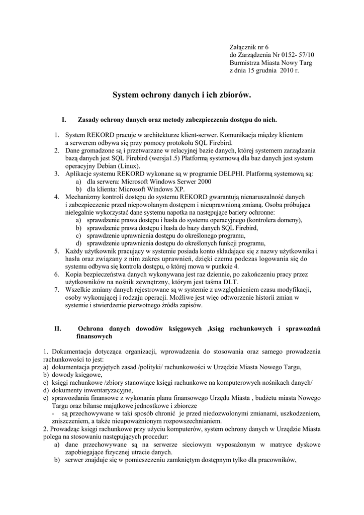 Załącznik nr 6 do Zarządzenia Nr 0152- 57/10 Burmistrza Miasta Nowy Targ z dnia 15 grudnia 2010 r. System ochrony danych i ich zbiorów. I. Zasady ochrony danych oraz metody zabezpieczenia dostępu do nich. 1. System REKORD pracuje w architekturze klient-serwer. Komunikacja między klientem a serwerem odbywa się przy pomocy protokołu SQL Firebird. 2. Dane gromadzone są i przetwarzane w relacyjnej bazie danych, której systemem zarządzania bazą danych jest SQL Firebird (wersja1.5) Platformą systemową dla baz danych jest system operacyjny Debian (Linux). 3. Aplikacje systemu REKORD wykonane są w programie DELPHI. Platformą systemową są: a) dla serwera: Microsoft Windows Serwer 2000 b) dla klienta: Microsoft Windows XP. 4. Mechanizmy kontroli dostępu do systemu REKORD gwarantują nienaruszalność danych i zabezpieczenie przed niepowołanym dostępem i nieuprawnioną zmianą. Osoba próbująca nielegalnie wykorzystać dane systemu napotka na następujące bariery ochronne: a) sprawdzenie prawa dostępu i hasła do systemu operacyjnego (kontrolera domeny), b) sprawdzenie prawa dostępu i hasła do bazy danych SQL Firebird, c) sprawdzenie uprawnienia dostępu do określonego programu, d) sprawdzenie uprawnienia dostępu do określonych funkcji programu, 5. Każdy użytkownik pracujący w systemie posiada konto składające się z nazwy użytkownika i hasła oraz związany z nim zakres uprawnień, dzięki czemu podczas logowania się do systemu odbywa się kontrola dostępu, o której mowa w punkcie 4. 6. Kopia bezpieczeństwa danych wykonywana jest raz dziennie, po zakończeniu pracy przez użytkowników na nośnik zewnętrzny, którym jest taśma DLT. 7. Wszelkie zmiany danych rejestrowane są w systemie z uwzględnieniem czasu modyfikacji, osoby wykonującej i rodzaju operacji. Możliwe jest więc odtworzenie historii zmian w systemie i stwierdzenie pierwotnego źródła zapisów. II. Ochrona danych dowodów księgowych ,ksiąg rachunkowych i sprawozdań finansowych 1. Dokumentacja dotycząca organizacji, wprowadzenia do stosowania oraz samego prowadzenia rachunkowości to jest: a) dokumentacja przyjętych zasad /polityki/ rachunkowości w Urzędzie Miasta Nowego Targu, b) dowody księgowe, c) księgi rachunkowe /zbiory stanowiące księgi rachunkowe na komputerowych nośnikach danych/ d) dokumenty inwentaryzacyjne, e) sprawozdania finansowe z wykonania planu finansowego Urzędu Miasta , budżetu miasta Nowego Targu oraz bilanse majątkowe jednostkowe i zbiorcze - są przechowywane w taki sposób chronić je przed niedozwolonymi zmianami, uszkodzeniem, zniszczeniem, a także nieupoważnionym rozpowszechnianiem. 2. Prowadząc księgi rachunkowe przy użyciu komputerów, system ochrony danych w Urzędzie Miasta polega na stosowaniu następujących procedur: a) dane przechowywane są na serwerze sieciowym wyposażonym w matryce dyskowe zapobiegające fizycznej utracie danych. b) serwer znajduje się w pomieszczeniu zamkniętym dostępnym tylko dla pracowników, c) d) e) f) kopie danych tworzone są codziennie na taśmie magnetycznej, raz w tygodniu dane odtwarzane są z taśmy , kopie przechowywane są w sejfie na terenie Urzędu Miasta, ochrona programów i danych zapewniona jest poprzez system operacyjny serwera, który zakłada dostęp do danych i programu tylko uprawnionym użytkownikom po podaniu identyfikatora i hasła. 3. Księgi rachunkowe mogą mieć formę zbiorów utrwalonych na komputerowych nośnikach danych pod warunkiem przestrzegania powyższych zasad ich ochrony jeżeli są podobnie jak prowadzone w formie tradycyjnej: a) trwale oznaczone nazwą Urzędu Miasta, nazwą danego rodzaju księgi /zbioru/, oraz nazwą programu przetwarzania, b) wyraźnie oznaczone jakiego roku obrotowego i okresów sprawozdawczych dotyczą oraz datami ich sporządzania, c) starannie przechowywane w z góry ustalonej kolejności. 4. Przy prowadzeniu ksiąg rachunkowych przy użyciu komputerów za równoważne z nimi należy uznać informatyczne zasoby rachunkowości zorganizowane w formie oddzielnych zbiorów danych, baz danych lub ich wyodrębnionych części. Dodatkowo gdy system ochrony zbiorów danych ksiąg rachunkowych na nośnikach komputerowych nie spełnia w pełni warunków ich ochrony to zapisy dokonane na komputerowych nośnikach danych powinny być wydrukowane najpóźniej na koniec roku obrotowego. III. Przechowywanie dowodów księgowych, ksiąg rachunkowych i sprawozdań finansowych. 1. Dowody księgowe i dokumenty inwentaryzacyjne przechowuje się w biurze Wydziału Finansowego Urzędu Miasta w formie oryginałów w segregatorach w porządku z góry ustalonym i dostosowanym do sposobu prowadzenia ksiąg rachunkowych z podziałem na okresy sprawozdawcze i lata obrotowe w formie ułatwiającej łatwe ich odszukanie. tj. osobno zbiory dokumentów dotyczących dochodów budżetowych i wydatków budżetowych. Osobne zbiory dokumentów księgowych tworzy się i przechowuje dla Gminnego Funduszu Ochrony Środowiska i Gospodarki Wodnej, funduszu świadczeń socjalnych, rachunku dochodów własnych oraz środków depozytowych. 2. W odrębnych zbiorach są przechowywane po zatwierdzeniu sprawozdania finansowego z wykonania budżetu za dany rok obrotowy: a) sprawozdania finansowe z wykonania planu finansowego Urzędu Miasta jako jednostki budżetowej; miesięczne, kwartalne i roczne wraz z materiałami pomocniczymi, b) sprawozdania finansowe z wykonania budżetu miasta za dany rok miesięczne, kwartalne i roczne wraz ze sprawozdaniami jednostkowymi, c) sprawozdania opisowe z wykonania budżetu miasta za I-półrocze i za rok, d) bilanse jednostkowe oraz zbiorcze wszystkich jednostek organizacyjnych powiązanych z budżetem miasta. Zbiory roczne dowodów księgowych i dokumentów inwentaryzacyjnych należy oznaczyć ich nazwami rodzajów oraz symbolami lat i ich kolejnymi numerami w zbiorach. IV. Czas przechowywania dokumentacji z zakresu rachunkowości. 1. Sprawozdania finansowe,