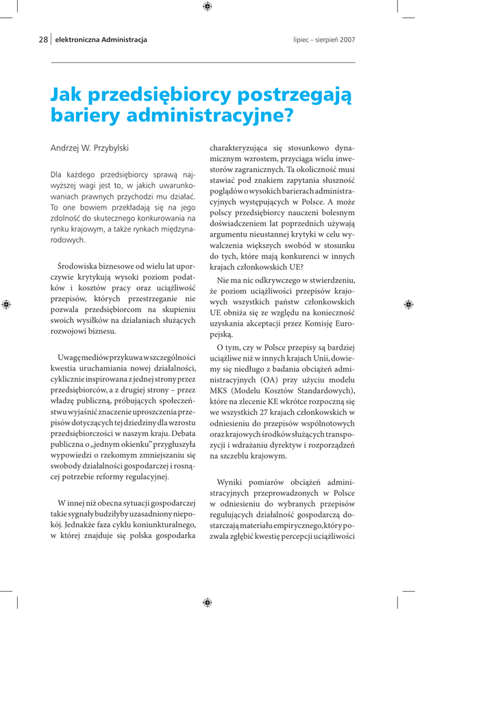 28 elektroniczna Administracja lipiec – sierpień 2007 Jak przedsiębiorcy postrzegają bariery administracyjne? Andrzej W. Przybylski Dla każdego przedsiębiorcy sprawą najwyższej wagi jest to, w jakich uwarunkowaniach prawnych przychodzi mu działać. To one bowiem przekładają się na jego zdolność do skutecznego konkurowania na rynku krajowym, a także rynkach międzynarodowych. Środowiska biznesowe od wielu lat uporczywie krytykują wysoki poziom podatków i kosztów pracy oraz uciążliwość przepisów, których przestrzeganie nie pozwala przedsiębiorcom na skupieniu swoich wysiłków na działaniach służących rozwojowi biznesu. Uwagę mediów przykuwa w szczególności kwestia uruchamiania nowej działalności, cyklicznie inspirowana z jednej strony przez przedsiębiorców, a z drugiej strony – przez władzę publiczną, próbujących społeczeństwu wyjaśnić znaczenie uproszczenia przepisów dotyczących tej dziedziny dla wzrostu przedsiębiorczości w naszym kraju. Debata publiczna o „jednym okienku” przygłuszyła wypowiedzi o rzekomym zmniejszaniu się swobody działalności gospodarczej i rosnącej potrzebie reformy regulacyjnej. W innej niż obecna sytuacji gospodarczej takie sygnały budziłyby uzasadniony niepokój. Jednakże faza cyklu koniunkturalnego, w której znajduje się polska gospodarka charakteryzująca się stosunkowo dynamicznym wzrostem, przyciąga wielu inwestorów zagranicznych. Ta okoliczność musi stawiać pod znakiem zapytania słuszność poglądów o wysokich barierach administracyjnych występujących w Polsce. A może polscy przedsiębiorcy nauczeni bolesnym doświadczeniem lat poprzednich używają argumentu nieustannej krytyki w celu wywalczenia większych swobód w stosunku do tych, które mają konkurenci w innych krajach członkowskich UE? Nie ma nic odkrywczego w stwierdzeniu, że poziom uciążliwości przepisów krajowych wszystkich państw członkowskich UE obniża się ze względu na konieczność uzyskania akceptacji przez Komisję Europejską. O tym, czy w Polsce przepisy są bardziej uciążliwe niż w innych krajach Unii, dowiemy się niedługo z badania obciążeń administracyjnych (OA) przy użyciu modelu MKS (Modelu Kosztów Standardowych), które na zlecenie KE wkrótce rozpoczną się we wszystkich 27 krajach członkowskich w odniesieniu do przepisów wspólnotowych oraz krajowych środków służących transpozycji i wdrażaniu dyrektyw i rozporządzeń na szczeblu krajowym. Wyniki pomiarów obciążeń administracyjnych przeprowadzonych w Polsce w odniesieniu do wybranych przepisów regulujących działalność gospodarczą dostarczają materiału empirycznego, który pozwala zgłębić kwestię percepcji uciążliwości Jak przedsiębiorcy postrzegają bariery administracyjne? przepisów prawnych na tle zmierzonych obiektywnie kosztów ponoszonych przez przedsiębiorców w związku z ich przestrzeganiem. Aby móc znaleźć odpowiedź na pytanie zawarte w tytule artykułu, posłużymy się wynikami upublicznionego przez Ministerstwo Gospodarki pomiaru obciążeń wynikających z przepisów o ogólnym bezpieczeństwie produktów1. Czym są bariery administracyjne w powszechnym rozumieniu tego terminu? Zanim przystąpimy do oceny poglądów polskich przedsiębiorców, spróbujmy uporządkować naszą wiedzę o barierach administracyjnych. Wszystko, co utrudnia działalność przedsiębiorcom, jest przez nich uznawane za barierę administracyjną. Dlatego pod pojęciem tym kryją się zarówno podatki i opłaty administracyjne oraz swoboda w dostępie do kapitału, jak i wymogi informacyjne lub sprawozdawcze, wynikające z konkretnych przepisów prawnych, które regulują działalność prowadzoną przez przedsiębiorcę. Budżetowy kontekst funkcjonowania barier administracyjnych Na użytek naszych rozważań musimy dokonać rozróżnienia między czynnikami o charakterze: x egzogenicznym, których wpływ na ograniczenie swobody działalności wynika z równowagi budżetowej oraz cząstkowych równowag na rynku pracy, niektórych rynkach surowcowych i nośników energii oraz rynku kapitałowym, a także x endogenicznym, które z natury rzeczy wynikają z przepisów prawnych, narzucających wszystkim przedsiębiorcom określone obowiązki prawne, wśród których szczególną rolę pełnią obowiązki informacyjne na rzecz władz administracyjnych i podmiotów trzecich. W praktyce władza polityczna nie ma wpływu na kształtowanie czynników egzogenicznych. Stąd też stwarzanie „sprzyjającego klimatu gospodarczego” poprzez obniżki podatków dochodowych i VAT lub opłat administracyjnych występuje najczęściej wówczas, gdy sytuacja budżetu państwa jest na tyle dobra, że wprowadzenie takiej polityki w życie nie prowadzi w średnioterminowej perspektywie do uszczuplenia przychodów budżetowych, służących najczęściej finansowaniu dość sztywnych wydatków socjalnych. Zróżnicowanie obciążeń fiskalnych jest funkcją zdolności gospodarki do generowania przychodów budżetowych. Tam więc, gdzie szara strefa jest rozległa i społecznie akceptowalna, utrzymują się stosunkowo wysokie podatki lub ich substytuty w postaci obciążeń wynagrodzeń pracowniczych. Atrakcyjność kosztowa pracownika na rynku pracy wynika z podaży siły roboczej. _______________________________________ 1 http://www.reforma-regulacji.gov.pl/NR/rdonlyres/B82AC580-3561-4356-85AB-E3CE3ED8D720/34064/ Omwienie1.doc 29 30 elektroniczna Administracja Do chwili, gdy stopa bezrobocia była bardzo wysoka, koszt zatrudnienia był relatywnie niższy i pracodawcy nie narzekali na tę okoliczność. Gdy wykwalifikowana siła robocza zaczęła się sama eksportować na rynki oferujące wyższe wynagrodzenie (Irlandia, Wielka Brytania, Szwecja), przedsiębiorcy zabierają głos i oczekują od rządu interwencji, popyt bowiem na siłę roboczą wzrósł i są problemy z jego zaspokojeniem. Podobnie reagują przedsiębiorcy wówcz