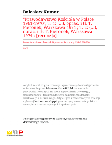 Bolesław Kumor "Prawodawstwo Kościoła w Polsce 1961-1970", T. 1: (...), oprac. i tł. T. Pieronek, Warszawa 1971 ; T. 2: (...), oprac. i tł. T. Pieronek, Warszawa 1974 : [recenzja] Prawo Kanoniczne : kwartalnik prawno-historyczny 19/1-2, 288-290 1976 ?88 R ecenzje [18] śnie w spólnota jest fo rm a ln ą zasadą p raw a kanonicznego i jej budow a n ie je st celem in sty tu cji kanonicznych. Jeszcze jed n a uw aga. K ościół-w spólnota je st znakiem dla św iata. Czy w obec tego m ożna m ów ić o K ościele jak o o w spólnocie zam kniętej, w spólnocie ja k b y dla siebie? K ościół to w spólnota w idzialna, w spól n o ta dla św iata. Ten m om ent w inien też być uw zględniony w k an o nistyce. Ks. R em igiusz So b a ń ski Praw odawstw o Kościoła w Polsce 1961—1970. T. 1. Dokumenty dotyczące Polski wydane przez Stolicę Apostolską, prymasa Polski i Konferencję episkopatu Polski. Oprać, i tłum . ks. T. Pieronek. Warszawa 1971 ss. 315; t. 2. U stawodawstwo diecezjalne. Z. 1 ss. 288; z. 2 ss. 296; z. 3 ss. 314; z. 4 ss. 302. Oprać, i tłum. ks. T. P i e r o n e k . Warszawa 1974 K iedy w 1906 r. ks. T adeusz T r z c i ń s k i w y d aw ał Z biór ustaw archidiecezji g n ieźnieńskiej i po znań skiej (Poznań ss. 520), pisał w ów czas m. in. w e w stępie, że „w ykładając praw o kościelne w sem inarium gnieźnieńskim rychło przyszedłem do p rzekonania, że szczególnie n ag lą cą potrzebą je st zapoznanie m łodzieży duchow nej z istn iejący m w d ie cezji praw em p a rty k u la rn y m ” (s. V). Ta potrzeba pedagogiczna zreali zow ana przez ks. T. T rzcińskiego m iała wówczas asp ek t praktyczny. D zięki bow iem jego Z biorow i u sta w duszpasterze obydw óch arch id ie cezji otrzym ali podręcznik p raw a diecezjalnego, a raczej duży w ybór jego tekstów , a dzisiaj h isto ry k m a pierw szorzędnej w artości źródło do poznania dziejów du szp asterstw a, życia religijnego, dem ografii h i storycznej, działalności społecznej i k u ltu ra ln ej itp. K ościoła k ato lic kiego na teren ie W ielkopolski w latach 1867—1905. Ta ta k bardzo cenna in ic ja ty w a ks. T. T rzcińskiego nie była now a, a n i pierw sza w diecezjach n a ziem iach polskich okresu niew oli n aro dow ej. N ajw cześniej bow iem podobny zbiór został w y drukow any dla diecezji chełm ińskiej pt. S a m m lu n g kirchelicher V erordnungen, Erlasse u nd D ekrete fü r die Diöcese C ulm (Pelplin 1872 ss. 433), a na po czątku X X stulecia zrobiono to rów nież w diecezji w rocław skiej na Ś ląsku, kiedy to w 1902 r. ukazały się w form ie książkow ej V ero rd nungen fü r das B isth u m s B reslau (W rocław ss. 672). Z diecezji zaboru rosyjskiego takiego zbioru nie otrzym ała żadna diecezja, jako że dopie ro po 1905 r. zaczęły się tu ukazyw ać organy urzędow e w poszczegól nych diecezjach. W poprzednim n ato m iast okresie rozporządzenia k o ścielne ogłaszali ordynariu sze za pośrednictw em pisanych k u ren d . W za borze austriackim , m im o że każda diecezja m iała p raw ie od początku X IX stulecia w łasny, d ru k o w an y organ urzędow y, n a osobny Z biór p rzepisów odnoszących się do Kościoła i duchow ieństw a zdobyła się [19] Recenzje 289 jedynie diecezja k rako w sk a, w k tó rej na zlecenie konsystorza b isk u piego .zbiór ta k i opracow ał ks. M ichał K o ł o d z i e j (K raków 1913 ss. 400). T ak bardzo szkoda, że ta cenna inicjaty w a nie znalazła naśladow ców w okresie m iędzyw ojennym . Piszącem u znany jest tylko Z biór ustaw archidiecezji gnieźn ieńskiej i po zna ńskiej (t. 1). P oznań 1934 ss. 750), zebrany i w ydany przez ks. S tan isław a B r o s s a . Do tych dobrych tra d y c ji naw iązał ostatnio ks. T adeusz P i e r o n ek, w y d ając P raw odaw stw o Kościoła w Polsce 1961—1970. P ierw szy tom om aw ianego w ydaw nictw a obejm uje „dokum enty dotyczące P olski w y dane przez Stolicę A postolską, p ry m asa P olski i K onferencję episko p atu P o lsk i”. Z ebrane przez au to ra do kum enty Stolicy A postolskiej w liczbie 33 nie były pub lik ow ane w A cta A postolicae Sedis. Dalszych 37 dokum entów pochodzi od p ry m asa Polski, oraz 6 z jego S ek reta ria tu , zaś 48 — od K onferencji episkopatu Polski. Są to dokum enty 0 ch a rak te rz e praw n ym , n o rm u jące spraw y k u ltu religijnego, duszpa ste rstw a, ale już dzisiaj chętnie do nich sięgnie rów nież h isto ry k K o ścioła, a znajdzie tu ciekaw e m a teria ły dotyczące zagadnienia odnow y 1 reform y k u ltu religijnego i du szp asterstw a w dobie recepcji II Soboru W atykańskiego w Polsce. N astępne 4 tom y (zeszyty) P raw odaw stw a Kościoła w Polsce 1961 — 1970 o b ejm u ją u staw o daw stw o diecezjalne, ale tylko tych diecezji k tó re w w yżej w ym ienionych la tac h w ydaw ały d ru k iem urzędow e organy diecezjalne. S tąd archidiecezje w B iałym stoku, Lubaczow ie, oraz diecezje w D rohiczynie i Łomży, a częściowo także i K ielce (1961— 1963) nie znalazły się w zbiorze, poniew aż n ie w ydaw ały w tym czasie w łas nych organów druko w an ych. Jed y n y m bow iem i w yłącznym źródłem om aw ianej p u b lik acji były te w łaśn ie organy urzędow e diecezjalne. D iecezje poszczególne zostały u ję te w układzie alfabetycznym , a liczba przytoczonych przez w ydaw cę dokum entów dla każdej z nich w ah a się od 10 (Lublin) do 54 (W arszaw a). D okum enty te, w y d aw an e dla poszczególnych diecezji przez Stolicę A postolską, p ry m asa Polski, lub te ż ordy nariusza m iejscow ego, dotyczą k u ltu religijnego, d u szp asterstw a, organizacji kościelnej, form acji in te le k tu aln ej i m o raln ej księży, organizacji i odbyw ania synodów diecezjalnych z załączeniem w pew nych w ypadkach ich sta tu tó w (W łocławek) itp. N ależy zauw ażyć, że P raw odaw stw o Kościoła w Polsce 1961— 1970 m a c h a ra k te r raczej prak ty czn y 