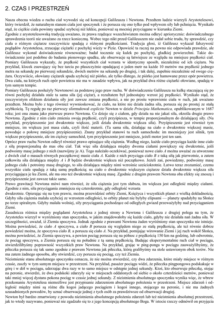 2. CZAS I PRZESTRZEŃ Nasza obecna wiedza o ruchu ciał wywodzi się od koncepcji Galileusza i Newtona. Przedtem ludzie wierzyli Arystotelesowi, który twierdził, że naturalnym stanem ciała jest spoczynek i że porusza się ono tylko pod wpływem siły lub pchnięcia. Wynikało stąd, że ciężkie ciała powinny spadać szybciej niż lekkie, ponieważ są mocniej przyciągane w kierunku Ziemi. Zgodnie z arystotelesowską tradycją uważano, że prawa rządzące wszechświatem można odkryć apriorycznie: doświadczalnego sprawdzenia teorii nie uważano za rzecz konieczną. Wobec tego nikt przed Galileuszem nie zadał sobie trudu, by sprawdzić, czy ciała o różnym ciężarze rzeczywiście spadają z różnymi prędkościami. Tradycja głosi, iż Galileusz wykazał fałszywość poglądów Arystotelesa, zrzucając ciężarki z pochyłej wieży w Pizie. Opowieść ta raczej na pewno nie odpowiada prawdzie, ale Galileusz wykonał doświadczenie równoważne; badał toczenie się kulek po pochyłej, gładkiej powierzchni. Takie doświadczenie jest podobne do badania pionowego spadku, ale obserwacje są łatwiejsze ze względu na mniejsze prędkości ciał. Pomiary Galileusza wykazały, że prędkość wszystkich ciał wzrasta w identyczny sposób, niezależnie od ich ciężaru. Na przykład, klocek zsuwający się bez tarcia po płaszczyźnie opadającej o jeden metr na każde 10 metrów ma prędkość jednego metra na sekundę po pierwszej sekundzie, dwóch metrów na sekundę po drugiej, i tak dalej, zupełnie niezależnie od swego ciężaru. Oczywiście, ołowiany ciężarek spada szybciej niż piórko, ale tylko dlatego, że piórko jest hamowane przez opór powietrza. Dwa ciała, na których ruch opór powietrza nie ma w zasadzie wpływu, jak na przykład dwa różne ciężarki ołowiane, spadają w tym samym tempie. Pomiary Galileusza posłużyły Newtonowi za podstawę jego praw ruchu. W doświadczeniu Galileusza na kulkę staczającą się po równi pochyłej działała stale ta sama siła (jej ciężar), a rezultatem był jednostajny wzrost jej prędkości. Wynikało stąd, że rzeczywistym efektem działania siły jest zawsze zmiana prędkości, a nie po prostu wprawienie ciała w ruch, jak uważano przedtem. Można było z tego również wywnioskować, że ciało, na które nie działa żadna siła, porusza się po prostej ze stałą szybkością. Tę regułę po raz pierwszy sformułował explicite Newton w dziele Principia Mathematica, opublikowanym w 1687 roku; jest ona znana jako pierwsze prawo Newtona. Co dzieje się z ciałem, gdy działa na nie jakaś siła, określa drugie prawo Newtona. Zgodnie z nim ciało zmienia swoją prędkość, czyli przyśpiesza, w tempie proporcjonalnym do działającej siły. (Na przykład, przyśpieszenie jest dwukrotnie większe, jeśli działa dwukrotnie większa siła). Przyśpieszenie jest również tym mniejsze, im większa jest masa ciała, czyli ilość materii. (Ta sama siła, działając na ciało o dwukrotnie większej masie, powoduje o połowę mniejsze przyśpieszenie). Znany przykład stanowi tu ruch samochodu: im mocniejszy jest silnik, tym większe przyśpieszenie, ale im cięższy samochód, tym przyśpieszenie jest mniejsze, jeżeli motor jest ten sam. Oprócz praw ruchu Newton odkrył również prawo opisujące siłę ciążenia. Według niego, każde ciało przyciąga każde inne ciało z siłą proporcjonalną do mas obu ciał. Tak więc siła działająca między dwoma ciałami powiększy się dwukrotnie, jeśli podwoimy masę jednego z nich (nazwijmy je A). Tego należało oczekiwać, ponieważ nowe ciało A można uważać za utworzone z dwóch ciał o masach równych początkowej masie ciała A. Każde z nich przyciąga ciało B z taką siłą jak pierwotnie, a zatem całkowita siła działająca między A i B będzie dwukrotnie większa niż początkowo. Jeżeli zaś, powiedzmy, podwoimy masę jednego ciała i potroimy masę drugiego, to siła działająca między nimi wzrośnie sześciokrotnie. Łatwo teraz zrozumieć, czemu wszystkie ciała spadają z taką samą prędkością; na ciało o dwukrotnie większym ciężarze działa dwukrotnie większa siła przyciągająca je ku Ziemi, ale ma ono też dwukrotnie większą masę. Zgodnie z drugim prawem Newtona oba efekty się znoszą i przyśpieszenie jest zawsze takie samo. Prawo grawitacji Newtona mówi nam również, że siła ciążenia jest tym słabsza, im większa jest odległość między ciałami. Zgodnie z nim, siła przyciągania zmniejsza się czterokrotnie, gdy odległość wzrasta dwukrotnie. Opierając się na tym prawie, można przewidzieć orbity Ziemi, Księżyca i wszystkich planet z wielką dokładnością. Gdyby siła ciążenia malała szybciej ze wzrostem odległości, to orbity planet nie byłyby elipsami — planety spadałyby na Słońce po torze spiralnym. Gdyby malała wolniej, siły przyciągania pochodzące od odległych gwiazd przeważyłyby nad przyciąganiem Ziemi. Zasadnicza różnica między poglądami Arystotelesa z jednej strony a Newtona i Galileusza z drugiej polega na tym, że Arystoteles wierzył w wyróżniony stan spoczynku, w jakim znajdowałoby się każde ciało, gdyby nie działała nań żadna siła. W szczególności, uważał, iż Ziemia spoczywa. Jednak zgodnie z prawami Newtona żaden wyróżniony stan spoczynku nie istnieje. Można powiedzieć, że ciało A spoczywa, a ciało B porusza się względem niego ze stałą prędkością, ale też równie dobrze powiedzieć można, że spoczywa ciało B, a porusza się ciało A. Na przykład, pomijając wirowanie Ziemi i jej ruch wokół Słońca, można powiedzieć, że Ziemia spoczywa, a pewien pociąg porusza się na północ z prędkością 150 km na godzinę, lub odwrotnie, że pociąg spoczywa, a Ziemia porusza się na południe z tą samą prędkością. Badając eksperymentalnie ruch ciał w pociągu, stwierdzilibyśmy poprawność wszystkich praw Newtona. Na pr
