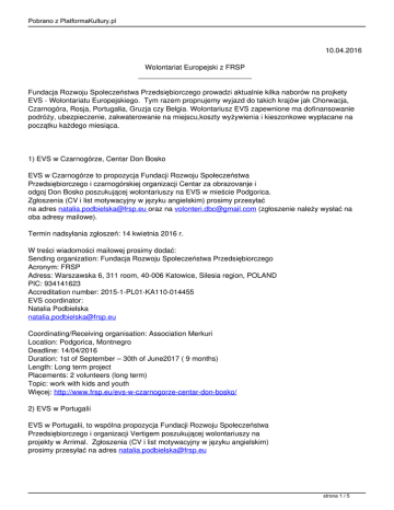 Pobrano z PlatformaKultury.pl 10.04.2016 Wolontariat Europejski z FRSP ____________________________ Fundacja Rozwoju Społeczeństwa Przedsiębiorczego prowadzi aktualnie kilka naborów na projkety EVS - Wolontariatu Europejskiego. Tym razem propnujemy wyjazd do takich krajów jak Chorwacja, Czarnogóra, Rosja, Portugalia, Gruzja czy Belgia. Wolontariusz EVS zapewnione ma dofinansowanie podróży, ubezpieczenie, zakwaterowanie na miejscu,koszty wyżywienia i kieszonkowe wypłacane na początku każdego miesiąca. 1) EVS w Czarnogórze, Centar Don Bosko EVS w Czarnogórze to propozycja Fundacji Rozwoju Społeczeństwa Przedsiębiorczego i czarnogórskiej organizacji Centar za obrazovanje i odgoj Don Bosko poszukującej wolontariuszy na EVS w mieście Podgorica. Zgłoszenia (CV i list motywacyjny w języku angielskim) prosimy przesyłać na adres [email protected] oraz na [email protected] (zgłoszenie należy wysłać na oba adresy mailowe). Termin nadsyłania zgłoszeń: 14 kwietnia 2016 r. W treści wiadomości mailowej prosimy dodać: Sending organization: Fundacja Rozwoju Społeczeństwa Przedsiębiorczego Acronym: FRSP Adress: Warszawska 6, 311 room, 40-006 Katowice, Silesia region, POLAND PIC: 934141623 Accreditation number: 2015-1-PL01-KA110-014455 EVS coordinator: Natalia Podbielska [email protected] Coordinating/Receiving organisation: Association Merkuri Location: Podgorica, Montnegro Deadline: 14/04/2016 Duration: 1st of September – 30th of June2017 ( 9 months) Length: Long term project Placements: 2 volunteers (long term) Topic: work with kids and youth Więcej: http://www.frsp.eu/evs-w-czarnogorze-centar-don-bosko/ 2) EVS w Portugalii EVS w Portugalii, to wspólna propozycja Fundacji Rozwoju Społeczeństwa Przedsiębiorczego i organizacji Vertigem poszukującej wolontariuszy na projekty w Arrimal. Zgłoszenia (CV i list motywacyjny w języku angielskim) prosimy przesyłać na adres [email protected] strona 1 / 5 Pobrano z PlatformaKultury.pl Termin nadsyłania zgłoszeń: 10 kwietnia 2016 Organizacja Wysyłająca/Koordynująca: Fundacja Rozwoju Społeczeństwa Przedsiębiorczego Organizacja Przyjmująca: Vertigem-Associação Promoção Património Miejsce aktywności: Arrimal, Portugal Termin nadsyłania zgłoszeń: 10/04/2016 Czas trwania aktywności wolontariuszy: 07.05.2016 do 06.11.2016 Wolne miejsca: 1 długoterminowy wolontariusz ( 2 osoba jest już na miejscu) Tytuł projektu: Eco-Young-Inclusion Numer projektu: 2015-2-PL01-KA105-017323 (projekt został zaakceptowany i uzyskał dofinansowanie) Proponujemy wam udział w długoterminowym (6-miesięcznym) projekcie Wolontariatu Europejskiego w urokliwym miasteczku Arrimal w Portugalii, w organizacji pozarządowej Vertigem. Projket „Eco-Young-Inclusion” zakłada opracowanie kilkanaście działań w sferze międzykulturowej które poza multidyscyplinarną rolą (podejście do zasobów naturalnych w dzisiejszym świecie czy ekologiczne nawyki i i dobre praktyki) ustanowią wspólną oś w tematach dotyczących ochrony środowiska, tolerancji i wzrostu jakości życia. Z drugiej strony projekt ma szereg działań, takich jak świadomość ekologiczna i działania z nią związane, dobra naturalne, pakowanie i ponowne wykorzystywanie ubrań itp. których głównym celem jest połączenie wolontariusza z lokalną społecznością we wspólnym działaniu, co jest niezbędna dla powodzenia projektu. Dzięki aktywności wolontariuszy pragniemy propagować zdrowy tryb życia, integrację społeczną i aktywne uczestnictwo. Wolontariusze EVS będą działać w Natural Park of Serra de Aire e Candeeiros (PNSAC).Ich zadania związane będą zarówno z jego utrzymaniem (np. grabienie liści, zalesianie itp), oprowadzaniem wycieczek szkolnych i prowadzeniem edukacji ekologicznej jak również prowadzeniem badań dotyczących żyjących na jego terenie gatunków zwierząt i roślin. Więcej: http://www.frsp.eu/evs-w-portugalii-vertigem/ 3) EVS w Rosji EVS w Rosji to propozycja Fundacji Rozwoju Społeczeństwa Przedsiębiorczego i rosyjskiej organizacji Association of Indigenous Peoples of the North of Khabarovsk region poszukującej wolontariuszy na EVS w Khabarovsk. Zgłoszenia (CV i list motywacyjny w języku angielskim) prosimy przesyłać na adres [email protected] oraz na [email protected] (zgłoszenie należy wysłać na oba adresy mailowe). Termin nadsyłania zgłoszeń: 10 kwietnia 2016 r. W treści wiadomości mailowej prosimy dodać: Sending organization: Fundacja Rozwoju Społeczeństwa Przedsiębiorczego Acronym: FRSP Adress: Warszawska 6, 311 room, 40-006 Katowice, Silesia region, POLAND PIC: 934141623 Accreditation number: 2015-1-PL01-KA110-014455 EVS coordinator: Natalia Podbielska [email protected] strona 2 / 5 Pobrano z PlatformaKultury.pl Porpozycja projektu w odległym zakątku Rosji nad rzeką Amur, blisko granicy z Chinami w organizacji Association of Indigenous Peoples. Do zadań wolontariusza EVS należeć będzie współpraca z lokalną młodzieżą i dzieciakami w ramach projektów warsztatowych, szkoleniowych. Wolontariusz będzie też odpowiedzialny za organizację projektów wymian młodzieżowych, workcampów od ich napisania z pomocą koordynatora po całą realizację. Coordinating/Receiving organisation: Association of Indigenous Peoples of the North of Khabarovsk region Location: Khabarovsk, Russian Federation Deadline: 10/04/2016 Duration: 6-12 months (since October 2016) Length: Long term project Placements: 5 volunteers in total Więcej: http://www.frsp.eu/evs-w-rosji-association-of-indigenous-peoples/ 4) EVS w Belgii EVS w Belgii to propozycja Fundacji Rozwoju Społeczeństwa Przedsiębiorczego i belgijskiej organizacji Domaine de Mozet poszukującej wolontariuszy na EVS w Mozet (Namur). Zgłoszenia (CV i list motywacyjny w języku angielskim) prosimy przesyłać na adres [email protected] oraz na [email protected] (zgłoszenie należy wysłać na oba adresy mailowe). W tytule wiadomości pros