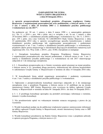 ZARZĄDZENIE NR 23/2016 WÓJTA GMINY BRĄSZEWICE z dnia 03 listopada 2016 r. w sprawie przeprowadzenia konsultacji projektu „Programu współpracy Gminy Brąszewice z organizacjami pozarządowymi oraz podmiotami, o których mowa w art. 3 ust. 3 ustawy z dnia 24 kwietnia 2003 r. o działalności pożytku publicznego i wolontariacie na rok 2017”. Na podstawie art. 30 ust. 1 ustawy z dnia 8 marca 1990 r. o samorządzie gminnym (t.j.: Dz. U. z 2016 r. poz. 446 z późn. zm.) w związku z art. 5a ust. 1 ustawy z dnia 24 kwietnia 2003 r. o działalności pożytku publicznego i wolontariacie (t.j.: Dz. U. z 2016 r. poz. 239 z późn. zm.) oraz Uchwały Nr LIII/208/2014 Rady Gminy Brąszewice z dnia 23 października 2014 roku w sprawie szczegółowego sposobu konsultowania z radami działalności pożytku publicznego lub organizacjami pozarządowymi i podmiotami wymienionymi w art. 3 ust. 3 ustawy o działalności pożytku publicznego i o wolontariacie, projektów aktów prawa miejscowego w dziedzinach dotyczących działalności statutowej tych organizacji (Dz. Urz. Woj. Łódź. z 2014 r., poz. 4140). Zarządzam co następuje: § 1. Zarządzam konsultacje projektu Programu Współpracy Gminy Brąszewice z organizacjami pozarządowymi oraz innymi podmiotami, o których mowa w art. 3 ust. 3 ustawy o działalności pożytku publicznego i o wolontariacie na rok 2017 stanowiącego załącznik nr 1 do niniejszego zarządzenia. § 2. 1. Konsultacje przeprowadza się w formie wyrażenia opinii pisemnej na temat projektu, o którym mowa w §1, przesłanej drogą pocztową, elektroniczną lub złożoną bezpośrednio w sekretariacie Urzędu Gminy w Brąszewicach w terminie do dnia 14 listopada 2016 roku. 2. W konsultacjach biorą udział organizacje pozarządowe i podmioty wymienione w art. 3 ust. 3 ustawy o działalności pożytku publicznego i o wolontariacie. 3. Ogłoszenie o przeprowadzeniu konsultacji stanowiące załącznik nr 2 do mniejszego zarządzenia wraz z projektem Programu, o którym mowa w §1 publikuje się na stronie internetowej Gminy, BIP Gminy Brąszewice oraz wywiesza na tablicy ogłoszeń Urzędu Gminy w Brąszewicach w terminie od dnia 04 listopada 2016 r. do dnia 14 listopada 2016 r. § 3. 1. Z przebiegu konsultacji sporządza się protokół zawierający informacje o terminie, temacie i wyniku konsultacji. 2. Nie przedstawienie opinii we wskazanym terminie oznacza rezygnację z prawa do jej wyrażenia. 3. Wyniki konsultacji podaje się do publicznej wiadomości poprzez zamieszczenie informacji na tablicy ogłoszeń Urzędu Gminy w Brąszewicach, stronie internetowej Gminy oraz w BIP Gminy Brąszewice. 4. Wyniki konsultacji przedstawia się Radzie Gminy Brąszewice wraz z projektem uchwały w sprawie przyjęcia Programu, o którym mowa w §1. § 4. Wykonanie zarządzenia powierza się Kierownikowi Referatu Organizacyjnego, Spraw Społecznych i Obywatelskich § 5. Zarządzenie podlega ogłoszeniu i wychodzi w życie z dniem podjęcia. WÓJT GMINY Karol Misiak Załącznik Nr 1 do Zarządzenia Nr 23/2016 Wójta Gminy Brąszewice z dnia 03listopada 2016 r. Projekt Program współpracy Gminy Brąszewice z organizacjami pozarządowymi oraz podmiotami, o których mowa w art. 3 ust.3 ustawy o działalności pożytku publicznego i o wolontariacie w roku 2017 Postanowienia ogólne § 1.1 Podstawą współpracy Gminy Brąszewice z organizacjami pozarządowymi oraz podmiotami, o których mowa w art. 3 ust. 3 ustawy o działalności pożytku publicznego i o wolontariacie jest roczny Program współpracy na 2017 r. oraz ustawa z dnia 24 kwietnia 2003 r. o działalności pożytku publicznego i o wolontariacie (t.j.: Dz. U. z 2016 r. poz. 239 z późn. zm.) mająca zastosowanie w sprawach nie uregulowanych programem rocznym. 2. Ilekroć w programie jest mowa o: 1) „ustawie” - rozumie się przez to ustawę z dnia 24 kwietnia 2003 r. o działalności pożytku publicznego i o wolontariacie (t.j.: Dz. U. z 2016 r. poz. 239 z późn. zm.); 2) „organizacjach” - rozumie się przez to organizacje pozarządowe oraz podmioty o których mowa w art.3. ust.3 ustawy; 3) programie – należy przez to rozumieć „Program współpracy Gminy Brąszewice z organizacjami pozarządowymi oraz podmiotami, o których mowa w art. 3 ust. 3 ustawy o działalność pożytku publicznego w roku 2016”; 4) „dotacji” - rozumie się przez to dotację w rozumieniu art. 221 ust.1 ustawy z dnia 27 sierpnia 2009 roku o finansach publicznych (t.j.: Dz. U. z 2013 r. poz. 885 z późn. zm.); 5) „konkursie” - rozumie się przez to otwarty konkurs ofert, o którym mowa w art. 11 ust. 2 i w art. 13 ustawy; 6) Wójcie – rozumie się Wójta Gminy Brąszewice. Cele główne i cele szczegółowe § 2.1. Głównym celem Programu jest współpraca samorządu gminnego z organizacjami pozarządowymi nie zaliczanymi do sektora finansów publicznych i nie działającymi w celu osiągnięcia zysku, a w szczególności fundacjami i stowarzyszeniami prowadzącymi działalność na terenie Gminy Brąszewice, na rzecz jej mieszkańców. 2. Szczegółowym celem Programu jest: 1) prowadzenie działalności promocyjnej i informacyjnej dotyczącej wspólnych działań; 2) tworzenie wspólnych projektów; 3) pomoc merytoryczna dla projektów realizowanych przez organizacje pozarządowe przyczyniające się do poprawy życia mieszkańców Gminy Brąszewice i poprzez organizację szkoleń, informacji i konsultacji dla organizacji pozarządowych; 4) promowanie organizacji pozarządowych; 5) współpraca przy realizacji akcji charytatywnych. Zasady współpracy § 3. Współpraca władz Gminy Brąszewice z organizacjami pozarządowymi odbywać się będzie na zasadzie pomocniczości, suwerenności stron, partnerstwa, efektywności, uczciwej konkurencji i jawności. Zakres współpracy § 4. Współpraca Gminy Brąszewice z organizacjami pozarządowymi dotyczy realizacji zadań publicznych określonych w art. 4 ustawy o działalności po