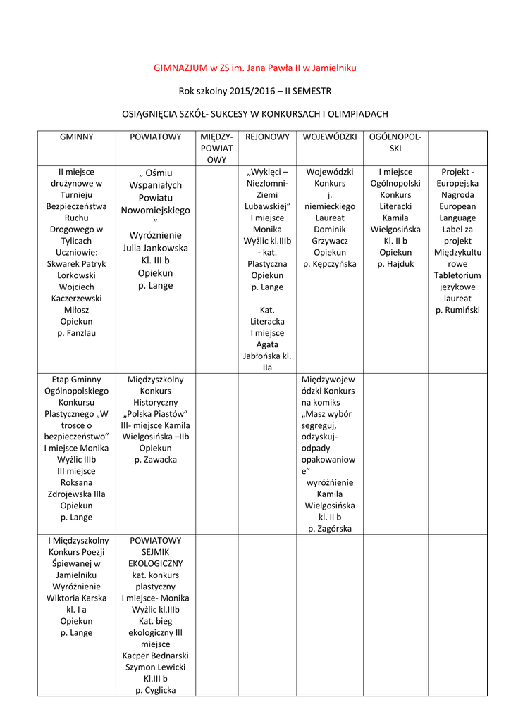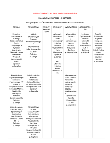 GIMNAZJUM w ZS im. Jana Pawła II w Jamielniku Rok szkolny 2015/2016 – II SEMESTR OSIĄGNIĘCIA SZKÓŁ- SUKCESY W KONKURSACH I OLIMPIADACH GMINNY POWIATOWY II miejsce drużynowe w Turnieju Bezpieczeństwa Ruchu Drogowego w Tylicach Uczniowie: Skwarek Patryk Lorkowski Wojciech Kaczerzewski Miłosz Opiekun p. Fanzlau „ Ośmiu Wspaniałych Powiatu Nowomiejskiego ” Wyróżnienie Julia Jankowska Kl. III b Opiekun p. Lange Etap Gminny Ogólnopolskiego Konkursu Plastycznego „W trosce o bezpieczeństwo” I miejsce Monika Wyżlic IIIb III miejsce Roksana Zdrojewska IIIa Opiekun p. Lange Międzyszkolny Konkurs Historyczny „Polska Piastów” III- miejsce Kamila Wielgosińska –IIb Opiekun p. Zawacka I Międzyszkolny Konkurs Poezji Śpiewanej w Jamielniku Wyróżnienie Wiktoria Karska kl. I a Opiekun p. Lange POWIATOWY SEJMIK EKOLOGICZNY kat. konkurs plastyczny I miejsce- Monika Wyżlic kl.IIIb Kat. bieg ekologiczny III miejsce Kacper Bednarski Szymon Lewicki Kl.III b p. Cyglicka MIĘDZYPOWIAT OWY REJONOWY WOJEWÓDZKI OGÓLNOPOLSKI „Wyklęci – NiezłomniZiemi Lubawskiej” I miejsce Monika Wyżlic kl.IIIb - kat. Plastyczna Opiekun p. Lange Wojewódzki Konkurs j. niemieckiego Laureat Dominik Grzywacz Opiekun p. Kępczyńska I miejsce Ogólnopolski Konkurs Literacki Kamila Wielgosińska Kl. II b Opiekun p. Hajduk Kat. Literacka I miejsce Agata Jabłońska kl. IIa Międzywojew ódzki Konkurs na komiks „Masz wybór segreguj, odzyskujodpady opakowaniow e” wyróżńienie Kamila Wielgosińska kl. II b p. Zagórska Projekt Europejska Nagroda European Language Label za projekt Międzykultu rowe Tabletorium językowe laureat p. Rumiński GMINNY POWIATOWY Gminny Konkurs Ortograficzny I miejsce Julia Madoń kl. III a opiekun p. Hajduk Konkurs Jestem Mistrzem II miejsce Julia Madoń Jakub Gurzyński z klasy IIb Patryk Skwarek Agata Jabłońska z klasy IIa Opiekun p. Hinc Konkurs „Nie daj się dopalaczom” II miejsce Żaneta Malczuk Wojciech Lorkowski z kl.IIa Kamila Wielgosińska Wiktoria Łukwińska z kl.IIb Opiekun p. Hinc „Marzenia i pasje oczami osoby niepełnosprawnej” -wyróżnienie Jakub Kuca kl.Ib Opiekun p. Hinc „Moja pasja kluczem do sukcesu” III miejsce Kamila Wielgosińska kl.IIb Opiekun p. Hinc Dzień Godności Osób Niepełnosprawnych II miejsce Jolanta Kotłowska I miejsce Dominik Wierzbicki Opiekun p. Hinc MIĘDZYPOWIATOWY REJONOWY WOJEWÓDZKI Powiatowy Konkurs Recytatorki „Spotkanie z poezją” I miejsce Eryk Kurańda – kl. Ib ( uzyskanie nominacji do udziału w Rejonowym Konkursie Recytatorskim) Opiekun p. Hajduk Etap Powiatowy Ogólnopolskiego Konkursu Plastycznego „ W trosce o nasze bezpieczeństwo” II miejsce Monika Wyżlic kl. III b Opiekun p. Lange 1. Tabletorium Językowe – Agata Lubnau, Julia Otremba, Julia Madoń, Łukasz Luba, Klaudia Gaudecka – p. Łukasz Rumiński 2. Napisanie projektu na zajęcia sportowe i zakup sprzętu sportowego ogłoszonego przez Ministerstwo Sportu i Turystyki pn. „KLUB”. Na kwotę 15000zł. Projekt pozytywnie rozpatrzono – p. Grażyna Zagórska 3. Rządowy program wspomagania w latach 2015-2018 organów prowadzących szkoły w zapewnieniu bezpiecznych warunków nauki wychowania i opieki w szkołach „Bezpieczna +”- 15000 zł – p. Danuta Cyglicka, P. Beata Hajduk, P. Izabela Hinc 4. Projekt wyposażenia stołówki szkolnej w Zespole Szkół im. Jana Pawła II w Jamielniku – kwota 8932 zł – P. Żuralska 5. Projekt wyposażenia gabinetu profilaktyki zdrowotnej w Zespole Szkół im. Jana Pawła II w Jamielniku – kwota 8383,37 zł. 6. Książka moich marzeń – kwota 1625 zł. 7. Ogólnopolski program „Mały Mistrz” kl. I SP organizowany przez Ministerstwo Sportu i Turystyki – p. Renata Bojarska GIMNAZJUM w ZS im. Jana Pawła II w Jamielniku Rok szkolny 2015/2016- II SEMESTR OSIĄGNIĘCIA SKÓŁ- SUKCESY SPORTOWE GMINNY POWIATOWY Turniej Coca Cola Cup-piłka nożna I miejsce Chłopcy kl. I-III p. Smukała MIĘDZYPOWIATOWY Otwarty Turniej Piłki Nożnej miejscowości wiejskich III miejsce I miejsce Adam Kaliński – wyciskanie sztangi leżąc z wynikiem 97,5 kg kl. III a p. Smukała II miejsce Turniej Piłki Nożnej dziewcząt kl. I-III p. Zagórska II miejsce Turniej Piłki Nożnej Coca Cola Cup dziewcząt kl. I-III p. Zagórska II miejsce Turniej Piłki Siatkowej Kurowski Patryk Lewicki Szymon z kl. IIIb p. Smukała V miejsce na Gali Sportowej na 8 szkół (kl. I-III) REJONOWY Turniej Coca Cola Cup – piłka nożna III miejsce chłopcy kl. I-III p. Smukała Turniej Piłki Nożnej Coca Cola Cup dziewcząt IV miejsce kl. I-III p. Zagórska WOJEWÓDZKI OGÓLNOPOLSKI Ogólnopolski Turniej Koszykówki 3x3 „Korona 3x3” Żuchowski Grzegorz Jarmużewski Patryk Krezymon Dominik Mędrzycki Kacper III miejsce kl. IIIa p. Smukała