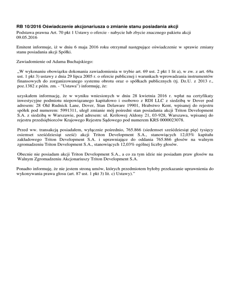 RB 10/2016 Oświadczenie akcjonariusza o zmianie stanu posiadania akcji Podstawa prawna Art. 70 pkt 1 Ustawy o ofercie - nabycie lub zbycie znacznego pakietu akcji 09.05.2016 Emitent informuje, iż w dniu 6 maja 2016 roku otrzymał następujące oświadczenie w sprawie zmiany stanu posiadania akcji Spółki. Zawiadomienie od Adama Buchajskiego: „W wykonaniu obowiązku dokonania zawiadomienia w trybie art. 69 ust. 2 pkt 1 lit a), w zw. z art. 69a ust. 1 pkt 3) ustawy z dnia 29 lipca 2005 r. o ofercie publicznej i warunkach wprowadzania instrumentów finansowych do zorganizowanego systemu obrotu oraz o spółkach publicznych (tj. Dz.U. z 2013 r., poz.1382 z późn. zm. - "Ustawa”) informuję, że: uzyskałem informację, że w wyniku wniesionych w dniu 28 kwietnia 2016 r. wpłat na certyfikaty inwestycyjne podmiotu niepowiązanego kapitałowo i osobowo z RDI LLC z siedzibą w Dover pod adresem: 28 Old Rudnick Lane, Dover, Stan Delaware 19901, Hrabstwo Kent, wpisanej do rejestru spółek pod numerem: 5991311, uległ zmianie mój pośredni stan posiadania akcji Triton Development S.A. z siedzibą w Warszawie, pod adresem: ul. Królowej Aldony 21, 03-928, Warszawa, wpisanej do rejestru przedsiębiorców Krajowego Rejestru Sądowego pod numerem KRS 0000023078. Przed ww. transakcją posiadałem, wyłącznie pośrednio, 765.866 (siedemset sześćdziesiąt pięć tysięcy osiemset sześćdziesiąt sześć) akcji Triton Development S.A., stanowiących 12,03% kapitału zakładowego Triton Development S.A. i uprawniające do oddania 765.866 głosów na walnym zgromadzeniu Triton Development S.A., stanowiących 12,03% ogólnej liczby głosów. Obecnie nie posiadam akcji Triton Development S.A., a co za tym idzie nie posiadam praw głosów na Walnym Zgromadzeniu Akcjonariuszy Triton Development S.A. Ponadto informuję, że nie jestem stroną umów, których przedmiotem byłoby przekazanie uprawnienia do wykonywania prawa głosu (art. 87 ust. 1 pkt 3) lit. c) Ustawy).”