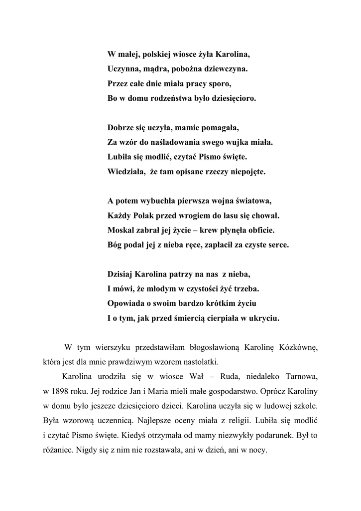W małej, polskiej wiosce żyła Karolina, Uczynna, mądra, pobożna dziewczyna. Przez całe dnie miała pracy sporo, Bo w domu rodzeństwa było dziesięcioro. Dobrze się uczyła, mamie pomagała, Za wzór do naśladowania swego wujka miała. Lubiła się modlić, czytać Pismo święte. Wiedziała, że tam opisane rzeczy niepojęte. A potem wybuchła pierwsza wojna światowa, Każdy Polak przed wrogiem do lasu się chował. Moskal zabrał jej życie – krew płynęła obficie. Bóg podał jej z nieba ręce, zapłacił za czyste serce. Dzisiaj Karolina patrzy na nas z nieba, I mówi, że młodym w czystości żyć trzeba. Opowiada o swoim bardzo krótkim życiu I o tym, jak przed śmiercią cierpiała w ukryciu. W tym wierszyku przedstawiłam błogosławioną Karolinę Kózkównę, która jest dla mnie prawdziwym wzorem nastolatki. Karolina urodziła się w wiosce Wał – Ruda, niedaleko Tarnowa, w 1898 roku. Jej rodzice Jan i Maria mieli małe gospodarstwo. Oprócz Karoliny w domu było jeszcze dziesięcioro dzieci. Karolina uczyła się w ludowej szkole. Była wzorową uczennicą. Najlepsze oceny miała z religii. Lubiła się modlić i czytać Pismo święte. Kiedyś otrzymała od mamy niezwykły podarunek. Był to różaniec. Nigdy się z nim nie rozstawała, ani w dzień, ani w nocy. Kiedy rodzice pracowali w polu, ona opiekowała się młodszym rodzeństwem. Była dla sióstr i braci, jak prawdziwa mama. Pomagała im, uczyła ich modlitw, śpiewała religijne piosenki, czytała opowiadania biblijne. Codziennie chodzili na Mszę św. Ich rodzinny dom był podobny do kościoła. Sąsiedzi przychodzili do domu Karoliny, aby się wspólnie modlić, śpiewać Godzinki, Gorzkie Żale. Przed Świętami Bożego Narodzenia wszyscy uczyli się śpiewać kolędy. Karolina bardzo lubiła swojego wujka. On miał na imię Franciszek Borzęcki. Wujek pracował na świetlicy. Karolina mu pomagała. Była dobra opiekunką. Może Karolina zostałaby nauczycielką, ale jej marzenia przerwała straszna wojna. Pewnego dnia do jej domu wkroczył obcy żołnierz. Rodziców nie było w domu. Ten żołnierz wyciągnął ją z domu do pobliskiego lasu. Karolina prosiła o pomoc, ale nikt tego nie słyszał. Broniła się, ale on był silniejszy i ją zabił. To się zdarzyło 18 listopada 1914 roku. Karolina miała wtedy siedemnaście lat. Dopiero po kilku dniach znaleziono jej ciało w lesie i zorganizowano pogrzeb. Wszyscy mieszkańcy wioski byli na jej pogrzebie. Nasz Ojciec Święty Jan Paweł II ogłosił, że Karolina jest błogosławiona. Sam papież tak powiedział: „Święci są po to, ażeby świadczyć o wielkiej godności człowieka.” Dzisiaj błogosławiona Karolina Kózkówna jest patronką Katolickiego Stowarzyszenia Młodzieży i Ruchu Czystych Serc. Dzisiaj takich dziewczynek, podobnych do Karoliny, jest mało. Moje koleżanki wolą komputer zamiast różańca. W domu nie mamy czasu na czytanie Biblii. Dobrze, że w szkole chodzimy na koło biblijne, to czytamy Pismo św. Na kółku dowiedzieliśmy się również o Karolinie i jej krótkim życiu. Moje koleżanki i koledzy malowali jej portret, a ja napisałam wierszyk o jej krótkim, świętym życiu. Błogosławiona Karolino módl się za nami, żeby nie przytrafiły się nam w życiu złe przygody, takie jak Tobie. Anna Oleszek kl. V Zespół Szkół w Goraju