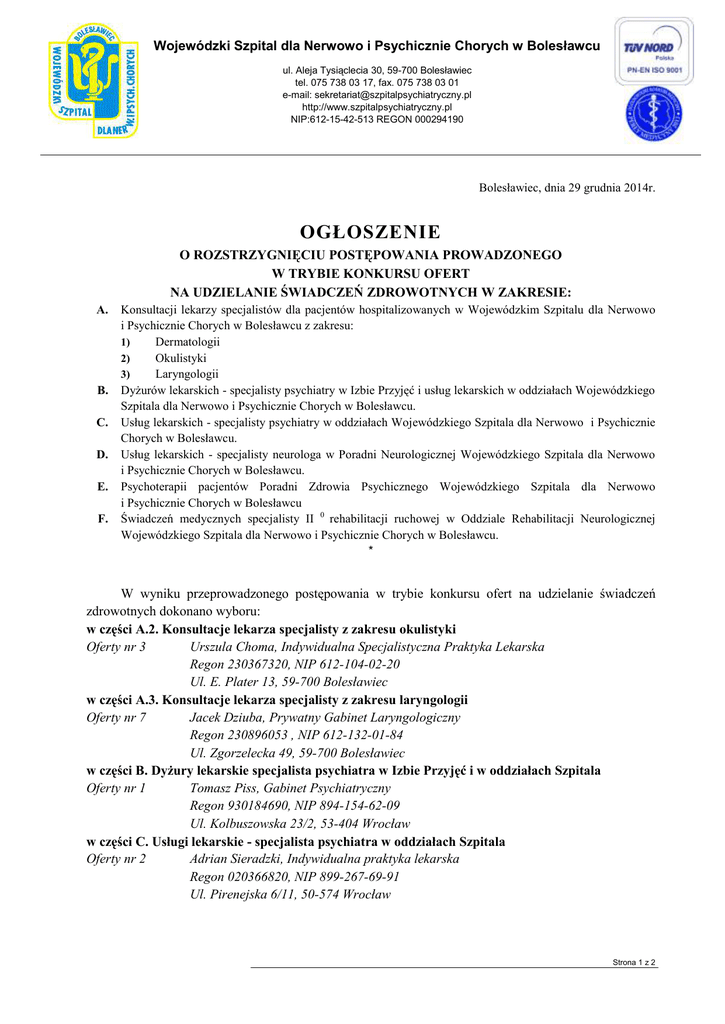 Wojewódzki Szpital dla Nerwowo i Psychicznie Chorych w Bolesławcu ul. Aleja Tysiąclecia 30, 59-700 Bolesławiec tel. 075 738 03 17, fax. 075 738 03 01 e-mail: [email protected] http://www.szpitalpsychiatryczny.pl NIP:612-15-42-513 REGON 000294190 Bolesławiec, dnia 29 grudnia 2014r. OGŁOSZENIE O ROZSTRZYGNIĘCIU POSTĘPOWANIA PROWADZONEGO W TRYBIE KONKURSU OFERT NA UDZIELANIE ŚWIADCZEŃ ZDROWOTNYCH W ZAKRESIE: A. B. C. D. E. F. Konsultacji lekarzy specjalistów dla pacjentów hospitalizowanych w Wojewódzkim Szpitalu dla Nerwowo i Psychicznie Chorych w Bolesławcu z zakresu: 1) Dermatologii 2) Okulistyki 3) Laryngologii Dyżurów lekarskich - specjalisty psychiatry w Izbie Przyjęć i usług lekarskich w oddziałach Wojewódzkiego Szpitala dla Nerwowo i Psychicznie Chorych w Bolesławcu. Usług lekarskich - specjalisty psychiatry w oddziałach Wojewódzkiego Szpitala dla Nerwowo i Psychicznie Chorych w Bolesławcu. Usług lekarskich - specjalisty neurologa w Poradni Neurologicznej Wojewódzkiego Szpitala dla Nerwowo i Psychicznie Chorych w Bolesławcu. Psychoterapii pacjentów Poradni Zdrowia Psychicznego Wojewódzkiego Szpitala dla Nerwowo i Psychicznie Chorych w Bolesławcu Świadczeń medycznych specjalisty II 0 rehabilitacji ruchowej w Oddziale Rehabilitacji Neurologicznej Wojewódzkiego Szpitala dla Nerwowo i Psychicznie Chorych w Bolesławcu. * W wyniku przeprowadzonego postępowania w trybie konkursu ofert na udzielanie świadczeń zdrowotnych dokonano wyboru: w części A.2. Konsultacje lekarza specjalisty z zakresu okulistyki Oferty nr 3 Urszula Choma, Indywidualna Specjalistyczna Praktyka Lekarska Regon 230367320, NIP 612-104-02-20 Ul. E. Plater 13, 59-700 Bolesławiec w części A.3. Konsultacje lekarza specjalisty z zakresu laryngologii Oferty nr 7 Jacek Dziuba, Prywatny Gabinet Laryngologiczny Regon 230896053 , NIP 612-132-01-84 Ul. Zgorzelecka 49, 59-700 Bolesławiec w części B. Dyżury lekarskie specjalista psychiatra w Izbie Przyjęć i w oddziałach Szpitala Oferty nr 1 Tomasz Piss, Gabinet Psychiatryczny Regon 930184690, NIP 894-154-62-09 Ul. Kolbuszowska 23/2, 53-404 Wrocław w części C. Usługi lekarskie - specjalista psychiatra w oddziałach Szpitala Oferty nr 2 Adrian Sieradzki, Indywidualna praktyka lekarska Regon 020366820, NIP 899-267-69-91 Ul. Pirenejska 6/11, 50-574 Wrocław Strona 1 z 2 w części D. Usługi lekarskie - specjalista neurolog w Poradni Neurologicznej Oferty nr 4 Sebastian Augustyn, Wyjazdowa Praktyka Lekarska Regon 020348868, NIP 615-174-62-61 Ul. Warszawska 53/5, 59-900 Zgorzelec Oferty nr 5 Mariusz Chmielewski, Gabinet Lekarski Mariusz Chmielewski Regon 020054598, NIP 612-133-01-65 Ul. Morelowa 3/5, 59-700 Bolesławiec w części F. Świadczenia med. specjalisty II 0 rehabilitacji ruchowej Oferty nr 6 Anna Gołąbek, Indywidualna Praktyka Fizjoterapeutyczna Regon 022151503, NIP 612-131-40-19 Ul. Leśna 13, 59-700 Bolesławiec W częściach (zakresach): A.1. Konsultacje lekarza specjalisty z zakresu dermatologii E. Psychoterapia pacjentów Poradni Zdrowia Psychicznego - nie złożono ofert. Z poważaniem DYREKTOR Janina Hulacka Strona 2 z 2