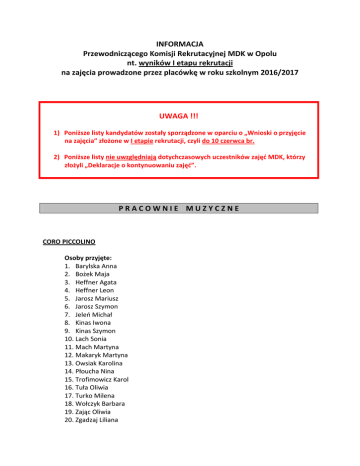 INFORMACJA Przewodniczącego Komisji Rekrutacyjnej MDK w Opolu nt. wyników I etapu rekrutacji na zajęcia prowadzone przez placówkę w roku szkolnym 2016/2017 UWAGA !!! 1) Poniższe listy kandydatów zostały sporządzone w oparciu o „Wnioski o przyjęcie na zajęcia” złożone w I etapie rekrutacji, czyli do 10 czerwca br. 2) Poniższe listy nie uwzględniają dotychczasowych uczestników zajęć MDK, którzy złożyli „Deklaracje o kontynuowaniu zajęć”. PRACOWNIE MUZYCZNE CORO PICCOLINO Osoby przyjęte: 1. Barylska Anna 2. Bożek Maja 3. Heffner Agata 4. Heffner Leon 5. Jarosz Mariusz 6. Jarosz Szymon 7. Jeleń Michał 8. Kinas Iwona 9. Kinas Szymon 10. Lach Sonia 11. Mach Martyna 12. Makaryk Martyna 13. Owsiak Karolina 14. Płoucha Nina 15. Trofimowicz Karol 16. Tuła Oliwia 17. Turko Milena 18. Wołczyk Barbara 19. Zając Oliwia 20. Zgadzaj Liliana STUDIO PIOSENKI „DEBIUT” Osoby przyjęte: 1. Arusimowa Iryna 2. Głogiewicz Paulina 3. Król Milena 4. Kuźniar Łukasz 5. Pogorzelska Julia 6. Sosna Bianka 7. Stysiak Aleksandra 8. Szweda Paweł Osoby nieprzyjęte: 1. Bardelska Aleksandra 2. Buczarska Zuzanna 3. Dziadek Zofia 4. Gawdyn Bartłomiej 5. Gorzkowska Maja 6. Lechowicz Natalia 7. Łotarewicz Ada 8. Łotarewicz Urszula 9. Malosek Emilia 10. Markuszewski Mateusz 11. Mikulicz Blanka 12. Niedużak Martyna 13. Strąk Pola 14. Szuster Laura 15. Śmiechowska Manuela 16. Zalas Katarzyna TALENTARIUM WOKALNE „SINGASONG” Osoby przyjęte: 1. Arusimowa Iryna 2. Lechowin Natalia 3. Łotarewicz Urszula 4. Maruszczyk Julia 5. Oleksiewicz Amelia 6. Oszek Klaudia 7. Pogorzelska Julia 8. Wołczyk Barbara 9. Zalas Katarzyna DZIECIĘCY ZESPÓŁ MUZYCZNY „SING & PLAY” Osoby przyjęte: 1. Głogiewicz Paulina 2. Gorzkowska Maja 3. Król Milena 4. Kuźniar Łukasz 5. Lewandowska Liliana 6. Łotarewicz Ada 7. Łydka Kinga 8. Niedużak Martyna 9. Nowak Zuzanna 10. Nowicka Maja 11. Oszek Lena 12. Szczurek Karolina 13. Trofimowicz Julia 14. Zalas Katarzyna WOKALNE STUDIO KSZTAŁCENIA JAZZOWEGO Osoby przyjęte: 1. Pogorzelska Julia STUDIO EMISJI GŁOSU Osoby przyjęte: 1. Durkalec Agata 2. Dzierżan Kamila 3. Kuźniak Milena 4. Łotarewicz Urszula 5. Pogorzelska Julia 6. Sadłoń Ewa 7. Wołczyk Barbara ROZKMINKI KONTROLOWANE – HIP-HOP Osoby przyjęte: 1. Bełkot Mariusz 2. Bilko Zbigniew 3. Gąska Bartosz 4. Piechota Michał KLUB SZEŚCIU STRUN Osoby przyjęte: 1. Arusimowa Iryna 2. Bożek Zuzanna 3. Głowacki Paweł 4. Hilczer Irena 5. Hilczer Weronika 6. Kostyk Karol 7. Kostyk Marta 8. Lechowin Natalia 9. Malosek Emilia 10. Markuszewski Mateusz 11. Mikulicz Blanka 12. Mikulicz Mikołaj 13. Oleksiewicz Amelia 14. Pachura Alan 15. Pańków Jagoda 16. Pawlik Bartosz 17. Sadowska Oliwia STUDIO INSTRUMENTÓW KLAWISZOWYCH Osoby przyjęte: 1. Dziadkiewicz Iga 2. Kolano Franciszek 3. Matysiak Ksenia 4. Nowak Zuzanna 5. Pawlicka Michalina PRACOWNIE PLASTYCZNE PRACOWNIA PLASTYCZNA „ARTE” Osoby przyjęte: 1. Brzózka Laura 2. Pawlik Bartosz 3. Sanany Miłosz 4. Szymczyk Michał PRACOWNIA PLASTYCZNA „PLASTUSIE” Osoby przyjęte: 1. Albert Małgorzata 2. Biedrzycka Daria 3. Brzózka Laura 4. Dzierżan Marcel 5. Gabriel Karolina 6. Górska Zofia 7. Grzonka Natalia 8. Labisz Samanta 9. Lach Joanna 10. Liśkiewicz Hanna 11. Pawlik Bartosz 12. Przybył Viktoria 13. Radomska Maja 14. Sadłoń Anna 15. Sanany Miłosz 16. Szczurek Karolina 17. Wacowska Laura 18. Walas Aleksandra 19. Wierzbicka Hanna 20. Wójcik Weronika 21. Zienkiewicz Anna 22. Żołnierek Agata PRACOWNIA PLASTYCZNA „RAMKA” Osoby przyjęte: 1. Durkalec Agata 2. Gabriel Karolina 3. Gawdyn Karolina 4. Nielska Emilia 5. Pawlicka Michalina 6. Szczurek Karolina 7. Wierzbicka Hanna 8. Wilczyńska Estera PRACOWNIA PLASTYCZNA „TĘCZA” Osoby przyjęte: 1. Brzózka Laura 2. Czech Maja 3. 4. 5. 6. 7. 8. Gabriel Karolina Korzeniowska Aleksandra Mikulicz Blanka Nielska Emilia Szymczyk Michał Zienkiewicz Anna PRACOWNIA PLASTYCZNA „WRÓBEL” Osoby przyjęte: 1. Brzózka Laura 2. Czech Maja 3. Drążek Magdalena 4. Gabriel Karolina 5. Gal Viktoria 6. Jarosz Maksymilian 7. Mikulicz Blanka 8. Nowak Zofia 9. Nowak Zuzanna 10. Okupniak Maja 11. Pawlik Bartosz 12. Sanany Miłosz 13. Zienkiewicz Anna PRACOWNIA CERAMIKI ARTYSTYCZNEJ Osoby przyjęte: 1. Barylska Julia 2. Bielecki Jakub 3. Brzózka Laura 4. Gabriel Karolina 5. Król Hanna 6. Lach Joanna 7. Lenartowicz Julia 8. Liśkiewicz Hanna 9. Łysień Filip 10. Maciałek Natalia 11. Malosek Emilia 12. Miesiączek Natalia 13. Nowak Jagoda 14. Nowak Zuzanna 15. Plaza Ewa 16. Radomska Maja 17. Sadłoń Anna 18. Sanany Miłosz 19. Skrobot Viktoria 20. Szczurek Karolina 21. Wacowska Laura 22. Walas Aleksandra 23. Wierzbicka Hanna 24. Wilamek Halina 25. Wójcik Weronika 26. Wróbel Marta 27. Żołnierek Agata KOŁO GOSPODYŃ MIEJSKICH Osoby przyjęte: 1. Bielecka Ewa 2. Ochmicka Natasza 3. Olszewska Magdalena 4. Pawlicka Michalina 5. Studzińska-Sośniak Małgorzata 6. Wilamek Halina PRACOWNIE FOTOGRAFICZNO-FILMOWE PRACOWNIA FOTOGRAFICZNA „BLENDA” Osoby przyjęte: 1. Chmurowska Natalia 2. Durkalec Agata 3. Dzierżan Szymon 4. Helscher Sara 5. Kaniuka Hanna 6. Pawlicka Michalina 7. Tratkiewicz Jakub PRACOWNIE TEATRALNE TEATR „AGLET” Osoby przyjęte: 1. Gulczewska Andżelika TEATR „ASCEZIĄTKA” Osoby przyjęte: 1. Drohomirecka Nadia 2. Terlikowska Pola TEATR „FIGIELEK” Osoby przyjęte: 1. Kalinowski Ireneusz 2. Królak Michał 3. Lewandowska Liliana 4. Niedużak Martyna 5. Wójcik Weronika TEATR „GAGATKI” Osoby przyjęte: 1. Andruszkiewicz Zofia 2. Buczarska Zuzanna 3. Czech Paulina 4. Dzierżan Marcel 5. Gawdyn Karolina 6. Gąska Bartosz 7. Górska Zofia 8. Kruk Michalina 9. Malik Zuzanna 10. Nowak Zuzanna 11. Pitrus Konrad 12. Sanany Miłosz 13. Terlikowska Pola 14. Woldański Krzysztof TEATR „GROMADKA” Osoby przyjęte: 1. Bielecki Mikołaj 2. Drohomirecka Nadia 3. Duda Julian 4. Dzierżan Marcel 5. Gąska Bartosz 6. Górska Zofia 7. Gralla Zuzanna 8. Hac Tamara 9. 