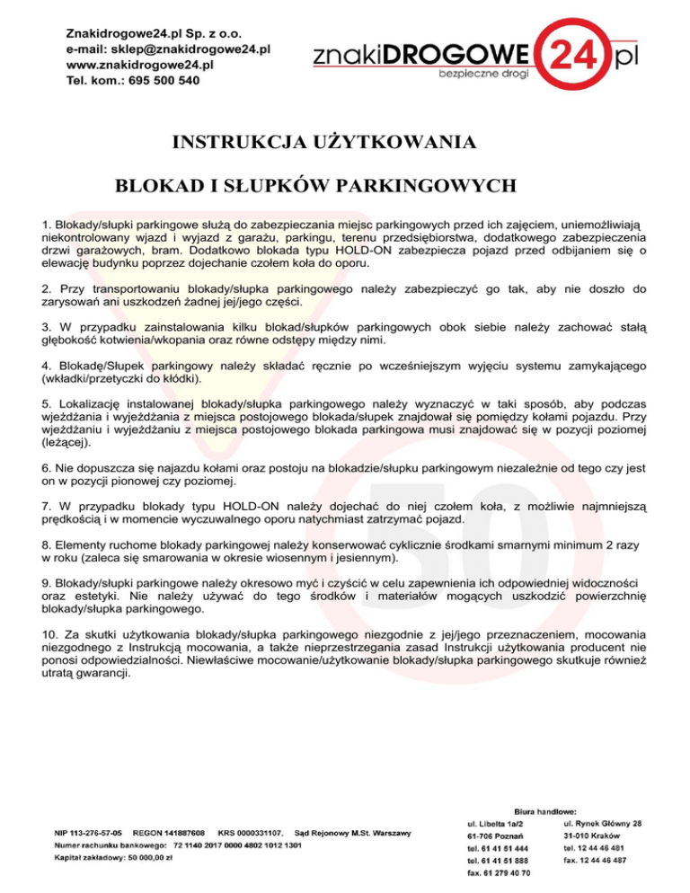 INSTRUKCJA UŻYTKOWANIA BLOKAD I SŁUPKÓW PARKINGOWYCH 1. Blokady/słupki parkingowe służą do zabezpieczania miejsc parkingowych przed ich zajęciem, uniemożliwiają niekontrolowany wjazd i wyjazd z garażu, parkingu, terenu przedsiębiorstwa, dodatkowego zabezpieczenia drzwi garażowych, bram. Dodatkowo blokada typu HOLD-ON zabezpiecza pojazd przed odbijaniem się o elewację budynku poprzez dojechanie czołem koła do oporu. 2. Przy transportowaniu blokady/słupka parkingowego należy zabezpieczyć go tak, aby nie doszło do zarysowań ani uszkodzeń żadnej jej/jego części. 3. W przypadku zainstalowania kilku blokad/słupków parkingowych obok siebie należy zachować stałą głębokość kotwienia/wkopania oraz równe odstępy między nimi. 4. Blokadę/Słupek parkingowy należy składać ręcznie po wcześniejszym wyjęciu systemu zamykającego (wkładki/przetyczki do kłódki). 5. Lokalizację instalowanej blokady/słupka parkingowego należy wyznaczyć w taki sposób, aby podczas wjeżdżania i wyjeżdżania z miejsca postojowego blokada/słupek znajdował się pomiędzy kołami pojazdu. Przy wjeżdżaniu i wyjeżdżaniu z miejsca postojowego blokada parkingowa musi znajdować się w pozycji poziomej (leżącej). 6. Nie dopuszcza się najazdu kołami oraz postoju na blokadzie/słupku parkingowym niezależnie od tego czy jest on w pozycji pionowej czy poziomej. 7. W przypadku blokady typu HOLD-ON należy dojechać do niej czołem koła, z możliwie najmniejszą prędkością i w momencie wyczuwalnego oporu natychmiast zatrzymać pojazd. 8. Elementy ruchome blokady parkingowej należy konserwować cyklicznie środkami smarnymi minimum 2 razy w roku (zaleca się smarowania w okresie wiosennym i jesiennym). 9. Blokady/słupki parkingowe należy okresowo myć i czyścić w celu zapewnienia ich odpowiedniej widoczności oraz estetyki. Nie należy używać do tego środków i materiałów mogących uszkodzić powierzchnię blokady/słupka parkingowego. 10. Za skutki użytkowania blokady/słupka parkingowego niezgodnie z jej/jego przeznaczeniem, mocowania niezgodnego z Instrukcją mocowania, a także nieprzestrzegania zasad Instrukcji użytkowania producent nie ponosi odpowiedzialności. Niewłaściwe mocowanie/użytkowanie blokady/słupka parkingowego skutkuje również utratą gwarancji.