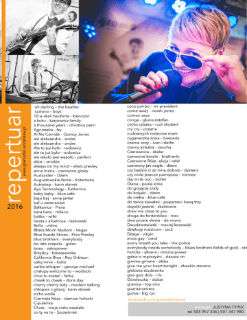 www.gramofon.wodzislaw.pl repertuar oh darling – the beatles szalona – boys 10 w skali beuforta – klenczon a kuku – karpowicz family a thousand years – christina perri Agnieszka – łzy Ai No Corrida – Quincy Jones ale aleksandra – andre ale aleksandra – andre Ale to już było – rodowicz ale to już było – rodowicz ale wkoło jest wesoło – perfect alice – smokie p always on my mind – elwis presley anna maria – czerwone gitary Audsaider – Dżem Augustowskie Noce – Koterbska Autostop – karin stanek Ayo Technology – Katherine baby baby – blue cafe baju baj – anna jantar bal u weteranów Bałkanica – Piersi bara bara – milano baśka – wilki beata z albatrosa – laskowski Bella – video Blis Bliska Moim Myślom – Vegas Blue Suede Shoes – Elvis Presley blus brothers – everybody bo lato rozpala – golec boso – zakopower Brzydcy – łobaszewska California Blue – Roy Orbison całuj mnie – kukiz carles whisper – george michael chałupy welcome to – wodecki chce tu zostać – farba cheek to cheek – doris day cherry cherry lady – modern talking chłopiec z gitarą - karin stanek cicha woda Ciernista Róża – damian holecki Cipuleńka Cliver – moje ciało oszalało co ty na to – Szcześniak coco jumbo – mr president come away - norah jones comon sava conga – gloria estefan córko rybaka – rudi shubert cry cry – oceana cudownych rodziców mam cyganeczka zosia – biesiada czarne oczy – ivan i delfin czarny alibaba – zaucha Czarownica – skalar czerwone korale – brathanki Czerwone Róże -alicja i rafał czerwony jak cegła – dżem czy będzie ci ze mną dobrze – dystans czy mnie jeszcze pamiętasz – niemen daj mi te noc – bolter Diana – paula anka do grającej szafy do kołyski – dżem do nieba – blue cafe do tańca kawałek – poparzeni kawą trzy dopóki jestetś – skaldowie draw me close to you droga do fontenbloo – mec dwa proste słowa – de mono Dwudziestolatki – maciej kosowski dzię dziękuję rodzicom – jack Dżaga – virgin enoa gay – omd every breath you take – the police everybody needs somebody – blues brothers fields of gold – stin Felicita – albano i romina power gdzie ci mężczyźni – danuta rin gimme gimme – abba give me your heart tonight – sheakin stevens głeboka studzienka goo goo dols – iris Góraleczko – dukat granica – top one guantanamera guma – big cyc facebook.com/gramofonband manager JUSTYNA TYPEK tel 505 957 336 | 501 347 980 www.gramofon.wodzislaw.pl repertuar harley mój – dżem hej czy ty wiesz – clasicc hej hej góralu Hero – enrique iglesias Hifi – wanda I banda highway to hell – acdc Ho Horey – boney m hot n cold – kate perry i cant help falling in love – presley i fell good – james brown I just called to say i love you – stevie Wonder i znów nie przespana noc ide na plaże – video whitesna is this love – whitesnake iśc w stronę słońca – jantar Its a Heartache – Bonie Taylor its my life – bon jovi Jailhouse Rock – Elvis Presley jak się bawią ludzie – baciary jak się masz – happy end jaki tu spokój spo – stauros jeden moment – pectus jedna z gwiazd – otzi jedzie pociąg – rynkowski jesteś blisko mnie - -piasek jeśli tylko chcesz – kukiz i borysewicz jutro będzie dobry dzień już ci nie wybaczę – kombi kaczuszki kanikuły Kasia – trubadurzy Kawalerowie – baciary kiss kiss kiss kochać – szczepanik kocham się w tobie – piękni i młodzi kolorowa sukienka – long n junior kołyskanka – sumptuastic konckin on heaven door – gnr konik – urszula Krakowianka – biesiada księżycowa piosenka – varius manx ktoś mnie pokochał – skaldowie la bamba – los lobos let it be – the beatles lets twist again – rnr Lili – enej list do matki - villas lody na patyku – skaner lornetka – golec ładne oczy masz – czerwone gitary łobuz – boys Macarena – los del rio Macarena – mario bischin makumba – big cyc mała blonydneczka – baye full Małgośka – rodowicz mama maria – albano i romina power mamboleo mamm mia – abba mamy czas – ewa jach marianna marina marina marina marina miłość i łzy – denis miód malina – mig Moje Ciało – Cliver moje serce – marika monika – rudi shubert mój przyjacielu – krawczyk na dancingu tańczą goście Na Falochronie – Emigranci na jednej z dzikich plaż – rotary na sercu rany Najpiękniejsza – krajewski najtrudniejszy pierwszy krok Narcy nasz najpiękniejszy dzień – eleni nasze randez vous – kombi nie daj życiu się after party Nie jesteś sama – krajewski nie liczę godzin i lat – rybiński nie ma mocnych na mariolę – mig nie płacz ewka – perfekt nie zadzieraj nosa – czerwone gitary nikt na świecie nie wie – czerwone gitary noc z renatą nogi – czarno czarni nossa – melo nothing eals matters – metalica o hela – piers o karolino – vox o miła moja – top one o mnie się nie martw – kasia sobczyk o tobie kochana – milano obladi oblada – the beatles oceany – pectus oczarowałaś mnie – akcent Oh Carol – Smokie Oh Julie – Shakin Stevens ona czuje we mnie piniadź – playboys ona i on – ira ona jest taka cudowna – Piękni i młodzi ona tańczy dla mnie – weekend one way ticket – boney m orkiestry dęte – kunicka wale panno walerciu Parostatek – krzysztof krawczyk piąty bieg – budka suflera piechotą do lata – bajm plastikowa biedronka płynie w nas gorąca krew – bajm po to jesteś na tym świecie – mannam po pokaż na co cię stać – fell polki polskie dziewczyny – voyager poszła karolinka powiedz – ich troje powiedz stary – czerwone gitary prawy do lewego – kaya pryw prywatki – gąsowski przetańczyć z tobą chcę przez twe oczy zielone – akcent przeżyłam z tobą tyle lat – krystyna giżowska przyjaciel od zaraz pszółka maja – akcent puste słowa – wyszkoni Radio Hello – Enej radość najpi