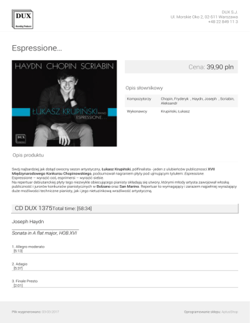 DUX S.J. Ul. Morskie Oko 2, 02-511 Warszawa +48 22 849 11 3 Espressione… Cena: 39,90 pln Opis słownikowy Kompozytorzy Chopin, Fryderyk ∎, Haydn, Joseph ∎, Scriabin, Aleksandr ∎ Wykonawcy Krupiński, Łukasz ∎ Opis produktu Swój najbardziej jak dotąd owocny sezon artystyczny, Łukasz Krupiński, półfinalista - jeden z ulubieńców publicznosci XVII Międzynarodowego Konkursu Chopinowskiego, podsumował nagraniem płyty pod ujmującym tytułem: Espressione. Espressione – wyrazić coś, esprimersi – wyrazić siebie. Na repertuar debiutanckiej płyty tego niezwykle obiecującego pianisty składają się utwory, którymi młody artysta zawojował włoską publiczność i jurorów konkursów pianistycznych w Bolzano oraz San Marino. Repertuar to wymagający i zarazem najpełniej wyrażający duże możliwości techniczne pianisty, jak i jego nietuzinkową wrażliwość artystyczną. CD DUX 1375Total time: [58:34] Joseph Haydn Sonata in A flat major, HOB.XVI 1. Allegro moderato [5:13] 2. Adagio [5:37] 3. Finale Presto [2:01] Plik wygenerowano: 03-03-2017 Oprogramowanie sklepu: AptusShop DUX S.J. Ul. Morskie Oko 2, 02-511 Warszawa +48 22 849 11 3 Fryderyk Chopin Barkarola Fis-dur op. 60 4. Barcarolle in F sharp major, Op. 60 [9:11] Fryderyk Chopin Walc Es-dur op. 18 5. Waltz in E flat major, Op. 18 [4:53] Fryderyk Chopin Polonez-Fantazja As-dur op. 61 6. Polonaise-Fantasy in A flat major, Op. 61 [14:02] Fryderyk Chopin Lento con gran espressione cis-moll op. posth. (WN 37) 7. Lento con gran espressione in C sharp minor, Op. posth. [4:40] Aleksandr Scriabin Piano Sonata No. 2 in G sharp minor, op. 19 "Sonata Fantasy" 8. I Andante [8:25] 9. II Presto Plik wygenerowano: 03-03-2017 Oprogramowanie sklepu: AptusShop DUX S.J. Ul. Morskie Oko 2, 02-511 Warszawa +48 22 849 11 3 [4:11] Wykonawcy: Łukasz Krupiński /fortepian/ Plik wygenerowano: 03-03-2017 Powered by TCPDF (www.tcpdf.org) Oprogramowanie sklepu: AptusShop