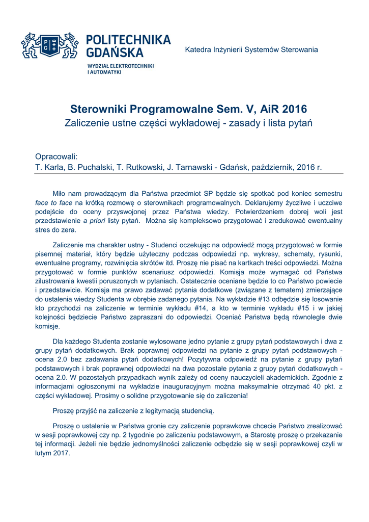Katedra Inżynierii Systemów Sterowania Sterowniki Programowalne Sem. V, AiR 2016 Zaliczenie ustne części wykładowej - zasady i lista pytań Opracowali: T. Karla, B. Puchalski, T. Rutkowski, J. Tarnawski - Gdańsk, październik, 2016 r. Miło nam prowadzącym dla Państwa przedmiot SP będzie się spotkać pod koniec semestru face to face na krótką rozmowę o sterownikach programowalnych. Deklarujemy życzliwe i uczciwe podejście do oceny przyswojonej przez Państwa wiedzy. Potwierdzeniem dobrej woli jest przedstawienie a priori listy pytań. Można się kompleksowo przygotować i zredukować ewentualny stres do zera. Zaliczenie ma charakter ustny - Studenci oczekując na odpowiedź mogą przygotować w formie pisemnej materiał, który będzie użyteczny podczas odpowiedzi np. wykresy, schematy, rysunki, ewentualne programy, rozwinięcia skrótów itd. Proszę nie pisać na kartkach treści odpowiedzi. Można przygotować w formie punktów scenariusz odpowiedzi. Komisja może wymagać od Państwa zilustrowania kwestii poruszonych w pytaniach. Ostatecznie oceniane będzie to co Państwo powiecie i przedstawicie. Komisja ma prawo zadawać pytania dodatkowe (związane z tematem) zmierzające do ustalenia wiedzy Studenta w obrębie zadanego pytania. Na wykładzie #13 odbędzie się losowanie kto przychodzi na zaliczenie w terminie wykładu #14, a kto w terminie wykładu #15 i w jakiej kolejności będziecie Państwo zapraszani do odpowiedzi. Oceniać Państwa będą równolegle dwie komisje. Dla każdego Studenta zostanie wylosowane jedno pytanie z grupy pytań podstawowych i dwa z grupy pytań dodatkowych. Brak poprawnej odpowiedzi na pytanie z grupy pytań podstawowych ocena 2.0 bez zadawania pytań dodatkowych! Pozytywna odpowiedź na pytanie z grupy pytań podstawowych i brak poprawnej odpowiedzi na dwa pozostałe pytania z grupy pytań dodatkowych ocena 2.0. W pozostałych przypadkach wynik zależy od oceny nauczycieli akademickich. Zgodnie z informacjami ogłoszonymi na wykładzie inauguracyjnym można maksymalnie otrzymać 40 pkt. z części wykładowej. Prosimy o solidne przygotowanie się do zaliczenia! Proszę przyjść na zaliczenie z legitymacją studencką. Proszę o ustalenie w Państwa gronie czy zaliczenie poprawkowe chcecie Państwo zrealizować w sesji poprawkowej czy np. 2 tygodnie po zaliczeniu podstawowym, a Starostę proszę o przekazanie tej informacji. Jeżeli nie będzie jednomyślności zaliczenie odbędzie się w sesji poprawkowej czyli w lutym 2017. Pytania podstawowe 1. 2. 3. 4. 5. 6. 7. 8. 9. 10. 11. 12. 13. 14. 15. 16. 17. 18. 19. 20. 21. 22. 23. 24. 25. 26. 27. 28. 29. 30. Przedstaw rozwinięcie akronimu i definicję(/e) PLC. Opisz ideę cyklu pracy PLC. Czym cechują się PLC? Wyjaśnij różnicę w programowaniu PLC i PC. Wyjaśnij podział zadań pomiędzy PLC i SCADA w systemie sterowania. Wymień i przedstaw wady i zalety PLC jako urządzenia sterującego. Co to jest układ watchdog w PLC i jakie jest jego znaczenie? Wymień podstawowe cechy języka drabinkowego. Jakie rodzaje zmiennych dostępne są w programowaniu PLC i jakie jest ich przyporządkowanie do zasobów PLC? Na jakie grupy operacji podzielono (dostępne dla programistów w różnych językach programowania) zasoby systemu operacyjnego PLC? Jak zrealizować proces sekwencyjny w PLC? Jaki język jest do tego zadania szczególnie predestynowany? Opisz procedurę doboru PLC do konkretnego zadania automatyzacji. Jaką rolę pełni proces konfiguracji PLC? Scharakteryzuj język IL. Scharakteryzuj język ST. Przedstaw i opisz składowe normy IEC 61131. Scharakteryzuj trzecią część normy IEC 61131 (IEC 61131-3). Scharakteryzuj język FBD. Przedstaw podstawowe zasady wykonywania programów napisanych w języku FBD. Opisz podstawowe zasady tworzenia sekwencyjnych schematów funkcjonalnych SFC. Na prostym przykładzie zaprezentuj różnicę pomiędzy krokiem a tranzycją w sekwencyjnych schematach funkcjonalnych SFC. W jakich językach programowania narzędzie Simulink PLC Coder generuje kody źródłowe dla sterowników PLC i na jakie ograniczenia PLC zwracać trzeba szczególną uwagę projektując złożone algorytmy dla sterowników? Omów strukturę kodu źródłowego w języku ST generowaną przez narzędzie Simulink PLC Coder. Jakie konsekwencje wynikają z przekroczenia maksymalnego dopuszczalnego czasu trwania cyklu? Jakie mogą być przyczyny tego przekroczenia i jak się przed tym zabezpieczać? Przedstaw klasyczny układ regulacji automatycznej SISO, wymień i nazwij wszystkie zmienne w nim występujące. Jaką rolę pełni sterownik PLC w klasycznym układzie regulacji? Podaj i krótko scharakteryzuj znane Ci elementy, które mogą zastąpić sterownik PLC w typowych prostych układach regulacji automatycznej operujących na sygnałach binarnych. Rozwiń akronimy SP, PV, CV oraz przedstaw ich miejsce w klasycznym układzie regulacji. Zilustruj sposób budowy i organizacji logiki dla PLC złożonej z wielu bloków w różnych językach programowania. Jakie zalety i wady płyną z zastąpienia układów przekaźnikowych sterownikami programowalnymi? Jak działa PLC w trybie ze stałym czasem trwania cyklu i do czego ten tryb może być zastosowany? 2 Pytania dodatkowe 31. 32. 33. 34. 35. 36. 37. 38. 39. 40. 41. 42. 43. 44. 45. 46. 47. 48. 49. 50. 51. 52. 53. 54. 55. 56. 57. 58. 59. 60. 61. 62. 63. 64. 65. 66. 67. 68. 69. 70. Podaj kategorie modułów PLC i ich zastosowanie. Czym różnią się PLC od PAC? Co to jest SoftPLC? Wyjaśnij ideę 'familiy concept' w ofercie producentów PLC. Jakie etapy cyklu są wykonywane w trybie pracy PLC STOP NO I/O Wyjaśnij jak wykonywany program jest program sterujący w PLC, skąd brane są dane do wykonania programu i gdzie zapisane są jego wyniki. Co dzieje się w elemencie cyklu Diagnostyka i po co? Z jakich elementów składa się czas wykonania cyklu i jak go ustalić? Wymień i opisz typy danych stosowane w PLC do programowania. W jaki 