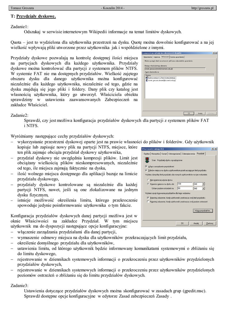 Tomasz Greszata - Koszalin 2014 - http://greszata.pl T: Przydziały dyskowe. Zadanie1: Odszukaj w serwisie internetowym Wikipedii informacje na temat limitów dyskowych. Quota – jest to wydzielona dla użytkownika przestrzeń na dysku. Quotę można dowolnie konfigurować a na jej wielkość wpływają pliki utworzone przez użytkownika jak i współdzielone z innymi. Przydziały dyskowe pozwalają na kontrolę dostępnej ilości miejsca na partycjach dyskowych dla każdego użytkownika. Przydziały dyskowe można kontrolować dla partycji z systemem plików NTFS. W systemie FAT nie ma dostępnych przydziałów. Wielkość zajętego obszaru dysku dla danego użytkownika można konfigurować niezależnie dla każdego użytkownika, niezależnie od tego, gdzie na dysku znajdują się jego pliki i foldery. Dany plik czy katalog jest własnością użytkownika, który go utworzył. Właściciela obiektu sprawdzimy w ustawienia zaawansowanych Zabezpieczeń na zakładce Właściciel. Zadanie2: Sprawdź, czy jest możliwa konfiguracja przydziałów dyskowych dla partycji z systemem plików FAT i NTFS. Wyróżniamy następujące cechy przydziałów dyskowych: wykorzystanie przestrzeni dyskowej oparte jest na prawie własności do plików i folderów. Gdy użytkownik kopiuje lub zapisuje nowy plik na partycji NTFS, miejsce, które ten plik zajmuje obciąża przydział dyskowy użytkownika, przydział dyskowy nie uwzględnia kompresji plików. Limit jest obciążany wielkością plików nieskompresowanych, niezależnie od tego, ile miejsca zajmują faktycznie na dysku, ilość wolnego miejsca dostępnego dla aplikacji bazuje na limicie przydziału dyskowego, przydziały dyskowe kontrolowane są niezależnie dla każdej partycji NTFS, nawet, jeśli są one zlokalizowane na jednym dysku fizycznym, istnieje możliwość określenia limitu, którego przekroczenie spowoduje jedynie poinformowanie użytkownika o tym fakcie. Konfiguracja przydziałów dyskowych danej partycji możliwa jest w oknie Właściwości na zakładce Przydział. W tym miejscu użytkownik ma do dyspozycji następujące opcje konfiguracyjne: włączenie zarządzania przydziałami dla danej partycji, wymuszenie odmowy miejsca na dysku dla użytkowników przekraczających limit przydziału, określenie domyślnego przydziału dla użytkowników, ustawienia limitu, od którego użytkownik będzie informowany komunikatami systemowymi o zbliżaniu się do limitu dyskowego, rejestrowanie w dziennikach systemowych informacji o przekroczeniu przez użytkowników przydzielonych przydziałów dyskowych, rejestrowanie w dziennikach systemowych informacji o przekroczeniu przez użytkowników przydzielonych poziomów ostrzeżeń o zbliżaniu się do limitu przydziałów dyskowych. Zadanie3: Ustawienia dotyczące przydziałów dyskowych można skonfigurować w zasadach grup (gpedit.msc). Sprawdź dostępne opcje konfiguracyjne w edytorze Zasad zabezpieczeń Zasady . Tomasz Greszata Konfiguracja przydziałów - Koszalin 2014 - http://greszata.pl Tomasz Greszata - Koszalin 2014 - Konfiguracja przydziałów dyskowych z wiersza poleceń: fsutil quota query c: fsutil quota disable c: echo konfiguracja przydzialow dyskowych w KB fsutil quota modify c: 150 200 "%hostname%\asso" fsutil quota modify c: 200 150 "%computername%\asso" http://greszata.pl