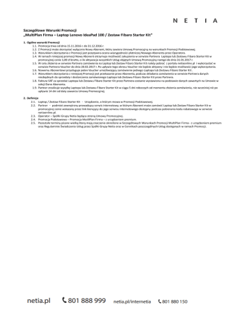 Szczegółowe Warunki Promocji „MultiPlan Firma – Laptop Lenovo IdeaPad 100 / Zestaw Fibaro Starter Kit” 1. Ogólne warunki Promocji 1.1. Promocja trwa od dnia 15.11.2016 r. do 31.12.2016 r. 1.2. Z Promocji może skorzystać wyłącznie Nowy Abonent, który zawiera Umowę Promocyjną na warunkach Promocji Podstawowej. 1.3. Warunkiem skorzystania z Promocji jest pozytywna ocena wiarygodności płatniczej Nowego Abonenta przez Operatora. 1.4. W ramach niniejszej promocji Nowy Abonent otrzymuje możliwość zakupienia w serwisie Partnera Laptopa lub Zestawu Fibaro Starter Kit w promocyjnej cenie 1,00 zł brutto, o ile aktywacja wszystkich Usług objętych Umową Promocyjną nastąpi do dnia 31.01.2017 r. 1.5. W celu złożenia w serwisie Partnera zamówienia na Laptop lub Zestaw Fibaro Starter Kit należy pobrać z portalu netiaonline.pl i wykorzystać w serwisie Partnera Vaucher do dnia 28.02.2017 r. Po upływie tego okresu Vaucher nie będzie aktywny i nie będzie możliwości jego wykorzystania. 1.6. Nowemu Abonentowi przysługuje jeden Vaucher umożliwiający zamówienie jednego Laptopa lub Zestawu Fibaro Starter Kit . 1.7. Warunkiem skorzystania z niniejszej Promocji jest przekazanie przez Abonenta, podczas składania zamówienia w serwisie Partnera danych niezbędnych do sprzedaży i dostarczenia zamówionego Laptopa lub Zestawu Fibaro Starter Kit przez Partnera. 1.8. Faktura VAT za sprzedaż Laptopa lub Zestawu Fibaro Starter Kit przez Partnera zostanie wystawiona na podstawie danych zawartych na Umowie w sekcji Dane Abonenta. 1.9. Partner zrealizuje wysyłkę Laptopa lub Zestawu Fibaro Starter Kit w ciągu 5 dni roboczych od momentu złożenia zamówienia, nie wcześniej niż po upływie 14 dni od daty zawarcia Umowy Promocyjnej. 2. Definicje 2.1. Laptop / Zestaw Fibaro Starter Kit – Urządzenie, o którym mowa w Promocji Podstawowej. 2.2. Partner – podmiot zewnętrzny prowadzący serwis internetowy, w którym Abonent może zamówić Laptop lub Zestaw Fibaro Starter Kit w promocyjnej cenie wskazany przez link kierujący do jego serwisu internetowego dostępny podczas pobierania kodu rabatowego w serwisie netiaonline.pl. 2.3. Operator – Spółki Grupy Netia będąca stroną Umowy Promocyjnej. 2.4. Promocja Podstawowa – Promocja MutliPlan Firma – z urządzeniem premium. 2.5. Pozostałe terminy pisane wielką literą mają znaczenie określone w Szczegółowych Warunkach Promocji MultiPlan Firma - z urządzeniem premium oraz Regulaminie Świadczenia Usług przez Spółki Grupy Netia oraz w Cennikach poszczególnych Usług dostępnych w ramach Promocji.