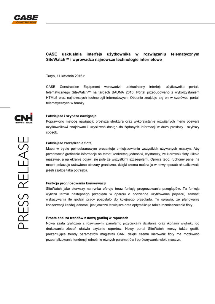 CASE uaktualnia interfejs użytkownika w rozwiązaniu SiteWatch™ i wprowadza najnowsze technologie internetowe telematycznym Turyn, 11 kwietnia 2016 r. CASE Construction Equipment wprowadził uaktualniony interfejs użytkownika portalu telematycznego SiteWatch™ na targach BAUMA 2016. Portal przebudowano z wykorzystaniem HTML5 oraz najnowszych technologii internetowych. Obecnie znajduje się on w czołówce portali telematycznych w branży. Łatwiejsza i szybsza nawigacja Poprawiono metodę nawigacji: prostsza struktura oraz wykorzystanie rozwijanych menu pozwala użytkownikowi znajdować i uzyskiwać dostęp do żądanych informacji w dużo prostszy i szybszy sposób. Łatwiejsze zarządzanie flotą Mapa w trybie pełnoekranowym prezentuje umiejscowienie wszystkich używanych maszyn. Aby przedstawić graficznie informacje na temat konkretnej jednostki, wystarczy, że kierownik floty kliknie maszynę, a na ekranie pojawi się pole ze wszystkimi szczegółami. Oprócz tego, ruchomy panel na mapie pokazuje ustawione obszary graniczne, dzięki czemu można je w łatwy sposób aktualizować, jeżeli zajdzie taka potrzeba. Funkcja prognozowania konserwacji SiteWatch jako pierwszy na rynku oferuje teraz funkcję prognozowania przeglądów. Ta funkcja wylicza termin następnego przeglądu w oparciu o codzienne użytkowanie pojazdu, zamiast wskazywania ile godzin pracy pozostało do kolejnego przeglądu. To sprawia, że planowanie konserwacji każdej jednostki jest jeszcze łatwiejsze oraz optymalizuje także rozmieszczanie floty. Prosta analiza trendów z nową grafiką w raportach Nowa szata graficzna z rozwijanymi panelami, przyciskami działania oraz ikonami wydruku do drukowania zleceń ułatwia czytanie raportów. Nowy portal SiteWatch tworzy także grafiki prezentujące trendy parametrów magistrali CAN, dzięki czemu kierownik floty ma możliwość przeanalizowania tendencji odnośnie różnych parametrów i porównywania wielu maszyn. Doskonała czytelność na wyświetlaczach każdej wielkości Uaktualniony portal przebudowano w formacie HTML5, aby zapewnić równie dobrą czytelność na dużych i małychekranach.. Możliwe jest także dostosowanie ustawień wizualizacji, zmiana ilości prezentowanych danych na jednej stronie za pomocą opcji zagęszczenia informacji. Korzystanie z kreatorów i uproszczonych stron ustawień ułatwia aktywację oprogramowania zamontowanego fabrycznie bądź w czasie obsługi posprzedażnej. Z naszej strony internetowej można pobrać tekst, zdjęcia w wysokiej rozdzielczości oraz filmiki powiązane z niniejszym komunikatem prasowym (jpg 300 dpi, CMYK): www.casecetools.com/presskit Śledź CASE na: CASE Construction Equipment sprzedaje i obsługuje pełną gamę maszyn budowlanych na całym świecie, w tym wyjątkowe koparko-ładowarki, koparki, równiarki, ładowarki kołowe, walce wibracyjne, spycharki, miniładowarki i terenowe wózki widłowe. U Dilerów CASE, Klienci mają dostęp do prawdziwego profesjonalnego partnera oferującego światowej klasy sprzęt i wsparcie posprzedażowe oraz wiodące w branży warunki gwarancji i elastycznego finansowania. Więcej informacji dostępnych jest na stronie www.CASEce.com. CASE Construction Equipment jest marką należącą do CNH Industrial N.V., światowego lidera w branży dóbr inwestycyjnych notowanego na Nowojorskiej Giełdzie Papierów Wartościowych (NYSE: CNHI) oraz na Giełdzie Papierów Wartościowych w Mediolanie (MI: CNHI). Więcej informacji na temat CNH Industrial można znaleźć w Internecie na stronie www.cnhindustrial.com. Aby uzyskać więcej informacji prosimy o kontakt: Nuria Martí (ALARCON & HARRIS) Tel: +34 91 415 30 20 Email: [email protected]