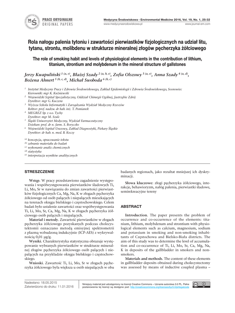 Medycyna Środowiskowa - Environmental Medicine 2016, Vol. 19, No. 1, 25-32 www.journal-em.com www.medycynasrodowiskowa.pl Rola nałogu palenia tytoniu i zawartości pierwiastków fizjologicznych na udział litu, tytanu, strontu, molibdenu w strukturze mineralnej złogów pęcherzyka żółciowego The role of smoking habit and levels of physiological elements in the contribution of lithium, titanium, strontium and molybdenum in the mineral structure of gallstones Jerzy Kwapuliński 1 (a, e), Błażej Szady 2 (a, b, e), Zofia Olszowy 3 (a, e), Anna Szady 4 (a, d), Bożena Ahnert 5 (b, c, d), Michał Swoboda 6 (b, c) 1 2 3 4 5 6 Instytut Medycyny Pracy i Zdrowia Środowiskowego, Zakład Epidemiologii i Zdrowia Środowiskowego, Sosnowiec Kierownik: mgr K. Kuźniewski Wojewódzki Szpital Specjalistyczny, Oddział Chirurgii Ogólnej, Jastrzębie Zdrój Dyrektor: mgr G. Kuczera Wyższa Szkoła Informatyki i Zarządzania Wydział Medyczny Rzeszów Rektor: prof. nadzw. dr hab. inż. T. Pomianek MEGREZ Sp. z o.o. Tychy Dyrektor: mgr M. Szulc Śląski Uniwersytet Medyczny, Wydział Farmaceutyczny Dziekan: prof. dr n. farm. S. Boryczko Wojewódzki Szpital Urazowy, Zakład Diagnostyki, Piekary Śląskie Dyrektor: dr hab. n. med. B. Koczy koncepcja, opracowanie tekstu zebranie materiału do badań (c) wykonanie analiz chemicznych (d) statystyka (e) interpretacja wyników analitycznych (a) (b) STRESZCZENIE Wstęp. W pracy przedstawiono zagadnienie występowania i współwystępowania pierwiastków śladowych Ti, Li, Mo, Sr w nawiązaniu do zmian zawartości pierwiastków fizjologicznych Ca, Mg, Na, K w złogach pęcherzyka żółciowego od osób palących i niepalących mieszkających na terenach okręgu bielskiego i częstochowskiego. Celem badań było ustalenie zawartości oraz współwystępowania Ti, Li, Mo, Sr, Ca, Mg, Na, K w złogach pęcherzyka żółciowego osób palących i niepalących. Materiał i metody. Zawartość pierwiastków w złogach pęcherzyka żółciowego pozyskanych podczas cholecystektomii oznaczano metodą emisyjnej spektrometrii z plazmą wzbudzoną indukcyjnie (ICP-AES) z wykrywalnością 0,01 µg/g. Wyniki. Charakterystyka statystyczna obrazuje występowanie wybranych pierwiastków w strukturze mineralnej złogów pęcherzyka żółciowego osób palących i niepalących na przykładzie okręgu bielskiego i częstochowskiego. Wnioski. Zawartość Ti, Li, Mo, Sr w złogach pęcherzyka żółciowego była większa u osób niepalących w obu Nadesłano: 18.05.2015 Zatwierdzono do druku: 11.01.2016 badanych regionach, jako rezultat mniejszej ich dyskryminacji. Słowa kluczowe: złogi pęcherzyka żółciowego, interakcje, behawioryzm, nałóg palenia, pierwiastki śladowe, semirekreacyjne tereny ABSTRACT Introduction. The paper presents the problem of occurrence and co-occurrence of the elements: titanium, lithium, molybdenum and strontium with physiological elements such as calcium, magnesium, sodium and potassium in smoking and non-smoking inhabitants of Częstochowa and Bielsko-Biała districts. The aim of this study was to determine the level of accumulation and co-occurrence of Ti, Li, Mo, Sr, Ca, Mg, Na, K in deposits of the gallbladder in smokers and nonsmokers. Materials and methods. The content of these elements in gallbladder deposits obtained during cholecystectomy was assessed by means of inductive coupled plasma – Niniejszy materiał jest udostępniony na licencji Creative Commons – Uznanie autorstwa 3.0 PL. Pełne postanowienia tej licencji są dostępne pod: http://creativecommons.org/licenses/by/3.0/pl/legalcode 26 Medycyna Środowiskowa - Environmental Medicine 2016, Vol. 19, No. 1 Jerzy Kwapuliński i wsp.: Nałóg palenia tytoniu a pierwiastki w strukturze mineralnej złogów pęcherzyka żółciowego atomic emission spectrometry (ICP – AES) with accuracy to 0,01 µg/g. Results. Comprehensive statistical data illustrate the occurrence of the selected elements in the mineral structure of gallstones in smoking and non-smoking people on the example of inhabitants of Częstochowa and Bielsko-Biała districts. Conclusions. The content of the investigated elements in deposits of the gallbladder was higher in the nonsmokers’ choleliths in both districts as a result of smaller discrimination. WSTĘP Mn zależała wprost proporcjonalnie od zawartości Fe (0,63), Li (0,73), Ca (0,66) i Mg (0,69). W przypadku grupy chłopców nienarażonych na bierne palenie liczba istotnych zależności pomiędzy Fe a innymi badanymi metalami znacznie wzrosła [9]. Autorzy udowodnili, że charakter współwystępowania jonów żelaza i manganu z innymi pierwiastkami w migdałkach gardłowych był zróżnicowany pod wpływem biernego palenia. Podobnie obserwowano wyższe zawartości jonów Cu i Ca w migdałkach gardłowych dzieci narażonych na działanie dymu tytoniowego [10]. Rola nałogu palenia tytoniu uwidoczniła się również znaczącym wzrostem zawartości jonów ołowiu, kadmu, niklu w błonach płodowych, fragmentach przypłodowych i przyłożyskowych pępowin [11], w łożyskach kobiet [12], w mleku kobiet palących [13], w tętnicach udowych [14], w zębach kobiet [15, 16]. Charakterystyczne zmiany jako rezultat nałogu palenia we współwystępowaniu wielu pierwiastków obserwowano w zmienionych miażdżycowo tętnicach udowych osób palących i niepalących [17]. Co więcej, udowodniono, że równowaga kationowa w zębach kobiet palących uległa znaczącej zmianie w porównaniu do zębów kobiet niepalących, w obu przypadkach zamieszkałych na terenie województwa śląskiego [16]. W nawiązaniu do tych badań Malara i współ. [18] udowodnili przydatność twardych tkanek zębów do bioindykacji kadmu i ołowiu oraz wpływ palenia papierosów na kształtowanie się równowagi kationowej w tkankach twardych zębów mężczyzn [19–21]. Na przydatność złogów pęcherzyka żółciowego i ich wykorzystania jako biomarkerów ekspozycji zwrócili uwagę Kwapuli