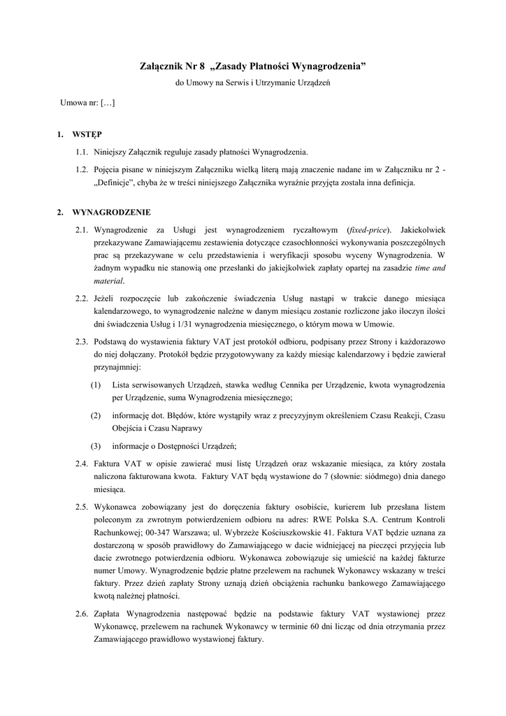 Załącznik Nr 8 „Zasady Płatności Wynagrodzenia” do Umowy na Serwis i Utrzymanie Urządzeń Umowa nr: […] 1. WSTĘP 1.1. Niniejszy Załącznik reguluje zasady płatności Wynagrodzenia. 1.2. Pojęcia pisane w niniejszym Załączniku wielką literą mają znaczenie nadane im w Załączniku nr 2 „Definicje”, chyba że w treści niniejszego Załącznika wyraźnie przyjęta została inna definicja. 2. WYNAGRODZENIE 2.1. Wynagrodzenie za Usługi jest wynagrodzeniem ryczałtowym (fixed-price). Jakiekolwiek przekazywane Zamawiającemu zestawienia dotyczące czasochłonności wykonywania poszczególnych prac są przekazywane w celu przedstawienia i weryfikacji sposobu wyceny Wynagrodzenia. W żadnym wypadku nie stanowią one przesłanki do jakiejkolwiek zapłaty opartej na zasadzie time and material. 2.2. Jeżeli rozpoczęcie lub zakończenie świadczenia Usług nastąpi w trakcie danego miesiąca kalendarzowego, to wynagrodzenie należne w danym miesiącu zostanie rozliczone jako iloczyn ilości dni świadczenia Usług i 1/31 wynagrodzenia miesięcznego, o którym mowa w Umowie. 2.3. Podstawą do wystawienia faktury VAT jest protokół odbioru, podpisany przez Strony i każdorazowo do niej dołączany. Protokół będzie przygotowywany za każdy miesiąc kalendarzowy i będzie zawierał przynajmniej: (1) Lista serwisowanych Urządzeń, stawka według Cennika per Urządzenie, kwota wynagrodzenia per Urządzenie, suma Wynagrodzenia miesięcznego; (2) informację dot. Błędów, które wystąpiły wraz z precyzyjnym określeniem Czasu Reakcji, Czasu Obejścia i Czasu Naprawy (3) informacje o Dostępności Urządzeń; 2.4. Faktura VAT w opisie zawierać musi listę Urządzeń oraz wskazanie miesiąca, za który została naliczona fakturowana kwota. Faktury VAT będą wystawione do 7 (słownie: siódmego) dnia danego miesiąca. 2.5. Wykonawca zobowiązany jest do doręczenia faktury osobiście, kurierem lub przesłana listem poleconym za zwrotnym potwierdzeniem odbioru na adres: RWE Polska S.A. Centrum Kontroli Rachunkowej; 00-347 Warszawa; ul. Wybrzeże Kościuszkowskie 41. Faktura VAT będzie uznana za dostarczoną w sposób prawidłowy do Zamawiającego w dacie widniejącej na pieczęci przyjęcia lub dacie zwrotnego potwierdzenia odbioru. Wykonawca zobowiązuje się umieścić na każdej fakturze numer Umowy. Wynagrodzenie będzie płatne przelewem na rachunek Wykonawcy wskazany w treści faktury. Przez dzień zapłaty Strony uznają dzień obciążenia rachunku bankowego Zamawiającego kwotą należnej płatności. 2.6. Zapłata Wynagrodzenia następować będzie na podstawie faktury VAT wystawionej przez Wykonawcę, przelewem na rachunek Wykonawcy w terminie 60 dni licząc od dnia otrzymania przez Zamawiającego prawidłowo wystawionej faktury. 2.7. Wynagrodzenie obejmuje w szczególności wynagrodzenie (cenę) za przeniesienie praw autorskich, udzielenie licencji oraz udzielenie Zamawiającemu innych uprawnień wskazanych Załączniku nr 10 Prawa Własności Intelektualnej. Wykonawcy ani osoby trzecie nie będą uprawnione do żądania od Zamawiającego jakichkolwiek dodatkowych kwot z tych tytułów. 2.8. Wynagrodzenie stanowi całość wynagrodzenia Wykonawcy w związku z realizacją Umowy. Wykonawcy nie przysługują żadne inne roszczenia w stosunku do Zamawiającego, w szczególności: zwrot kosztów podróży oraz zakwaterowania członków Personelu Wykonawcy czy też zwrot jakichkolwiek innych, dodatkowych kosztów ponoszonych przez Wykonawcę związanych z wykonywaniem Umowy. 2.9. Odpowiednie części Wynagrodzenia będą płatne na podstawie prawidłowo wystawionej i dostarczonej Zamawiającemu faktury, do której dołączono kopię podpisanego przez obie Strony Raportu. 2.10. Płatności dokonywane będą zawsze z dołu, tj. po zakończeniu danego miesiąca lub po wykonaniu prac, o ile Umowa wyraźnie nie stanowi inaczej.