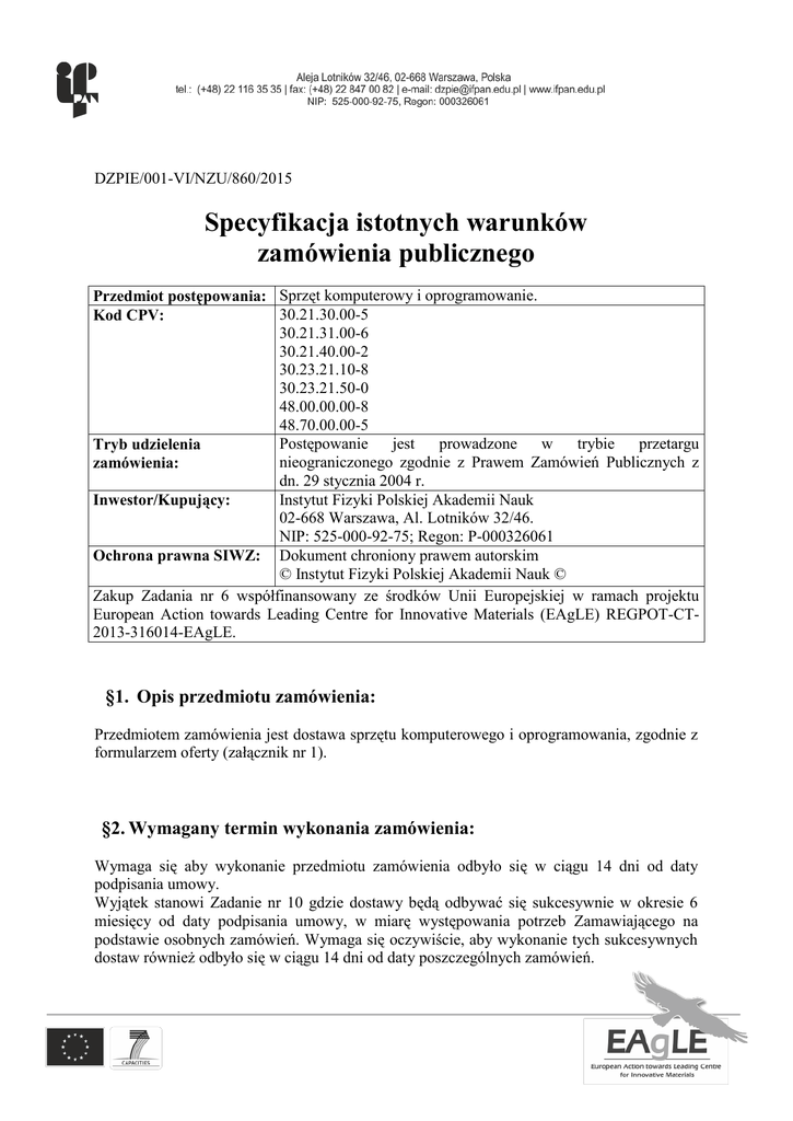 DZPIE/001-VI/NZU/860/2015 Specyfikacja istotnych warunków zamówienia publicznego Przedmiot postępowania: Sprzęt komputerowy i oprogramowanie. 30.21.30.00-5 Kod CPV: 30.21.31.00-6 30.21.40.00-2 30.23.21.10-8 30.23.21.50-0 48.00.00.00-8 48.70.00.00-5 Postępowanie jest prowadzone w trybie przetargu Tryb udzielenia nieograniczonego zgodnie z Prawem Zamówień Publicznych z zamówienia: dn. 29 stycznia 2004 r. Instytut Fizyki Polskiej Akademii Nauk Inwestor/Kupujący: 02-668 Warszawa, Al. Lotników 32/46. NIP: 525-000-92-75; Regon: P-000326061 Ochrona prawna SIWZ: Dokument chroniony prawem autorskim © Instytut Fizyki Polskiej Akademii Nauk © Zakup Zadania nr 6 współfinansowany ze środków Unii Europejskiej w ramach projektu European Action towards Leading Centre for Innovative Materials (EAgLE) REGPOT-CT2013-316014-EAgLE. §1. Opis przedmiotu zamówienia: Przedmiotem zamówienia jest dostawa sprzętu komputerowego i oprogramowania, zgodnie z formularzem oferty (załącznik nr 1). §2. Wymagany termin wykonania zamówienia: Wymaga się aby wykonanie przedmiotu zamówienia odbyło się w ciągu 14 dni od daty podpisania umowy. Wyjątek stanowi Zadanie nr 10 gdzie dostawy będą odbywać się sukcesywnie w okresie 6 miesięcy od daty podpisania umowy, w miarę występowania potrzeb Zamawiającego na podstawie osobnych zamówień. Wymaga się oczywiście, aby wykonanie tych sukcesywnych dostaw również odbyło się w ciągu 14 dni od daty poszczególnych zamówień. §3. Warunki udziału w postępowaniu, opis sposobu dokonywania oceny spełniania tych warunków oraz wykaz oświadczeń i dokumentów, jakie maja dostarczyć wykonawcy w celu potwierdzenia spełniania tych warunków: 1 O udzielenie zamówienia mogą ubiegać się wykonawcy, którzy spełniają warunki z Art. 22 ust. 1 Ustawy PZP, dotyczące: 1) posiadania uprawnień do wykonywania określonej działalności lub czynności, jeżeli przepisy prawa nakładają obowiązek ich posiadania; 2) posiadania wiedzy i doświadczenia; 3) dysponowania odpowiednim potencjałem technicznym oraz osobami zdolnymi do wykonania zamówienia; 4) sytuacji ekonomicznej i finansowej, i nie podlegają wykluczeniu z postępowania z trybie Art. 24 ust. 1. Oświadczenie o spełnianiu warunków udziału w postępowaniu zgodnie z Art. 22 ust. 1 Ustawy PZP. Oświadczenie o braku podstaw do wykluczenia z postępowania zgodnie z Art. 24 ust. 1 Ustawy PZP. Informacja o przynależności lub braku przynależności do grupy kapitałowej wraz z listą podmiotów należących do tej grupy kapitałowej. §4. Informacje o sposobie porozumiewania się zamawiającego z wykonawcami, a także wskazanie osób uprawnionych do porozumiewania się z wykonawcami: 1 2 Zamawiający będzie kontaktował się z wykonawcami na piśmie, faksem lub pocztą elektroniczną. Osoby przewidziane do kontaktu z wykonawcami: Jacek Zieliński – [email protected]; fax: (22) 847 00 82. §5. Termin związania ofertą: 1 Zamawiający ustala termin związania ofertą na okres 30 dni od daty terminu składania ofert. §6. Opis sposobu przygotowania oferty: 1 2 3 4 5 Ofertę sporządza się w języku polskim z zachowaniem formy pisemnej, trwałą, czytelną techniką, na formularzu ofertowym. Każdy wykonawca może złożyć tylko jedną ofertę. Wykonawca, który przedłożył więcej niż jedną ofertę, zostanie wyłączony z postępowania. Dopuszcza się składania ofert częściowych (na poszczególne Zadania). Wymaga się, aby do oferty były załączone specyfikacje techniczne oferowanego sprzętu. Wymaga się, aby do oferty był załączony zaakceptowany wzór umowy. 6 7 8 Wszystkie zapisane strony oferty powinny być ponumerowane, podpisane i zszyte. Wymaga się aby do oferty dołączyć zeskanowaną ofertę do plików JPG lub PDF. Nośnikiem danych może być płyta CD lub DVD. Oferent powinien zamieścić ofertę w kopercie z adresem i nazwą Zamawiającego oraz Oferenta, a także napisem: "Postępowanie o udzielenie zamówienia publicznego w trybie przetargu nieograniczonego na sprzęt komputerowy i oprogramowanie [DZPIE/001-VI/NZU/860/2015]" §7. Miejsce oraz termin składania i otwarcia ofert: 1 2 3 Ofertę należy złożyć w siedzibie Zamawiającego, budynek I pok. Nr. 101 (kancelaria ogólna) w godzinach 9.00 ÷ 15.00 w dni robocze, do dnia 16 lipca 2015 r., do godz. 12:00. W przypadku wysłania oferty pocztą (lub pocztą kurierską) za termin złożenia przyjmuje się termin otrzymania oferty, a nie datę stempla pocztowego (nadania). Otwarcie ofert odbędzie się w ostatnim dniu ich składania, w siedzibie Zamawiającego, budynek I sala 107 o godzinie 14:00. §8. Opis sposobu obliczenia ceny: 1 2 Cena wyrażona w kwocie polskiej „PLN”. Cena powinna uwzględniać: cenę towaru; dostawę; podatki, cła, ubezpieczenia. §9. Opis kryteriów, którymi zamawiający będzie się kierował przy wyborze oferty w celu zawarcia umowy w sprawie zamówienia publicznego: 1 2 3 Cena 98 pkt. Przy przeliczaniu punktów zamawiający posłuży się wzorem: C min 98 Cbad gdzie: Cmin – cena najtańszej oferty; Cbad – cena oferty badanej Przy przeliczaniu punktów za elementy dodatkowe, Zamawiający doda punkty za: Gwarancja 24 miesiące – 0 pkt; Gwarancja 36 miesięcy – 2 pkt. §10. Informacje o formalnościach, jakie powinny zostać dopełnione po wyborze oferty w celu zawarcia umowy w sprawie zamówienia publicznego: 1 Wykonawca, który wygrał postępowanie o udzielenie zamówienia publicznego, powinien podpisać umowę w ciągu 7 dni od daty zakończenia terminu na wnoszenie odwołań, na warunkach określonych w niniejszej specyfikacji istotnych warunków zamówienia, jednak nie później niż termin związania ofertą. §11. Istotne dla stron postanowienia, które zostaną wprowadzone do treści zawieranej umowy w sprawie zamówienia publicznego: 1 Wzór umowy stanowi załącznik nr 2. §12. Pouczenie o środkach ochrony prawnej: Środki ochrony prawnej, przysługujące wszyst