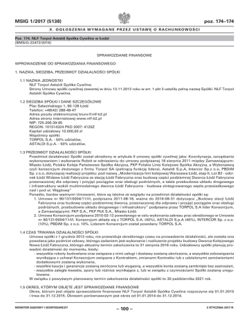MSIG 1/2017 (5138) poz. 174–174 X . O G Ł O S Z E N I A W Y M A G A N E P R Z E Z U S TAW Ę O R A C H U N K O W O Ś C I Poz. 174. NLF Torpol Astaldi Spółka Cywilna w Łodzi [BMSiG-22472/2016] SPRAWOZDANIE FINANSOWE WPROWADZENIE DO SPRAWOZDANIA FINANSOWEGO 1. NAZWA, SIEDZIBA, PRZEDMIOT DZIAŁALNOŚCI SPÓŁKI 1.1 NAZWA JEDNOSTKI NLF Torpol Astaldi Spółka Cywilna. Strony Umowy spółki cywilnej zawartej w dniu 13.11.2012 roku w art. 1 pkt 3 ustaliły pełną nazwę Spółki: NLF Torpol Astaldi Spółka Cywilna. 1.2 SIEDZIBA SPÓŁKI I DANE SZCZEGÓŁOWE Plac Sałacińskiego 1, 90-128 Łódź Telefon: +48(42) 288-48-47 Adres poczty elektronicznej [email protected] Adres strony internetowej www.nlf-b2.pl NIP: 725-206-39-95 REGON: 101514324 PKD 2007: 4120Z Kapitał udziałowy 10.000,00 zł Wspólnicy spółki: TORPOL S.A. - 50% udziałów, ASTALDI S.p.A. - 50% udziałów. 1.3 PRZEDMIOT DZIAŁALNOŚCI SPÓŁKI Przedmiot działalności Spółki został określony w artykule II umowy spółki cywilnej jako: Koordynacja, zarządzanie wykonywaniem i wykonanie Robót w odniesieniu do umowy podpisanej 18 sierpnia 2011 między Zamawiającym: Miasto Łódź, Polskie Koleje Państwowe Spółka Akcyjna, PKP Polskie Linie Kolejowe Spółka Akcyjna, a Wykonawcą czyli konsorcjum złożonego z firmy Torpol SA (pełniącą funkcję lidera), Astaldi S.p.A, Intercor Sp.z o.o, PBDiM Sp. z o.o, dotyczącej realizacji projektu: pod nazwą „Modernizacja linii kolejowej Warszawa Łódź, etap II, Lot B2 - odcinek Łódź Widzew Łódź Fabryczna ze stacją Łódź Fabryczna oraz budową części podziemnej Dworca Łódź Fabryczna przeznaczonej dla odprawy i przyjęć pociągów oraz obsługi podróżnych, a także przebudowa układu drogowego i infrastruktury wokół multimodalnego dworca Łódź Fabryczna - budowa zintegrowanego węzła przesiadkowego nad i pod ul. Węglową” Ponadto, bardzo ważnymi Umowami, które są istotne ze względu na przedmiot działalności spółki są: 1. Umowa nr 90/131/0004/11/I/I, podpisana 2011-08-18, ważna do 2016-08-31 dotycząca „Budowy stacji Łódź Fabryczna oraz budowę części podziemnej dworca, przeznaczonej dla odprawy i przyjęć pociągów oraz obsługi podróżnych, przebudowie układu drogowego i infrastruktury” podpisana przez TORPOL S.A lider Konsorcjum, a Zamawiającymi: PKP S.A., PKP PŁK S.A., Miasto Łódź. 2. Umowa Konsorcjum podpisana 2010-02-12 powołanego w celu wykonania zakresu prac określonego w Umowie nr 90/131/0004/11/I/I. Konsorcjum składa się z TORPOL S.A. (40%), ASTALDI S.p.A (40%), INTERCOR Sp. z o.o. (10%), PBDiM Sp. z o.o. 10%. Liderem Konsorcjum został powołany TORPOL S.A. 1.4 CZAS TRWANIA DZIAŁALNOŚCI SPÓŁKI Umowa spółki z 1 grudnia 2012 roku, nie przewiduje określonego czasu na prowadzenie działalności, ale została ona powołana jako podmiot celowy, którego zadaniem jest wykonanie i rozliczenie projektu budowy Dworca Kolejowego Nowa Łódź Fabryczna, którego aktualny termin zakończenia to 31 sierpnia 2016 roku. Udziałowcy spółki planują prowadzić działalność do momentu, kiedy: - wszystkie roboty budowlane oraz związane z nimi usługi i dostawy zostaną ukończone, a wszystkie zobowiązania wynikające z uchwał Konsorcjum związane z Kontraktem, zmianami Kontraktu lub z udzielonymi zamówieniami dodatkowymi zostaną wykonane, - wszelkie kaucje i gwarancje zostaną zwrócone lub wygasną, a wszystkie konta zostaną zamknięte bez zastrzeżeń, - wszystkie zaległe kwestie, spory lub różnice wynikające z, lub w związku z czynnościami Spółki zostaną uregulowane. W związku z powyższym planowany termin zakończenia działalności spółki to 30 października 2021 rok. 1.5 OKRES, KTÓRYM OBJĘTE JEST SPRAWOZDANIE FINANSOWE Okres, którym jest objęte sprawozdanie finansowe NLF Torpol Astaldi Spółka Cywilna rozpoczyna się 01.01.2015 i trwa do 31.12.2015. Okresem porównawczym jest okres od 01.01.2014 do 31.12.2014. MONITOR SĄDOWY I GOSPODARCZY – 100 – 2 STYCZNIA 2017 R. MSIG 1/2017 (5138) poz. 174–174 X . O G Ł O S Z E N I A W Y M A G A N E P R Z E Z U S TAW Ę O R A C H U N K O W O Ś C I 1.6 ZAŁOŻENIE KONTYNUACJI DZIAŁALNOŚCI Sprawozdanie finansowe zostało sporządzone przy założeniu kontynuacji działalności w odniesieniu do przedmiotu działalności spółki i jego realizacji. Wspólnicy spółki zakładają, że będzie ona funkcjonowała dłużej niż dwanaście miesięcy od dnia bilansowego. 1.7 OMÓWIENIE PRZYJĘTYCH ZASAD RACHUNKOWOŚCI Zajady rachunkowości przyjęte przy sporządzaniu sprawozdania finansowego są zgodne z ustawą z 29 września 1994 roku o rachunkowości (Dz. U. z 2013 roku, poz. 330, z późniejszymi zmianami), zwaną dalej Ustawą, która określa między innymi zasady rachunkowości dla jednostek mających siedzibę lub sprawowania zarządu na terytorium Rzeczypospolitej Polskiej oraz z Rozporządzeniem Ministra Finansów z 12 grudnia 2001 r. w sprawie wyceny, zakresu ujawniania i sposobu prezentacji instrumentów finansowych (Dz. U. z 2001, Nr 149, poz. 1674, z późniejszymi zmianami) Na podstawie udzielonego przez Konsorcjum mandatu: Spółka NLF działając w imieniu Konsorcjum (jej Partnerów) ujmuje koszty, przychody, aktywa i zobowiązania Konsorcjum jako koszty, przychody, aktywa i zobowiązania Spółki NLF. Powyższe skutkuje tym, iż NLF sporządzając rachunek zysków i strat uzyskuje wynik zerowy. Do ujmowania przychodów i kosztów przyjęto rachunek wyników w wersji porównawczej. Do ujmowania przepływów środków finansowych przyjęto metodę pośrednią. Bilans Bilans - Balance sheet Aktywa - Assets PLN Lp. Tytuł Nr noty Stan na 31.12.2015 r. Stan na 31.12.2014 r. 1 2 3 4 5 A AKTYWA TRWAŁE - FIXED ASSETS I Wartości niematerialne i prawne - Intangible Fixed Assets 1 Koszty zakończonych prac rozwojowych - R&D expenses 0,00 0,00 2 Wartość firmy - Goodwill 0,00 0,00 3 Inne wartości niematerialne i prawne - other intangib