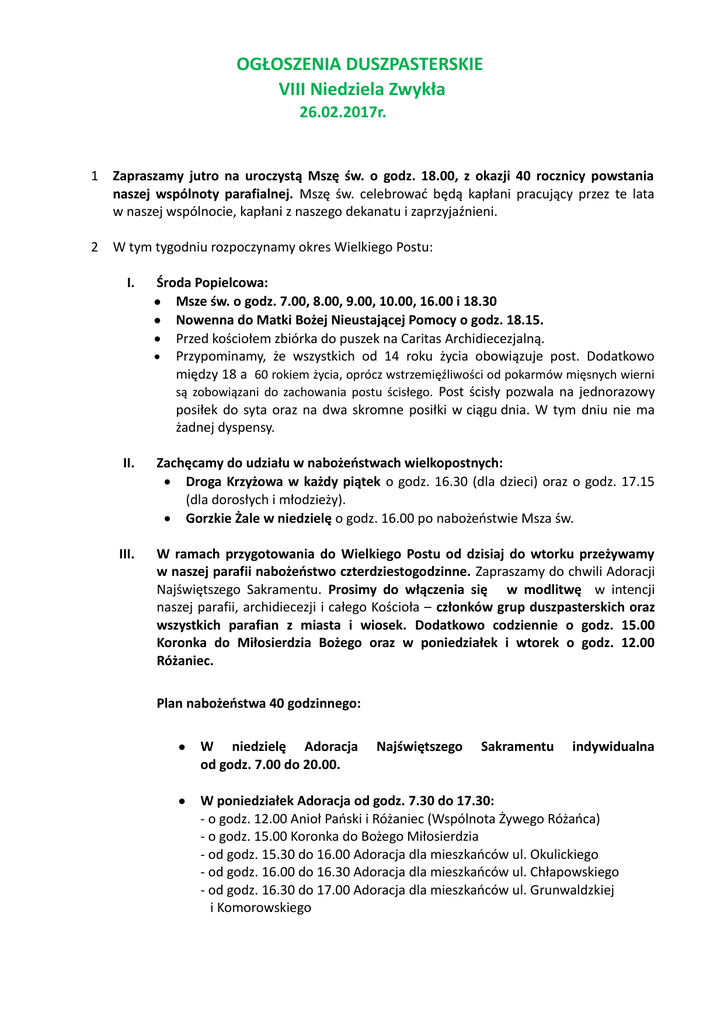 OGŁOSZENIA DUSZPASTERSKIE VIII Niedziela Zwykła 26.02.2017r. 1 Zapraszamy jutro na uroczystą Mszę św. o godz. 18.00, z okazji 40 rocznicy powstania naszej wspólnoty parafialnej. Mszę św. celebrować będą kapłani pracujący przez te lata w naszej wspólnocie, kapłani z naszego dekanatu i zaprzyjaźnieni. 2 W tym tygodniu rozpoczynamy okres Wielkiego Postu: I. Środa Popielcowa: Msze św. o godz. 7.00, 8.00, 9.00, 10.00, 16.00 i 18.30 Nowenna do Matki Bożej Nieustającej Pomocy o godz. 18.15. Przed kościołem zbiórka do puszek na Caritas Archidiecezjalną. Przypominamy, że wszystkich od 14 roku życia obowiązuje post. Dodatkowo między 18 a 60 rokiem życia, oprócz wstrzemięźliwości od pokarmów mięsnych wierni są zobowiązani do zachowania postu ścisłego. Post ścisły pozwala na jednorazowy posiłek do syta oraz na dwa skromne posiłki w ciągu dnia. W tym dniu nie ma żadnej dyspensy. II. Zachęcamy do udziału w nabożeństwach wielkopostnych: Droga Krzyżowa w każdy piątek o godz. 16.30 (dla dzieci) oraz o godz. 17.15 (dla dorosłych i młodzieży). Gorzkie Żale w niedzielę o godz. 16.00 po nabożeństwie Msza św. III. W ramach przygotowania do Wielkiego Postu od dzisiaj do wtorku przeżywamy w naszej parafii nabożeństwo czterdziestogodzinne. Zapraszamy do chwili Adoracji Najświętszego Sakramentu. Prosimy do włączenia się w modlitwę w intencji naszej parafii, archidiecezji i całego Kościoła – członków grup duszpasterskich oraz wszystkich parafian z miasta i wiosek. Dodatkowo codziennie o godz. 15.00 Koronka do Miłosierdzia Bożego oraz w poniedziałek i wtorek o godz. 12.00 Różaniec. Plan nabożeństwa 40 godzinnego: W niedzielę Adoracja od godz. 7.00 do 20.00. W poniedziałek Adoracja od godz. 7.30 do 17.30: - o godz. 12.00 Anioł Pański i Różaniec (Wspólnota Żywego Różańca) - o godz. 15.00 Koronka do Bożego Miłosierdzia - od godz. 15.30 do 16.00 Adoracja dla mieszkańców ul. Okulickiego - od godz. 16.00 do 16.30 Adoracja dla mieszkańców ul. Chłapowskiego - od godz. 16.30 do 17.00 Adoracja dla mieszkańców ul. Grunwaldzkiej i Komorowskiego Najświętszego Sakramentu indywidualna We wtorek Adoracja od godz. 7.30 do 18.00: - o godz. 12.00 Anioł Pański i Różaniec (Wspólnota Żywego Różańca) - o godz. 15.00 Koronka do Bożego Miłosierdzia - od godz. 15.30 do 16.00 Adoracja dla mieszkańców ul. Paderewskiego, Konstytucji 3 Maja, Chopina i Szymanowskiego - od godz. 16.00 do 16.30 Adoracja dla mieszkańców wiosek - od godz. 16.30 do 18.00 Adoracja prowadzona przez Grupy Duszpasterskie ( o godz. 17.15 Różaniec do Siedmiu Boleści Matki Bożej – prowadzi ADS). 3 Spotkania grup duszpasterskich: Duszpasterstwo młodzieży w piątek o godz. 19.00. Rodzina Radia Maryja – spotkanie w piątek po Mszy św. wieczornej. Msza św. wynagradzająca Niepokalanemu Sercu Maryi w sobotę o godz. 7.30, później różaniec. Zbiórka ministrantów oraz kandydatów w sobotę o godz. 10.00 w zakrystii. W Nochowie wspólnota Żywego Różańca w sobotę o godz. 17.00 Msza św. Żywy Różaniec i Straż Honorowa NSJ różaniec w niedzielę po Mszy św. o godz. 7.30 w dolnym kościele. 4 W środę zapraszamy do KCEK na wspomnienie słowno – muzyczne oraz koncert pieśni patriotycznych z okazji Dnia Pamięci Żołnierzy Niezłomnych o godz. 19.30. Wstęp wolny. 5 W tym tygodniu I Piątek: Spowiedź św. od godz. 9.00 do 12.00 oraz od 15.00 do 17.30 – kościół dolny oraz od 17.30 do 19.00 w kościele górnym. W Nochowie o godz. 10.00 Msza św. i objazd chorych z wiosek. 6 W sobotę: Święto św. Kazimierza O godz. 9.00 Msza św. o dary Ducha Św. z nałożeniem rąk. Od godz. 10.00 odwiedziny chorych z posługa sakramentalną w mieście. Biuro Parafialne nieczynne. 7 W tym tygodniu spotkania dla kandydatów do bierzmowania z klas III według ustalonego harmonogramu. 8 W tym tygodniu odszedł do Pana: śp. Marian Owczarzak. Wieczny odpoczynek… 9 Polecamy prasę katolicką. 10 Zapraszamy do parafialnej kawiarni Emaus, na pączki.