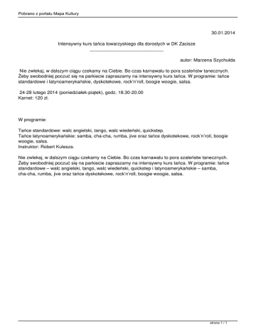Pobrano z portalu Mapa Kultury 30.01.2014 Intensywny kurs tańca towarzyskiego dla dorosłych w DK Zacisze ____________________________ autor: Marzena Szychułda Nie zwlekaj, w dalszym ciągu czekamy na Ciebie. Bo czas karnawału to pora szaleństw tanecznych. Żeby swobodniej poczuć się na parkiecie zapraszamy na intensywny kurs tańca. W programie: tańce standardowe i latynoamerykańskie, dyskotekowe, rock’n’roll, boogie woogie, salsa. 24-28 lutego 2014 (poniedziałek-piątek), godz. 18.30-20.00 Karnet: 120 zł. W programie: Tańce standardowe: walc angielski, tango, walc wiedeński, quickstep. Tańce latynoamerykańskie: samba, cha-cha, rumba, jive oraz tańce dyskotekowe, rock’n’roll, boogie woogie, salsa. Instruktor: Robert Kulesza. Nie zwlekaj, w dalszym ciągu czekamy na Ciebie. Bo czas karnawału to pora szaleństw tanecznych. Żeby swobodniej poczuć się na parkiecie zapraszamy na intensywny kurs tańca. W programie: tańce standardowe – walc angielski, tango, walc wiedeński, quickstep i latynoamerykańskie – samba, cha-cha, rumba, jive oraz tańce dyskotekowe, rock’n’roll, boogie woogie, salsa. strona 1 / 1