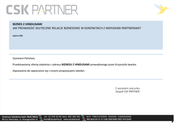 BIZNES Z HINDUSAMI JAK PROWADZIĆ SKUTECZNE RELACJE BIZNESOWE W KONTAKTACH Z INDYJSKIMI PARTNERAMI? OFERTA PDF Szanowni Państwo, Przedstawiamy ofertę szkolenia z zakresu BIZNESU Z HINDUSAMI prowadzanego przez Krzysztofa Iwanka. Zapraszamy do zapoznania się z innymi propozycjami szkoleń. Z wyrazami szacunku Zespół CSK PARTNER BIZNES Z HINDUSAMI JAK PROWADZIĆ SKUTECZNE RELACJE BIZNESOWE W KONTAKTACH Z INDYJSKIMI PARTNERAMI? SPIS TREŚCI 2. 3. 4. 5. 6. 7. 8. 9. SPIS TREŚCI OPIS SZKOLENIA KORZYŚCI DLA UCZESTNIKA SZKOLENIA PROGRAM PROGRAM (C.D.) METODYKA PROWADZENIA ZAJĘĆ EKSPERT INFORMACJE ORGANIZACYJNE SZKOLENIA OTWARTEGO Treść niniejszej oferty stanowi tajemnicę handlową oferenta, zgodnie z art. 11 ustawy z 16.04.1993 r. o zwalczaniu nieuczciwej konkurencji (Dz. U. Z 1993r Nr 47, poz. 211, z poź. zm.) 2 BIZNES Z HINDUSAMI JAK PROWADZIĆ SKUTECZNE RELACJE BIZNESOWE W KONTAKTACH Z INDYJSKIMI PARTNERAMI? OPIS SZKOLENIA Zapraszamy do uczestnictwa w szkoleniu które odbędzie się w Warszawie. Na Szkoleniu Ekspert Krzysztof Iwanek kompleksowo scharakteryzuje rynek indyjski. Dzięki wiedzy zdobytej podczas naszego szkolenia, biznes z Hindusami nie będzie dla Państwa tajemnicą. Uczestnicy dowiedzą się jak współpracować, negocjować oraz komunikować się z Hindusami. Szkolenie skierowane jest zarówno do osób, które planują współpracę z indyjskimi partnerami jak i dla tych, którzy mają z nimi do czynienia na co dzień. Treść niniejszej oferty stanowi tajemnicę handlową oferenta, zgodnie z art. 11 ustawy z 16.04.1993 r. o zwalczaniu nieuczciwej konkurencji (Dz. U. Z 1993r Nr 47, poz. 211, z poź. zm.) 3 BIZNES Z HINDUSAMI JAK PROWADZIĆ SKUTECZNE RELACJE BIZNESOWE W KONTAKTACH Z INDYJSKIMI PARTNERAMI? UCZESTNICY SZKOLENIA BĘDĄ MIELI OKAZJĘ: • • • • • • • pogłębić wiedzę na temat współczesnej sytuacji społecznej i gospodarczej Indii; pogłębić wiedzę o indyjskiej kulturze biznesowej: zachowaniach, normach i wartościach, które kształtują zawodową sferę życia; poznać hinduskie podejście do biznesu, poznać różnice kulturowe, bariery komunikacyjne oraz sposób myślenia Hindusów; poznać zasady jak współpracować z partnerami z Indii (zwyczaje, etykieta, zwroty grzecznościowe); skonsultować z Wykładowcą swoje dotychczasowe kontakty z indyjskimi partnerami; wyjaśnić przyczyny najczęstszych nieporozumień co umożliwi unikanie podobnych kłopotów w przyszłości. Treść niniejszej oferty stanowi tajemnicę handlową oferenta, zgodnie z art. 11 ustawy z 16.04.1993 r. o zwalczaniu nieuczciwej konkurencji (Dz. U. Z 1993r Nr 47, poz. 211, z poź. zm.) 4 BIZNES Z HINDUSAMI JAK PROWADZIĆ SKUTECZNE RELACJE BIZNESOWE W KONTAKTACH Z INDYJSKIMI PARTNERAMI? PROGRAM SZKOLENIA - (AUTOR: KRZYSZTOF IWANEK) 1. GOSPODARKA INDYJSKA A JEJ WPŁYW NA INDYJSKĄ KULTURĘ BIZNESU A. Charakterystyka podstawowych sektorów indyjskiej gospodarki, ich siły i słabości b. Indyjskie firmy na rynku światowym c. Sposób działania indyjskich firm d. Przykłady sukcesów i porażek zagranicznych firm na rynku indyjskim i wypływające z tego wnioski. 2. USTRÓJ REPUBLIKI INDII A JEGO ZNACZENIE DLA BUDOWY RELACJI BIZNESOWYCH A. Federalna struktura republiki, kompetencje rządu centralnego i rządów stanowych w dziedzinie gospodarki b. Znaczenie rządów regionalnych (im bardziej postępuje liberalizacja rynku, tym mniejsza jest ingerencja rządu centralnego, ale większe znaczenie rządów regionalnych), konieczność analizowania rynków i rządów poszczególnych stanów indii, a nie całości c. Polityki gospodarcze rządów stanowych i polityka rządu centralnego d. Kampania ,,make in india’’ e. Realia prawne funkcjonowania firmy w indiach f. Kwestia łapówek i korupcji Treść niniejszej oferty stanowi tajemnicę handlową oferenta, zgodnie z art. 11 ustawy z 16.04.1993 r. o zwalczaniu nieuczciwej konkurencji (Dz. U. Z 1993r Nr 47, poz. 211, z poź. zm.) 5 BIZNES Z HINDUSAMI JAK PROWADZIĆ SKUTECZNE RELACJE BIZNESOWE W KONTAKTACH Z INDYJSKIMI PARTNERAMI? PROGRAM SZKOLENIA - (AUTOR: KRZYSZTOF IWANEK) 3. INDYJSKA KULTURA I SPOŁECZEŃSTWO I JEJ WPŁYW NA INDYJSKĄ KULTURĘ BIZNESU A. Ubóstwo jako czynnik warunkujący strategię biznesmenów (chęć działania na wszystkich frontach) b. Relacje rodzinne jako czynnik w kulturze biznesu (to, co należy do rodziny opisywane jest jako wspólne: gdy rozmówca mówi ,,mam hotel’’ może mieć na myśli ,,mój wujek ma hotel’’); c. Stosunek do czasu i działanie ,,na deadline’’ d. Targowanie się (jest nieodłączną częścią życia w indiach, ale jego brak wcale nie jest despektem) 4. ETYKIETA W KONTAKCIE Z OSOBAMI W INDII A. Formalizmy: sposoby witania się i żegnania, tytułowania się b. Relacje damsko-męskie c. Etykieta przy stole d. Mowa ciała 5. PANEL KONSULTACYJNY Treść niniejszej oferty stanowi tajemnicę handlową oferenta, zgodnie z art. 11 ustawy z 16.04.1993 r. o zwalczaniu nieuczciwej konkurencji (Dz. U. Z 1993r Nr 47, poz. 211, z poź. zm.) 6 BIZNES Z HINDUSAMI JAK PROWADZIĆ SKUTECZNE RELACJE BIZNESOWE W KONTAKTACH Z INDYJSKIMI PARTNERAMI? METODY PROWADZENIA SZKOLENIA Szkolenie prowadzone jest wykładem połączonym z prezentacją power – point. Część zajęć będzie jednak miała charakter interaktywny – słuchacze dostaną zadania do analizy, pokazany zostanie także krótki film, pokazujący relacje międzykulturowe. Treść niniejszej oferty stanowi tajemnicę handlową oferenta, zgodnie z art. 11 ustawy z 16.04.1993 r. o zwalczaniu nieuczciwej konkurencji (Dz. U. Z 1993r Nr 47, poz. 211, z poź. zm.) 7 BIZNES Z HINDUSAMI JAK PROWADZIĆ SKUTECZNE RELACJE BIZNESOWE W KONTAKTACH Z INDYJSKIMI PARTNERAMI? EKSPERT – KRZYSZTOF IWANEK Indolog; nauczyciel języka hindi, dyrektor Ośrodka Badań nad Azją w Akademii Obrony Narodowej, wykładowca w Zakładzie Azji Południowej. Ekspert ds. Indii w Centrum Studiów Polska-Azja. Autor publikacji o Indiach, w tym