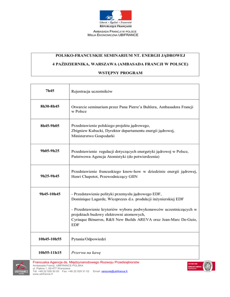 AMBASADA FRANCJI W POLSCE MISJA EKONOMICZNA UBIFRANCE POLSKO-FRANCUSKIE SEMINARIUM NT. ENERGII JĄDROWEJ 4 PAŹDZIERNIKA, WARSZAWA (AMBASADA FRANCJI W POLSCE) WSTĘPNY PROGRAM 7h45 Rejestracja uczestników 8h30-8h45 Otwarcie seminarium przez Pana Pierre’a Buhlera, Ambasadora Francji w Polsce 8h45-9h05 Przedstawienie polskiego projektu jądrowego, Zbigniew Kubacki, Dyrektor departamentu energii jądrowej, Ministerstwo Gospodarki 9h05-9h25 Przedstawienie regulacji dotyczących energetyki jądrowej w Polsce, Państwowa Agencja Atomistyki (do potwierdzenia) 9h25-9h45 9h45-10h45 Przedstawienie francuskiego know-how w dziedzinie energii jądrowej, Henri Chapotot, Przewodniczący GIIN - Przedstawienie polityki przemysłu jądrowego EDF, Dominique Lagarde, Wiceprezes d.s. produkcji inżynierskiej EDF - Przedstawienie kryteriów wyboru podwykonawców uczestniczących w projektach budowy elektrowni atomowych, Cyriaque Bénarros, R&S New Builds AREVA oraz Jean-Marc De-Guio, EDF 10h45-10h55 Pytania/Odpowiedzi 10h55-11h15 Przerwa na kawę Francuska Agencja ds. Międzynarodowego Rozwoju Przedsiębiorstw Ambasada Francji, UBIFRANCE POLSKA ul. Piękna 1, 00-477 Warszawa Tél. +48 22 529 30 00 Fax: +48 22 529 31 02 www.ubifrance.fr Email: [email protected] 11h15-11h40 Jak współpracować z zagranicznym partnerem: doświadczenia przedsiębiorstw francuskich prowadzących działalność w Polsce w sektorze energetycznym, Areva, EDF 11h40-12h00 Jak współpracować z zagranicznym partnerem: doświadczenia przedsiębiorstw polskich, Jacek Fałtynowicz, Prezes zarządu firmy Elektrobudowy 12h00-13h00 Krótka prezentacja firm francuskich 13h00-13h30 Lunch 13h30-18h00 Spotkania biznesowe z udziałem Areva/EDF oraz polskich firm z sektora budownictwa energetycznego i francuskich firm z sektora energii jądrowej. 18h00 Zakończenie seminarium Page 2 sur 2