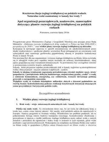 Kosztowna iluzja Ŝeglugi śródlądowej na polskich wodach. Naturalne rzeki zamieniamy w kanały bez wody ? Apel organizacji pozarządowych, naukowców, samorządów dotyczący planów rozwoju Ŝeglugi śródlądowej na polskich rzekach Warszawa, czerwiec-lipiec 2016r Przygotowane przez Ministerstwo śeglugi i Gospodarki Morskiej oraz przyjęte przez Radę Ministrów „ZałoŜenia rozwoju śródlądowych dróg wodnych w Polsce na lata 2016-2020 z perspektywą do 2030 r.” oraz wielkie plany rozwoju Ŝeglugi śródlądowej są nierealne. Koncepcja ta nawiązuje zapewne w sposób niezamierzony do zdyskredytowanych przez skutki środowiskowe i społeczne planów sowieckiej Rosji polegających na zawracaniu rzek syberyjskich oraz reanimuje gierkowską gigantomanię obecną w projekcie kaskadyzacji Wisły w latach 70 tych. Nie powinna być dla nas argumentem i wzorem Ŝegluga śródlądowa na Renie, która rozwijała się w ubiegłym wieku przy zupełnie innym stosunku do ochrony bioróŜnorodności, innej epoce gospodarczej oraz warunkach klimatycznych. Tu powinniśmy być szczególnie ostroŜni w przenoszeniu wzorców krajów zachodnich. Szkody, które przyniesie zupełne przekształcenie rzek w kanały Ŝeglowne są niewspółmierne wobec obiecywanych - naszym zdaniem wątpliwych - zysków. Szkody te obejmą zwiększenie zagroŜenia powodziowego, równieŜ skutków suszy, straty gospodarcze i powiększenie deficytu budŜetowego, niepotrzebną groźbę „walki” o wodę z sektorem komunalnym, energetyką, czy rolnictwem, wreszcie dewastacje polskiej przyrody o europejskim znaczeniu. Wątpliwe zyski, to wydanie dziesiątków miliardów złotych z kieszeni podatników na rozwój branŜy hydrotechnicznej podczas realizacji kosztownych inwestycji niszczących cenne przyrodniczo i turystycznie polskie rzeki. Szczegółowe uzasadnienie I. Wielkie plany rozwoju Ŝeglugi śródlądowej 1. Brak wody - wizja zniszczonych naturalnych rzek - kanały bez wody Polska ma mało wody. To stwierdzenie dziwi nas, bo od wielu lat odkręcamy kran, a woda leci, często coraz lepszej jakości. Ale zasoby wód polskich naleŜą do najniŜszych w Europie. Autorzy programu to świetnie wiedzą. Wielokrotnie ten problem podnosili, ale tu jednostronnie forsują interes budowy transportu rzecznego. Konsekwentnie zbudowana i prowadzona w oparciu o środki publiczne Ŝegluga śródlądowa moŜe zabrać wodę z innych dziedzin i prowadzić do ograniczeń i braku wody w kranach w tych rejonach, gdzie woda pochodzi z ujęć powierzchniowych. Wskazujemy na ocieplanie się klimatu Polski oraz wpływ na bilans wody w gospodarce („Wpływ zmian klimatycznych na bilans wodny w dorzeczu 1 Odry i Wisły w kontekście wybranych dziedzin gospodarki”, dr Sylwestra Kraśnickiego, 2016; cytaty poniŜej kursywą pochodzą z tego opracowania). Prognozy mówią, Ŝe „Na podstawie obecnych scenariuszy zmian klimatu dla Polski naleŜy się spodziewać zmniejszenia się odpływu całkowitego wód o około 37% w ciągu 110 lat (lata 2071-2090 względem lat 1971-1980). Zmniejszenie odpływu całkowitego oznacza zmniejszenie się odnawialnych zasobów wód Polski, a juŜ obecnie są one jednymi z najniŜszych w Unii Europejskiej w przeliczeniu na mieszkańca…” Najwięksi odbiorcy wody są skazani na prawdopodobne konflikty o wodę: „Za większość poborów wód w Polsce odpowiadają procesy produkcyjne, a zwłaszcza energetyka oparta na spalaniu węgla, następnie jest to pobór wód przez sieci wodociągowe i nawodnienia. Energetyka oparta na węglu jest najbardziej wraŜliwa na niedobory wody, a taka sytuacja jak podczas suszy 2015 r. będzie się zdarzała coraz częściej.” MoŜliwe są „wojny” o zasoby wody. „Zmniejszające się zasoby wód powierzchniowych mogą być powodem sytuacji konfliktowych pomiędzy rolnikami i właścicielami stawów wykorzystujących je do nawadniania pól oraz do napełniania stawów rybnych.” A przecieŜ, wraz z narastającym się ociepleniem i powtarzającymi się suszami, naleŜy się spodziewać masowego rozwoju systemów do nawadniania pól, jak na południu Europy. Istnieje groźba wskazywana w tytule - zbudowanie kanałów z rzek, w których nie będzie wody: „Zmniejszające się zasoby wód podziemnych stawiają pod znakiem zapytania zasadność inwestycji w utrzymanie i rozbudowę Ŝeglowności dróg wodnych Odry i Wisły. W górnych odcinkach tych rzek juŜ obecnie zasoby wody mogą się okazać niewystarczające, a zmiany klimatu dodatkowo to zjawisko pogłębią.” 2. Nierealnie sformułowane efekty gospodarcze i transportowe. Brak uzasadnienia ekonomicznego realizacji planów. Autorzy „ZałoŜeń rozwoju śródlądowych dróg wodnych w Polsce na lata 2016-20 z perspektywą do 2030 r.” przedstawiają jednostronnie korzyści jak: • wzrost udziału przewozów Ŝeglugi śródlądowej na rzekach • związany z powyŜszym wzrost konkurencyjności portów morskich ujścia Odry i Wisły z powodu pojawienie się Ŝeglugi • aktywizacja gospodarcza i poprawa warunków Ŝeglugi pasaŜerskiej i turystycznorekreacyjnej • poprawa bezpieczeństwa powodziowego • produkcja odnawialnej energii na powstałych piętrzeniach na rzekach. Korzyści te są mocno wątpliwe z wielu powodów, m in. ze względu na wyŜej pokazaną wielce prawdopodobną niedostateczną ilość wody do tak zamierzonych planów wielkiej regulacji rzek i Ŝeglugi na nich oraz konflikt z innymi potrzebami gospodarczymi. ZałoŜenia tego rozwoju nie są zrównowaŜone. Projekt jest napisany przez jedną grupę interesów, która nie ogląda się na inne potrzeby państwa, społeczeństwa i środowiska. Autorzy nie dostrzegają naturalnych sprzeczności. I tak Ŝegluga wymagać będzie magazynowania wody w zbiornikach wielofunkcyjnych do – rzadko poza Polską stosowanego – zasilania spływów barek podczas – częstych w Polsce niskich stanów wody. Ochrona przeciwpowodziowa powinna mieć te zbiorniki p