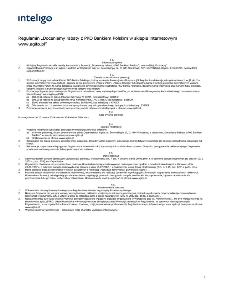 Regulamin „Doceniamy rabaty z PKO Bankiem Polskim w sklepie internetowym www.agito.pl” 1. 2. 1. 2. 3. § 1. Informacje ogólne Niniejszy Regulamin określa zasady korzystania z Promocji „Doceniamy rabaty z PKO Bankiem Polskim”, zwana dalej „Promocją”. Organizatorem Promocji jest: Agito z siedzibą w Warszawie przy ul. Żeromskiego 17, 01-844 Warszawa, NIP: 5272380769, Regon: 015206780, zwana dalej „Organizatorem”. § 2. Zasady uczestnictwa w promocji W Promocji mogą brać udział klienci PKO Banku Polskiego, którzy w okresie Promocji określonym w §3 Regulaminu dokonają zakupów opisanych w §2 pkt 2 w sklepie internetowym www.agito.pl i zapłacą za nie przelewem „Płacę z iPKO”, „Płacę z Inteligo” lub dowolną kartą z funkcją płatności internetowych wydaną przez PKO Bank Polski, tj. kartą debetową wydaną do dowolnego konta osobistego PKO Banku Polskiego, dowolną kartą kredytową oraz kartami typu Business, kartami Inteligo, kartami przedpłaconymi oraz kartami typu charge. Promocja polega na przyznaniu przez Organizatora rabatów od ceny wybranych produktów, po wpisaniu określonego niżej kodu rabatowego na stronie sklepu internetowego www.agito.pl/PKO: a) 100,00 zł rabatu na zakup tabletu MSI Primo 76-014PL- kod rabatowy: BDDA4F b) 100,00 zł rabatu na zakup tabletu ASUS Fonepad ME371MG-1I068A, kod rabatowy: B28BCM c) 50,00 zł rabatu na zakup dowolnego tabletu SAMSUNG, kod rabatowy : 4740CR d) Oferowania za 1 zł zestawu torba na laptop i mysz przy zakupie dowolnego laptopa, kod rabatowy: 2320EJ Promocja nie łączy się z innymi ofertami promocyjnymi i rabatowymi dostępnymi w sklepie www.agito.pl. § 3. Czas trwania promocji Promocja trwa od 10 marca 2014 roku do 15 kwietnia 2014 roku 1. 2. 3. 1. 2. 3. 4. 1. 2. 3. 4. § 4. Skargi i reklamacje Wszelkie reklamacje lub skargi dotyczące Promocji powinny być składane: a) w formie pisemnej, listem poleconym na adres Organizatora: Agito, ul. Żeromskiego 17, 01-844 Warszawa, z dopiskiem „Doceniamy Rabaty z PKO Bankiem Polskim” w sklepie internetowym www.agito.pl b) elektronicznie na stronie www.agito.pl Reklamacje lub skargi powinny zawierać imię, nazwisko, dokładny adres nadawcy, opis usługi, której dotyczy reklamacja jak również uzasadnienie reklamacji lub skargi. Reklamacje rozpatrywane będą przez Organizatora w terminie 14 (czternastu) dni od dnia ich otrzymania. O wyniku postępowania reklamacyjnego Organizator powiadomi nadawcę pisemnie listem poleconym lub mailowo. § 5. Dane osobowe Administratorem danych osobowych Uczestników promocji, w rozumieniu art. 7 pkt. 4 Ustawy z dnia 29.08.1997 r. o ochronie danych osobowych (tj. DzU nr 101 z 2002 r., poz. 926) jest Organizator. Organizator oświadcza, że wszystkie dane osobowe Uczestników będą przechowywane i zabezpieczone zgodnie z zasadami określonymi w Ustawie z dnia 29.08.1997 r. o ochronie danych osobowych oraz Ustawie z dnia 18.07.2002 r. o świadczeniu usług drogą elektroniczną (DzU nr 144, poz. 1204 z poźn. zm.). Dane osobowe będą przetwarzane w celach związanych z Promocją (realizacja zamówienia, przyznanie rabatu). Podanie danych osobowych ma charakter dobrowolny, lecz niezbędny do realizacji uprawnień wynikających z Promocji i rozpatrzenia ewentualnych reklamacji. Uczestnikom Promocji udostępniającym dane osobowe przysługują prawa do dostępu do danych, możliwości ich poprawiania, żądania zaprzestania ich przetwarzania lub sprzeciwu wobec ich przetwarzania. Uprawnienia te można wykonać na stronie www.agito.pl. § 6. Postanowienia końcowe W kwestiach nieuregulowanych niniejszym Regulaminem stosuje się przepisy Kodeksu cywilnego. Niniejsza Promocja nie jest grą losową, loterią fantową, zakładem wzajemnym ani loterią promocyjną, których wynik zależy od przypadku (przeprowadzenie losowania) w rozumieniu art. 2 ustawy z dnia 19 listopada 2009 o grach hazardowych (DzU nr 201, poz. 1540, z późn. zm.). Regulamin przez cały czas trwania Promocji dostępny będzie do wglądu w siedzibie Organizatora w Warszawie przy ul. Mokotowskiej 1, 00-640 Warszawa oraz na stronie www.agito.pl/PKO. Udział Uczestnika w Promocji oznacza akceptację zasad Promocji zawartych w Regulaminie. W sprawach nieuregulowanych Regulaminem, w szczególności w kwestii zakupu towarów, mają zastosowanie postanowienia Regulaminu sklepu internetowego www.agito.pl dostępne na stronie www.agito.pl Wszelkie materiały promocyjno – reklamowe mają charakter wyłącznie informacyjny. 1
