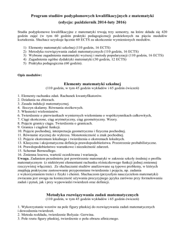 Program studiów podyplomowych kwalifikacyjnych z matematyki (edycja: październik 2014-luty 2016) Studia podyplomowe kwalifikacyjne z matematyki trwają trzy semestry, na które składa się 420 godzin zajęć (w tym 60 godzin praktyki pedagogicznej) podzielonych na pięciu modułów kształcenia. Słuchacz uzyskuje łącznie 60 ECTS za ukończenie wymienionych modułów. 1) 2) 3) 4) 5) Elementy matematyki szkolnej (110 godzin, 16 ECTS) Metodyka rozwiązywania zadań matematycznych (110 godzin, 16 ECTS) Wybrane zagadnienia matematyki wyższej i metody popularyzacji (110 godzin, 16 ECTS) Zagadnienia ogólne dydaktyki matematyki (30 godzin, 12 ECTS) Praktyka pedagogiczna (60 godzin). Opis modułów: Elementy matematyki szkolnej (110 godzin, w tym 45 godzin wykładów i 65 godzin ćwiczeń) 1. Elementy rachunku zdań. Rachunek kwantyfikatorów. 2. Działania na zbiorach. 3. Zasada indukcji matematycznej. 4. Iloczyn skalarny. Równania stożkowych. 5. Własności wielomianów. 6. Twierdzenie o pierwiastkach wymiernych wielomianu o współczynnikach całkowitych, 7. Ciągi skończone, ciąg arytmetyczny, ciąg geometryczny. Wzory. 8. Pojęcie granicy ciągu. Twierdzenia o granicach. 9. Granica i ciągłość funkcji. 10. Pojęcie pochodnej, interpretacja geometryczna i fizyczna pochodnej. 11. Równanie stycznej do wykresu. Monotoniczność a znak pochodnej. 12. Pojęcie ekstremum lokalnego i twierdzenia o ekstremach lokalnych. 13. Klasyczna i aksjomatyczna definicja prawdopodobieństwa. Przestrzenie probabilistyczne. 14. Prawdopodobieństwo warunkowe i niezależność zdarzeń. 15. Schemat Bernoullego. 16. Zmienna losowa, wartość oczekiwana i wariancja. Uwaga. Zadaniem przedmiotu jest powtórzenie matematyki w zakresie szkoły średniej o profilu matematycznym (z niektórymi elementami rachunku różniczkowego funkcji jednej zmiennej rzeczywistej włącznie). Ze słuchaczami studiów analizowane są typowe problemy, w których znajdują praktyczne zastosowanie przypomniane twierdzenia i pojęcia, np. zadania z wykorzystaniem treści z fizyki i chemii. Słuchaczom (przyszłym nauczycielom matematyki) zwracana jest uwaga na konieczność używania precyzyjnego języka zarówno przy formułowaniu zadań i pytań, jak i przy wypowiedzi twierdzeń oraz definicji. Metodyka rozwiązywania zadań matematycznych (110 godzin, w tym 45 godzin wykładów i 65 godzin ćwiczeń) 1. Wykorzystanie wzorów na pole figury płaskiej do rozwiązywania zadań matematycznych i dowodzenia twierdzeń. 2. Metoda rozkładu, twierdzenie Bolyaia- Gerwina. 3. Pole rzutu figury płaskiej, twierdzenie o polu obrazu afinicznego. Program studiów podyplomowych kwalifikacyjnych z matematyki (edycja: październik 2014-luty 2016) 4. Stosunek pól figur podobnych i stosunek objętość brył podobnych. 5. Problematyka twierdzenia Pitagorasa i twierdzenia Talesa. 6. Układy pozycyjne różne od dziesiątkowego. 7. Ułamki łańcuchowe. 8. Kongruencje. 9. Pierścienie reszt. 10. Problematyka Małego Twierdzenia Fermata. 11. Nierówności klasyczne. 12. Zadania na ekstrema z wykorzystaniem nierówności. 13. Zadania o wielomianach. 14. Rozkładanie na czynniki, pierwiastki wielokrotne, wzór dwumianowy Newtona. 15. Nietypowe zadania konstrukcyjne. 16. Zadania z wykorzystaniem treści z fizyki i nauk technicznych. Wybrane zagadnienia matematyki wyższej i metody popularyzacji (110 godzin, w tym 45 godzin wykładów i 65 godzin ćwiczeń) 1. Praktyczne przykłady rozumowań logicznych. 2. Liczby naturalne – liczby pierwsze, liczby Fermata – wielokąty foremne i ich konstruowalność. 3. Przykłady nierozwiązanych problemów matematycznych. Wielkie Twierdzenie Fermata. Hipoteza Goldbacha. 4. Twierdzenie o rozmieszczeniu liczb pierwszych, hipoteza Riemanna. 5. Najważniejsze pojęcia matematyki współczesnej. Rozmaitości. 6. Typowe i nietypowe konstrukcje geometryczne. 7. Liczby algebraiczne. 8. Twierdzenie Wantzela. 9. Stefan Banach i lwowska szkoła matematyczna. 10. Wybrane twierdzenia geometrii elementarnej. Punkty charakterystyczne trójkata. 11. Elementarne własności wielościanów (wielościany foremne , wielościany archimedesowe). 12. Modele geometrii nieeuklidesowych. 13. Elementy geometrii rzutowej i modele płaszczyzny rzutowej. 14. Wybrane dziedziny matematyki (nieobecne w programach szkolnych). 15. Przykłady rozwiązań problemów dotyczących poszczególnych haseł zawartych w programie wykładu. Zagadnienia ogólne dydaktyki matematyki (30 godzin, w tym 12 godzin wykładów i 18 godzin ćwiczeń) 1. Zagadnienia matematyki szkolnej dla II i III etapu edukacyjnego zawarte w podstawie programowej kształcenia ogólnego. 2. Metody i formy pracy stosowane na lekcjach matematyki. 3. Wykorzystywanie różnych reprezentacji przy wprowadzaniu pojęć matematycznych. 4. Zasady nauczania czynnościowego. 5. Nauczanie spiralne. 6. Zasady oceniania uczniów. 7. Procedury diagnozowania osiągnięć uczniów. 8. Budowanie narzędzi pomiaru dydaktycznego w zakresie badania umiejętności matematycznych. 9. Wspieranie uczniów o specjalnych potrzebach edukacyjnych. 10. Rozpoznawanie trudności i uzdolnień. 11. Indywidualizacja procesu nauczania. Program studiów podyplomowych kwalifikacyjnych z matematyki (edycja: październik 2014-luty 2016) Praktyka pedagogiczna (60 godzin) Praktyka pedagogiczna obejmuje 60 godzin zajęć w dwóch typach szkół: 30 godzin w szkole podstawowej w klasach 4-6 i 30 godzin w gimnazjum w klasach 1-3 w zakresie matematyki. Organizacja i przebieg praktyki: Słuchacz zobowiązany jest do zgłoszenia się w dyrekcji szkoły celem skierowania go do nauczyciela opiekuna. Nauczyciel opiekun ustala ze słuchaczem szczegółowy plan zajęć. Każdorazowo po zajęciach omawia ze słuchaczem ich przebieg, komentując w szczególności hospitowane lekcje i lekcje prowadzone samodzielnie przez studenta. W czasie odbywania praktyki słuchacz podlega obowiązującej w szkole dyscyplinie pracy. Słuchacz prz