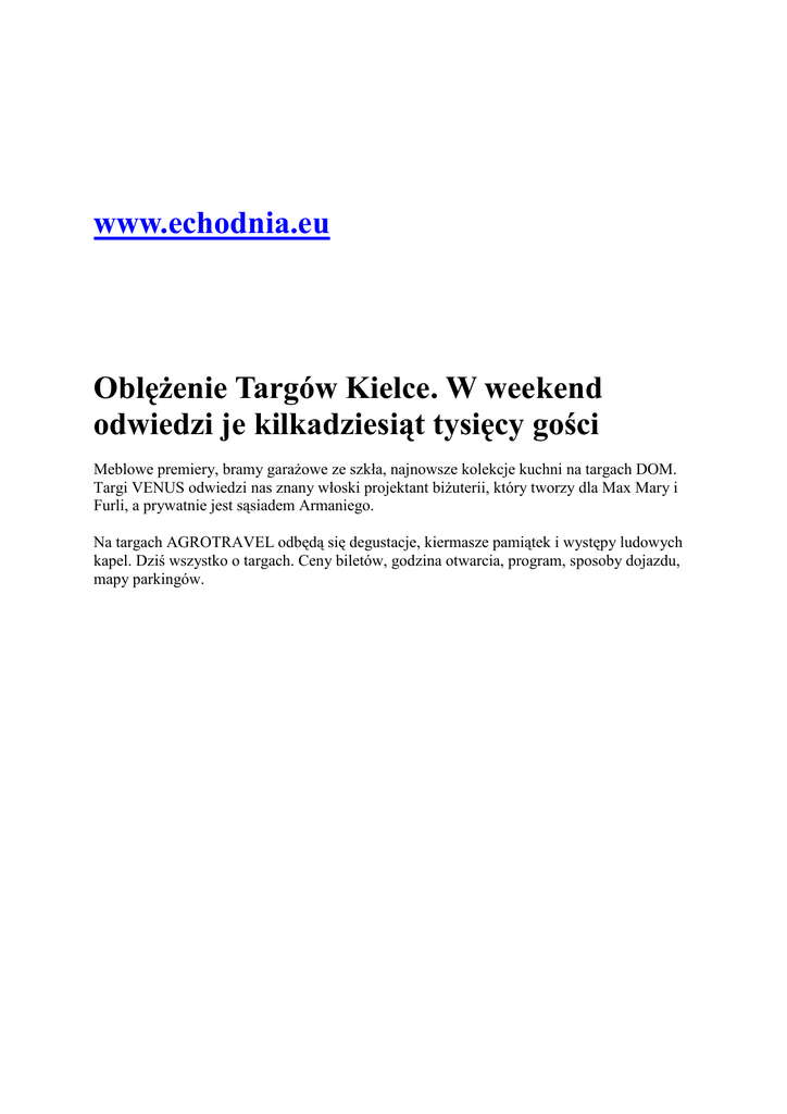 www.echodnia.eu Oblężenie Targów Kielce. W weekend odwiedzi je kilkadziesiąt tysięcy gości Meblowe premiery, bramy garażowe ze szkła, najnowsze kolekcje kuchni na targach DOM. Targi VENUS odwiedzi nas znany włoski projektant biżuterii, który tworzy dla Max Mary i Furli, a prywatnie jest sąsiadem Armaniego. Na targach AGROTRAVEL odbędą się degustacje, kiermasze pamiątek i występy ludowych kapel. Dziś wszystko o targach. Ceny biletów, godzina otwarcia, program, sposoby dojazdu, mapy parkingów.