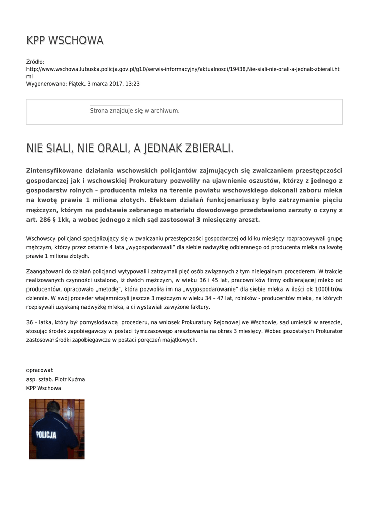 KPP WSCHOWA Źródło: http://www.wschowa.lubuska.policja.gov.pl/g10/serwis-informacyjny/aktualnosci/19438,Nie-siali-nie-orali-a-jednak-zbierali.ht ml Wygenerowano: Piątek, 3 marca 2017, 13:23 Strona znajduje się w archiwum. NIE SIALI, NIE ORALI, A JEDNAK ZBIERALI. Zintensyfikowane działania wschowskich policjantów zajmujących się zwalczaniem przestępczości gospodarczej jak i wschowskiej Prokuratury pozwoliły na ujawnienie oszustów, którzy z jednego z gospodarstw rolnych – producenta mleka na terenie powiatu wschowskiego dokonali zaboru mleka na kwotę prawie 1 miliona złotych. Efektem działań funkcjonariuszy było zatrzymanie pięciu mężczyzn, którym na podstawie zebranego materiału dowodowego przedstawiono zarzuty o czyny z art. 286 § 1kk, a wobec jednego z nich sąd zastosował 3 miesięczny areszt. Wschowscy policjanci specjalizujący się w zwalczaniu przestępczości gospodarczej od kilku miesięcy rozpracowywali grupę mężczyzn, którzy przez ostatnie 4 lata „wygospodarowali” dla siebie nadwyżkę odbieranego od producenta mleka na kwotę prawie 1 miliona złotych. Zaangażowani do działań policjanci wytypowali i zatrzymali pięć osób związanych z tym nielegalnym procederem. W trakcie realizowanych czynności ustalono, iż dwóch mężczyzn, w wieku 36 i 45 lat, pracowników firmy odbierającej mleko od producentów, opracowało „metodę”, która pozwoliła im na „wygospodarowanie” dla siebie mleka w ilości ok 1000litrów dziennie. W swój proceder wtajemniczyli jeszcze 3 mężczyzn w wieku 34 – 47 lat, rolników - producentów mleka, na których rozpisywali uzyskaną nadwyżkę mleka, a ci wystawiali zawyżone faktury. 36 – latka, który był pomysłodawcą procederu, na wniosek Prokuratury Rejonowej we Wschowie, sąd umieścił w areszcie, stosując środek zapobiegawczy w postaci tymczasowego aresztowania na okres 3 miesięcy. Wobec pozostałych Prokurator zastosował środki zapobiegawcze w postaci poręczeń majątkowych. opracował: asp. sztab. Piotr Kuźma KPP Wschowa Ocena: 3.2/5 (11) Tweetnij