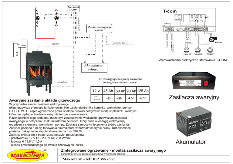 Sterownik T-COM zasilanie 230 V Zasilacz awaryjnego napięcia zasilanie 230 V czujnik Wprowadzenia elektryczne sterownika T-COM Akumulator żelowy wentylator Orientacyjny czas pracy zasilacza awaryjnego dla max. mocy 12 V 45 Ah 60 Ah 90 Ah 125 Ah Awaryjne zasilanie układu grzewczego czas pracy ~2h ~3h ~4,5h ~6,5h W przypadku zaniku zasilania elektrycznego układ grzewczy przestaje funkcjonować. Nie działa elektronika kominka, wentylator, pompy C.O. I C.W.U. Ciepło wytwarzane przez spalane drewno podgrzewa wodę w płaszczu wodnym, które nie będąc schładzane osiągnie temperaturę wrzenia. Rozwiązaniem tego problemu może być zastosowanie w układzie grzewczym zasilacza awaryjnego w połączeniu z akumulatorem żelowym, który zasili w energię elektryczną urządzenia sterujące, wentylator i pompy. Zasilacz samoczynnie zmienia źródło zasilania. Zasilacz posiada funkcję ładowania akumulatora w normalnym trybie pracy. Turbokominek posiada maksymalne zapotrzebowanie na moc 204 W. Zasilacz składa się z trzech zasadniczych podzespołów - przetwornicy 12 V DC/ 230 V AC 200 Wmax - ładowarki 13,8 V/ 1,5 A - układu przełączającego ze zwłoką czasową ok. 5s/1s ® Zintegrowane ogrzewanie - montaż zasilacza awaryjnego Schemat ideowy, nie zastępuje prawidłowo wykonanego projektu Makroterm - tel.: 012 386 76 25 Zasilacza awaryjny Akumulator