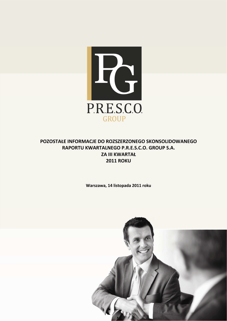 POZOSTAŁE INFORMACJE DO ROZSZERZONEGO SKONSOLIDOWANEGO RAPORTU KWARTALNEGO P.R.E.S.C.O. GROUP S.A. ZA III KWARTAŁ 2011 ROKU Warszawa, 14 listopada 2011 roku Spis treści Wprowadzenie .................................................................................................................................................................................. 2 1. 1.1 1.2 1.3 2. 3. 3.1 3.2 4. 4.1 4.2 4.3 5. 5.1 5.2 5.3 5.4 5.5 5.6 5.7 5.8 6. Działalność Grupy Kapitałowej P.R.E.S.C.O. GROUP ......................................................................................................... 2 Przedmiot działalności .................................................................................................................................... 2 Istotne wydarzenia w okresie pierwszych trzech kwartałów roku obrotowego 2011............................................ 3 Istotne zdarzenia po dniu bilansowym, nieujęte w sprawozdaniu, a mogące w znaczący sposób wpłynąć na przyszłe wyniki. .............................................................................................................................................. 4 Dane finansowe .................................................................................................................................................... 5 Organy Spółki ...................................................................................................................................................................... 7 Zarząd ............................................................................................................................................................ 7 Rada Nadzorcza .............................................................................................................................................. 7 Informacje o akcjach i akcjonariacie .................................................................................................................................. 7 Kapitał zakładowy ........................................................................................................................................... 7 Zestawienie stanu posiadania akcji lub uprawnień do nich przez osoby zarządzające i nadzorujące ....................... 8 Struktura własności akcji ................................................................................................................................. 8 Pozostałe informacje .......................................................................................................................................................... 9 Opis Grupy Kapitałowej P.R.E.S.C.O. GROUP ..................................................................................................... 9 Zmiany w strukturze Grupy Kapitałowej ......................................................................................................... 10 Informacjeotransakcjach z podmiotamipowiązanymi(zawarte na warunkach innych niż rynkowe) .............. 11 Informacje o poręczeniach i gwarancjach ....................................................................................................... 11 Wskazanie postępowań toczących się przed sądem, organem właściwym dla postępowania arbitrażowego lub organem administracji publicznej ................................................................................................................... 11 Stanowisko wobec publikowanych prognoz wyników ...................................................................................... 12 Inne informacje, które zdaniem Spółki są istotne dla oceny sytuacji kadrowej, majątkowej, finansowej, wyniku finansowego i ich zmian, oraz informacje, które są istotne dla oceny możliwości realizacji zobowiązań ............... 12 Czynniki, które w ocenie emitenta będą miały wpływ na osiągnięte wyniki w perspektywie co najmniej kolejnego kwartału ...................................................................................................................................................... 12 Dane teleadresowe ............................................................................................................................................................ 14 www.presco.pl 1 Wprowadzenie Niniejszy rozszerzony skonsolidowany raport kwartalny za III kwartał 2011 roku zawiera informacje, których zakres został określony w §87 rozporządzenia Ministra Finansów z dnia 19 lutego 2009 r. w sprawie informacji bieżących i okresowych przekazywanych przez emitentów papierów wartościowych oraz warunków uznawania za równoważne informacji wymaganych przepisami prawa państwa niebędącego państwem członkowskim. Śródroczne skrócone skonsolidowane sprawozdanie finansowe za okres dziewięciu miesięcy zakończony 30 września 2011 roku zostało sporządzone zgodnie z MSR 34 Śródroczna sprawozdawczość finansowa. Zasady (polityka) rachunkowości zastosowane do sporządzania skróconego skonsolidowanego sprawozdania finansowego zostały przedstawione w nocie nr 2 do śródrocznego skróconego skonsolidowanego sprawozdania finansowego za okres 9 miesięcy zakończony dnia 30 września 2011 r. 1. Działalność Grupy Kapitałowej P.R.E.S.C.O. GROUP 1.1 Przedmiot działalności Grupa Kapitałowa P.R.E.S.C.O. GROUP S.A. jest jednym z wiodących podmiotów działających na rynku obrotu wierzytelnościami masowymi w Polsce. Grupa specjalizuje się w nabywaniu pakietów wierzytelności, które przez ich pierwotnych właścicieli zostały uznane za trudne do odzyskania, a następnie dochodzi ich zapłaty na własny rachunek. Podstawowym przedmiotem działalności Grupy są inwestycje w portfele wierzytelności konsumenckich w celu ich dalszej samodzielnej windykacji na własny rachunek. Grupa, na podstawie umów cesji, nabywa prawa do roszczeń względem dłużnika, następnie podejmuje na własny rachunek działania zmierzające do odzysk