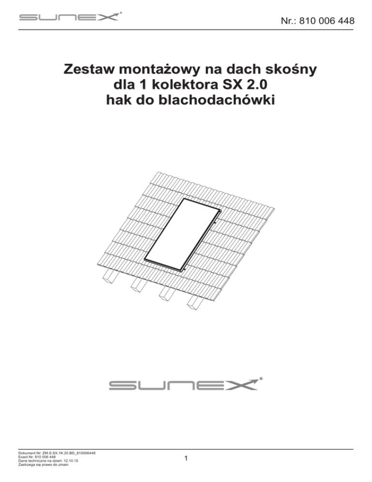 Nr.: 810 006 448 Zestaw montażowy na dach skośny dla 1 kolektora SX 2.0 hak do blachodachówki Dokument Nr: ZM.S.SX.1K.20.BD_810006448 Exact Nr: 810 006 448 Dane techniczne na dzień: 12.10.15 Zastrzega się prawo do zmain 1 Nr.: 810 006 448 9 150 0÷ 170 0 A Hak do blachodachówki ≈150 ≈828 1128 ≈150 Wykaz elementów Poz. Opis Ilość 1 Hak do blachy trapezowej i falistej (podstawa + ramię) 4 kpl. 2 Profil aluminiowy L= 1128mm 2 szt. 3 Wieszak 100x4 - długi P3 2 szt. 4 Nakładka nierdzewna 30x74mm 2 szt. 5 Nakładka nierdzewna 30x35mm 4 szt. 6 Śruba zamkowa nierdzewna M8x25 + nakrętka kołnierzowa 4 kpl. 7 Śruba młoteczkowa nierdzewna M10x20x35 + nakrętka kołnierzowa 4 szt. 8 Śruba imbusowa nierdzewna M8x16 4 szt. 9 Wkręt 8x160 8 szt. Łącznik profilu P3 2 szt. 10 Dokument Nr: ZM.S.SX.1K.20.BD_810006448 Exact Nr: 810 006 448 Dane techniczne na dzień: 12.10.15 Zastrzega się prawo do zmain 2 Nr.: 810 006 448 1. Przygotowanie dachu do montażu zestawu. 15 00 ÷1 70 0 Zamocować haki przy pomocy wkrętów ocynkowanych. ≈82 8 Dokument Nr: ZM.S.SX.1K.20.BD_810006448 Exact Nr: 810 006 448 Dane techniczne na dzień: 12.10.15 Zastrzega się prawo do zmain 3 Nr.: 810 006 448 2. Montaż wieszaków kolektora 3 . Wieszaki należy założyć na dolnym profilu po dwa na każdy kolektor. Zalecany jest rozstaw po 15cm z boku każdej ze strony kolektora. 2 2 3 4. Mocno przykręcamy śrubę 3. Ułożone kolektory na wieszakach 3 mocujemy nakładką 4 i śrubą 6 po wcześniejszym ich zsunięciu. Czynności w punktach 3 i 4 wykonujemy w przypadku montażu zestawu rozszerzającego. 6 4 6 6. Mocno dokręcamy śrubę 6 . 5. Kolektory z boków mocujemy nakładką 5 i śrubami 6 . 6 5 6 Dokument Nr: ZM.S.SX.1K.20.BD_810006448 Exact Nr: 810 006 448 Dane techniczne na dzień: 12.10.15 Zastrzega się prawo do zmain 4 6 . Nr.: 810 006 448 7. Montaż kolektora na profilach aluminiowych 2 . 6 2 5 7 1 9 6 2 5 7 3 1 9 Poz. Opis 2 Hak do blachy trapezowej i falistej (podstawa + ramię) Profil aluminiowy 3 Wieszak 100x4 - długi P3 4 Nakładka nierdzewna 30x74mm 5 Nakładka nierdzewna 30x35mm 1 6 7 8 9 10 Dokument Nr: ZM.S.SX.1K.20.BD_810006448 Exact Nr: 810 006 448 Dane techniczne na dzień: 12.10.15 Zastrzega się prawo do zmain 5 Śruba zamkowa nierdzewna M8x25 + nakrętka kołnierzowa Śruba młoteczkowa nierdzewna M10x20x35 + nakrętka kołnierzowa Śruba imbusowa nierdzewna M8x16 Wkręt 8x160 Łącznik profilu P3 Nr.: 810 006 448 8. Przykład montażu dwóch zestawów. 2 Wsunąć łącznik profilu 10 w profile aluminiowe zestawów montażowych i przykręcić śruby imbusowe 9 . 10 2 9 9. Przymocować kolektory przy pomocy nakładki nierdzewnej Czynność należy powtórzyć na górnym profilu. 6 4 6 Dokument Nr: ZM.S.SX.1K.20.BD_810006448 Exact Nr: 810 006 448 Dane techniczne na dzień: 12.10.15 Zastrzega się prawo do zmain 6 4 oraz kompletu śrub 6 .