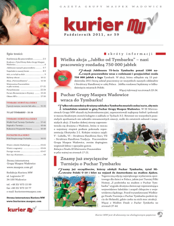 G A Z E T A G R U P Y M A S P E X W A D O W I C E Październik 2011, nr 59 skróty informacji Spis treści: Konferencja dla pracowników .................. 2-3 Konkurs o Tytuł Firmy Roku Grupy Maspex Wadowice ........................................................4 Jubileusze naszych pracowników ............. 5-7 Wielka akcja „Jabłko od Tymbarku” – nasi pracownicy rozdadzą 750 000 jabłek Z okazji Jubileuszu 75-lecia Tymbarku ponad 1300 naszych pracowników wraz z rodzinami i przyjaciółmi rozda 750 000 jabłek z logo Tymbark. W akcji, która odbędzie się 15 października 2011 biorą udział pracownicy ze wszystkich naszych oddziałów i Struktury Handlowej w całej Polsce. Jabłka rozdawać będziemy w kilkudziesięciu miastach Polski. Więcej informacji na stronach 33-34. Najmłodsi w naszej firmie ........................ 8-9 Ach, co to był za ślub .................................... 9 Byliśmy obecni ...................................... 10-11 Akcja „Pierwszoklasista” ....................... 12-16 Mistrzostwa Pracowników w piłce nożnej. ....................................... 17–21 Pomysłomania ...................................... 22-24 Forum Ekonomiczne w Krynicy .......... 25-26 Okiem HR’u .......................................... 27-30 TYMBARK I KUBUŚ DLA DZIECI 5 porcji warzyw, owoców lub soku........ 31-32 75 LAT TYMBARKU – 33-36 TYMBARK I KUBUŚ DLA DZIECI Wielki Finał Turnieju Tymbarku ........ 37-42 Napisali o Turnieju ................................ 43-44 Kubusiowi Przyjaciele Natury .............. 45-49 PUCHATEK DLA DZIECI Klub Bezpiecznego Puchatka ............... 50-52 Wieści z działu Marketingu ........... .......53-62 Wieści z zagranicy ............................... 63-64 Foreign version ...................................... 65-67 Baw się z Kurierem ...................................... 68 Strona internetowa Grupy Maspex Wadowice www.maspex.com.pl Redakcja Kuriera MW ul. Legionów 37 34-100 Wadowice tel. +48 33/ 873 15 99 fax +48 33/ 873 10 77 e-mail: [email protected] Strona internetowa Kuriera MW www.kuriermw.maspex.com Puchar Grupy Maspex Wadowice wraca do Tymbarku! T ylko rok zawodnicy drużyny zakładu z Tymbarku musieli czekać na to, aby móc triumfalnie wznieść w górę Puchar Grupy Maspex Wadowice. W III Mistrzostwach Grupy MW okazali się bezkonkurencyjni, zaprezentowali najlepszy futbol i pokonali w meczu finałowym swoich kolegów z zakładu w Tychach 3:2. Również we wszystkich pozostałych spotkaniach nie zabrakło niesamowitych emocji, walki do ostatnich sekund i wspaniałych akcji. Z bardzo dobrej strony zaprezentowała się drużyna z Wadowic, która w meczu o najniższy stopień podium pokonała reprezentację Olsztynka 2:1. Kolejne miejsca zajęli: V - Lubella, VI – Struktura Handlowa Sieci, VII – Struktura Handlowa Tradycja. Pracowników Grupy Maspex Wadowice, swoim dopingiem wspierali kibice i specjalni goście. Relacja z Finału III Mistrzostw Pracowników w piłce nożnej na stronach 17-21. Znamy już zwycięzców Turnieju o Puchar Tymbarku Z namy już szczęśliwców, którzy zdobyli Puchar Tymbarku, tytuł Mistrzów Polski U-10 i bilet na wyjazd do Amsterdamu na stadion Ajaksu. Tegoroczną edycję największego wydarzenia sportowego dla dzieci w Polsce, jakim jest Turniej Piłki Nożnej „Z podwórka na stadion o Puchar Tymbarku” wygrała drużyna dziewcząt reprezentująca województwo lubelskie i zespół chłopców z województwa śląskiego. Przed tryumfatorami Wielkiego Finału Turnieju o Puchar Tymbarku podróż życia do Holandii, gdzie czeka na nich moc atrakcji. Więcej o Wielkim Finale o Puchar Tymbarku na stronach 37-44. Kurier MW jest drukowany na ekologicznym papierze 1 firma Sucha Beskidzka 2011 – konferencja i spotkanie dla pracowników Grupy Maspex Wadowice N a początku września w Suchej Beskidzkiej odbyło się spotkanie pracowników Grupy Maspex Wadowice. Do Suchej Beskidzkiej przyjechali przedstawiciele wszystkich firm z Polski i z zagranicy: z Czech, Słowacji, Ukrainy i Rosji, Rumunii, Węgier. W sumie zebrało się prawie 700 osób. Całe tegoroczne spotkanie odbyło się w konwencji Mamma Mia Maspex Night. Konferencja Spotkanie rozpoczęła konferencja, przygotowana z myślą o wszystkich gościach. Pracowników powitał prezes Krzysztof Pawiński, który podczas specjalnie przygotowanej prezentacji przedstawił wszystkim to jak bardzo nasza firma rozwinęła się w przeciągu ostatnich 20 lat, a także przedstawił misję i wizję naszej firmy oraz strategię działania naszej firmy na kolejne lata. Prezes Pawiński zaprezentował również wszystkim nasz nowy, pierwszy na tak dużą skalę, projekt „Jabłko od Tymbarku”. Z okazji Jubileuszu 75-lecia Tymbarku w połowie października pracownicy naszej firmy będą rozdawać w całej Polsce 750 000 jabłek z logo Tymbark naszym konsumentom. Druga część prezentacji była poświęcona działaniom marketingowym. Sławomir Irzyński opowiedział o planach dla marki Lubella a Wanda Żulik podzieliła się ze wszystkimi informacjami na temat marek instant. Wszyscy pracownicy mogli zobaczyć nowości od Tymbarku oraz obejrzeć nowe propozycje reklam, które przedstawił Patryk Białokozowicz z Działu Marketingu Struktury Mokrej. O tym, co słychać u Kubu- Prezes Krzysztof Pawiński opowiada o wyjątkowej akcji „Jabłko od Tymbarku” sia opowiedziała Iwona Piasta. Prezentację zakończył Robert Samaruk, który zaprezentował najnowsze reklamy telewizyjne Tigera. Robert zaprosił również na scenę gościa specjalnego konferencji - Dariusza Tiger Michalczewskiego, który podziękował wszystkim pracownikom za zaangażowanie i wsparcie przy tym projekcie. Cała prezentacja była przeplatana piosenkami Abby ze specjalnymi, napisanymi na tą wyjątkową okoliczność, tekstami. Nasi pracownicy podczas konferencji nr 59 / Październik 2011 2 firma Jubileusze w Grupie Maspex Wadowice Następnie prezes Krzysztof 