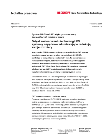 Notatka prasowa PR122104 7 kwietnia 2014 System wejść/wyjść, Technologia napędów Strona 1 z 3 System I/O EtherCAT: większy zakres mocy kompaktowych modułów serwo Dzięki zastosowaniu technologii I/O systemy napędowe zdumiewająco redukują swoje rozmiary Nowy moduł E7211 rozszerza ofertę systemu I/O EtherCAT o nowy, kompletny napęd serwo z prądem na wyjściu do 4.5 ARMS, zamknięty w kompaktowej obudowie 24-mm. To zaawansowane rozwiązanie dostępne jest w dwóch wariantach, pod względem sposobu dostarczania informacji zwrotnej: z resolwerem lub w technologii OCT (One Cable Technology). W komplecie z nowymi silnikami serwo AM811x, użytkownik dodatkowo otrzymuje wyjątkowo kompaktowy, wydajny i niedrogi system serwo. Moduł EtherCAT EL7211 ze zintegrowanym resolwerem to imponująca moc napędu w niezwykle kompaktowej obudowie. Zaprojektowany został głównie do współpracy z silnikami AM31xx oraz AM81xx firmy Beckhoff. EL7211 w obudowie 24-mm dostarcza więcej mocy, bo aż do 4.5 ARMS przy 50 V DC, niż sprawdzony i popularny moduł serwo EL7201 w obudowie 12-mm i mocą 2.8 ARMS. OCT upraszcza montaż i redukuje koszty Ponieważ moduł serwo EL7211-0010 obsługuje enkodery absolutne, można go zastosować w połączeniu z silnikami rodziny AM81xx w technologii OCT (One Cable Technology), która poprzez wykorzystanie tylko jednego przewodu zarówno do zasilania jak i przesłania sygnału informacji zwrotnej, pozwala znacząco obniżyć koszty uruchomienia i materiałów. Zintegrowana w silniki elektroniczna tabliczka znamionowa jest automatycznie odczytywana przez moduł EtherCAT EL7211-0010, co znacząco upraszcza konserwację silnika. Beckhoff Automation Sp. z o.o. Żabieniec, ul. Ruczajowa 15 05-500 Piaseczno Poland Telefon: + 48 22 / 7 50 47 00 e-mail: [email protected] www.beckhoff.pl Kontakt dla prasy Zbigniew Piątek [email protected] Notatka prasowa PR122104 7 kwietnia 2014 System wejść/wyjść, Technologia napędów Strona 2 z 3 Technologia szybkiego sterowania zastosowana w modułach EL7211, uzyskana poprzez sterowanie prądem i prędkością PI, jest idealnym rozwiązaniem dla szybkich i wysoce dynamicznych aplikacji pozycjonowania. Monitorowanie dużej ilości parametrów, tj. wartości napięć, prądów czy też temperatury i obciążenia silnika poprzez obliczenia modelu 12T, oferuje maksymalną niezawodność rozwiązania. EtherCAT, jako system komunikacji wysokiej wydajności oraz CoE (CAN over EtherCAT) na poziomie aplikacji pozwalają na uzyskanie optymalnej fuzji z technologią opartą o PC (PC-based). Nowe, kompaktowe silniki serwo to dodatkowa oszczędność miejsca Nowe silniki serwo AM811x, sterowane przez moduły EL72xx-0010, w zakresie mocy wyjścia od 50 do 250 W i kołnierzem o rozmiarze 40 mm zostały zaprojektowane tak, by w jak największym stopniu minimalizować zajmowaną przestrzeń. Wyposażono je w enkodery absolutne jedno, lub wieloobrotowe, z rozdzielczością 15 bit i technologią OCT (One Cable Technology). Obrotowe złącza z funkcją szybkiego rozłączania ułatwiają montaż przy jednoczesnym spełnieniu wszystkich wymogów przemysłowych. Silniki AM811x występują w trzech rozmiarach, a opcjonalne wyposażenie w hamulec magnetyczny umożliwia stosowanie ich w szerokim zakresie aplikacji. www.beckhoff.pl/EL7201 Beckhoff Automation Sp. z o.o. Żabieniec, ul. Ruczajowa 15 05-500 Piaseczno Poland Telefon: + 48 22 / 7 50 47 00 e-mail: [email protected] www.beckhoff.pl Kontakt dla prasy Zbigniew Piątek [email protected] Notatka prasowa PR122104 7 kwietnia 2014 System wejść/wyjść, Technologia napędów Strona 3 z 3 Fotografia do notatki Nowy moduł serwo EL7211 obsługujący silniki do 4.5 ARMS i jego wariant EL7211-0010 w technologii OCT (One Cable Technology) umożliwiają obniżenie kosztów uruchomienia i kosztów materiałowych. Zdjęcie można pobrać klikając na link: download.beckhoff.com/download/press/2014/presskit/ pr122014_Beckhoff.zip Zapytania dotyczące „EL7201” prosimy kierować do: Beckhoff Automation Sp. z o.o. Żabieniec, ul. Ruczajowa 15, 05-500 Piaseczno, Poland Phone: + 48 22 / 750 47 00, e-mail: [email protected], www.beckhoff.pl Beckhoff Automation Sp. z o.o. Żabieniec, ul. Ruczajowa 15 05-500 Piaseczno Poland Telefon: + 48 22 / 7 50 47 00 e-mail: [email protected] www.beckhoff.pl Kontakt dla prasy Zbigniew Piątek [email protected]