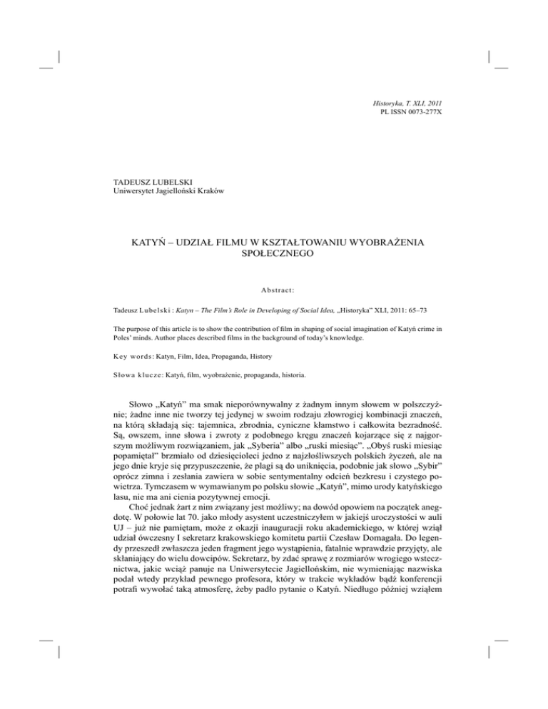 Historyka, T. XLI, 2011 PL ISSN 0073-277X TADEUSZ LUBELSKI Uniwersytet Jagielloński Kraków KATYŃ – UDZIAŁ FILMU W KSZTAŁTOWANIU WYOBRAŻENIA SPOŁECZNEGO A b st r act : Tadeusz Lu b e l s k i : Katyn – The Film’s Role in Developing of Social Idea, „Historyka” XLI, 2011: 65–73 The purpose of this article is to show the contribution of film in shaping of social imagination of Katyń crime in Poles’ minds. Author places described films in the background of today’s knowledge. Ke y wo r d s : Katyn, Film, Idea, Propaganda, History Sł o wa k l u c z e : Katyń, film, wyobrażenie, propaganda, historia. Słowo „Katyń” ma smak nieporównywalny z żadnym innym słowem w polszczyźnie; żadne inne nie tworzy tej jedynej w swoim rodzaju złowrogiej kombinacji znaczeń, na którą składają się: tajemnica, zbrodnia, cyniczne kłamstwo i całkowita bezradność. Są, owszem, inne słowa i zwroty z podobnego kręgu znaczeń kojarzące się z najgorszym możliwym rozwiązaniem, jak „Syberia” albo „ruski miesiąc”. „Obyś ruski miesiąc popamiętał” brzmiało od dziesięcioleci jedno z najzłośliwszych polskich życzeń, ale na jego dnie kryje się przypuszczenie, że plagi są do uniknięcia, podobnie jak słowo „Sybir” oprócz zimna i zesłania zawiera w sobie sentymentalny odcień bezkresu i czystego powietrza. Tymczasem w wymawianym po polsku słowie „Katyń”, mimo urody katyńskiego lasu, nie ma ani cienia pozytywnej emocji. Choć jednak żart z nim związany jest możliwy; na dowód opowiem na początek anegdotę. W połowie lat 70. jako młody asystent uczestniczyłem w jakiejś uroczystości w auli UJ – już nie pamiętam, może z okazji inauguracji roku akademickiego, w której wziął udział ówczesny I sekretarz krakowskiego komitetu partii Czesław Domagała. Do legendy przeszedł zwłaszcza jeden fragment jego wystąpienia, fatalnie wprawdzie przyjęty, ale skłaniający do wielu dowcipów. Sekretarz, by zdać sprawę z rozmiarów wrogiego wstecznictwa, jakie wciąż panuje na Uniwersytecie Jagiellońskim, nie wymieniając nazwiska podał wtedy przykład pewnego profesora, który w trakcie wykładów bądź konferencji potrafi wywołać taką atmosferę, żeby padło pytanie o Katyń. Niedługo później wziąłem 66 Tadeusz Lubelski udział w wyjazdowej konferencji teoretycznoliterackiej, gdzie o tym opowiadano. Wieczorami, kiedy nieoficjalne obrady toczyły się w mniejszych grupach, co chwilę ktoś wpadał do pokojów hotelowych z pytaniem: „- Czy u was jest już odpowiednia atmosfera, żeby padło pytanie o Katyń?” Na żart pozwalano sobie jednak wyłącznie w związku z kłamstwem katyńskim, nie ze zbrodnią. Jak kończy swoją książkę Andrzej Krzysztof Kunert: „Kłamstwo katyńskie stało się kłamstwem założycielskim PRL…”1. To kłamstwo nie decydowało jednak bezwzględnie o wyobrażeniu społecznym Katynia, jakie kształtowało się przez minione lata. Bronisław Baczko definiuje wyobrażenia społeczne jako „specyficzne punkty odniesienia w rozległym systemie symbolicznym, wytwarzanym przez każdą zbiorowość, poprzez który postrzega ona siebie samą […]. Tak więc dzięki wyobrażeniom społecznym zbiorowość określa swoją tożsamość, […], a znaczy to jednocześnie wyznaczyć swoje terytorium i jego granice, swoje stosunki z innymi, stworzyć obrazy przyjaciół i wrogów, rywali i sojuszników; to także przechowywać i kształtować wspomnienia przeszłości oraz rzutować w przyszłość swoje obawy i nadzieje”2. Wyobrażenie społeczne Katynia formowało się w nieustannej walce wersji oficjalnej („kłamstwa założycielskiego PRL”) z nieoficjalną, dozwolonej z zakazaną. W niniejszym artykule rozważam udział filmu w kształtowaniu wyobrażenia społecznego zbrodni katyńskiej w świadomości Polaków. Biorę pod uwagę filmy dokumentalne i fabularne, powstałe w różnych warunkach historycznych i w odmiennych okolicznościach produkcyjnych. Pełny sens słowa „Katyń” krył w sobie przez długie lata złowrogą bezwyjściowość. W dzisiejszych opracowaniach historycznych pierwsza faza tej bezwyjściowości łączy się z okresem sprzed 11 kwietnia 1943 roku, kiedy słowo „Katyń” w polszczyźnie było jeszcze nieznane. Według świadectw radzieckich, po 17 września 1939 roku w ZSRR uwięziono około 240 tysięcy żołnierzy polskich wszystkich stopni, w tym około 10 tysięcy oficerów. Połowę szybko uwolniono, resztę zaczęto zsyłać na północ lub południe3. Z dniem 30 lipca 1941 roku, w wyniku podpisania paktu Sikorski-Majski, Polacy i Rosjanie, nawiązawszy na powrót stosunki dyplomatyczne, znaleźli się po tej samej stronie wojennego konfliktu. Pakt przewidywał uwolnienie wszystkich polskich jeńców znajdujących się na terytorium Związku Radzieckiego. W wyniku porozumienia władze stalinowskie zaczęły uwalniać polskich oficerów i żołnierzy, by utworzyć z nich nową armię dla wzmocnienia koalicji antyhitlerowskiej. Jednak około piętnastu tysięcy uwięzionych – ludzi zasłużonych, należących do elity inteligencji polskiej okresu międzywojennego, w tej liczbie 8300 oficerów – wciąż brakowało. Wkrótce dowódca nowo utworzonej polskiej armii generał Anders powołał przy swoim dowództwie Biuro Poszukiwań dla sporządzenia listy zaginionych, którego organizacją zajął się z ogromną odwagą Józef Czapski. Okazało się wtedy, że wszyscy zaginieni zostali późną jesienią 1939 roku umieszczeni w trzech obozach specjalnych: w Kozielsku koło Smoleńska, w Ostaszkowie w pobliżu Tweru oraz na południu, w Starobielsku koło Charkowa; z tej grupy odnalazło się tylko około czterystu jeńców przewiezionych ostatnim transportem, w połowie maja 1940 roku, do małego 1 A.K. Ku n e r t , Katyń. Ocalona pamięć, Warszawa 2010, s. 208. B. Ba c z k o , Wyobrażenia społeczne. Szkice o nadziei i pamieci zbiorowej., Warszawa 1994