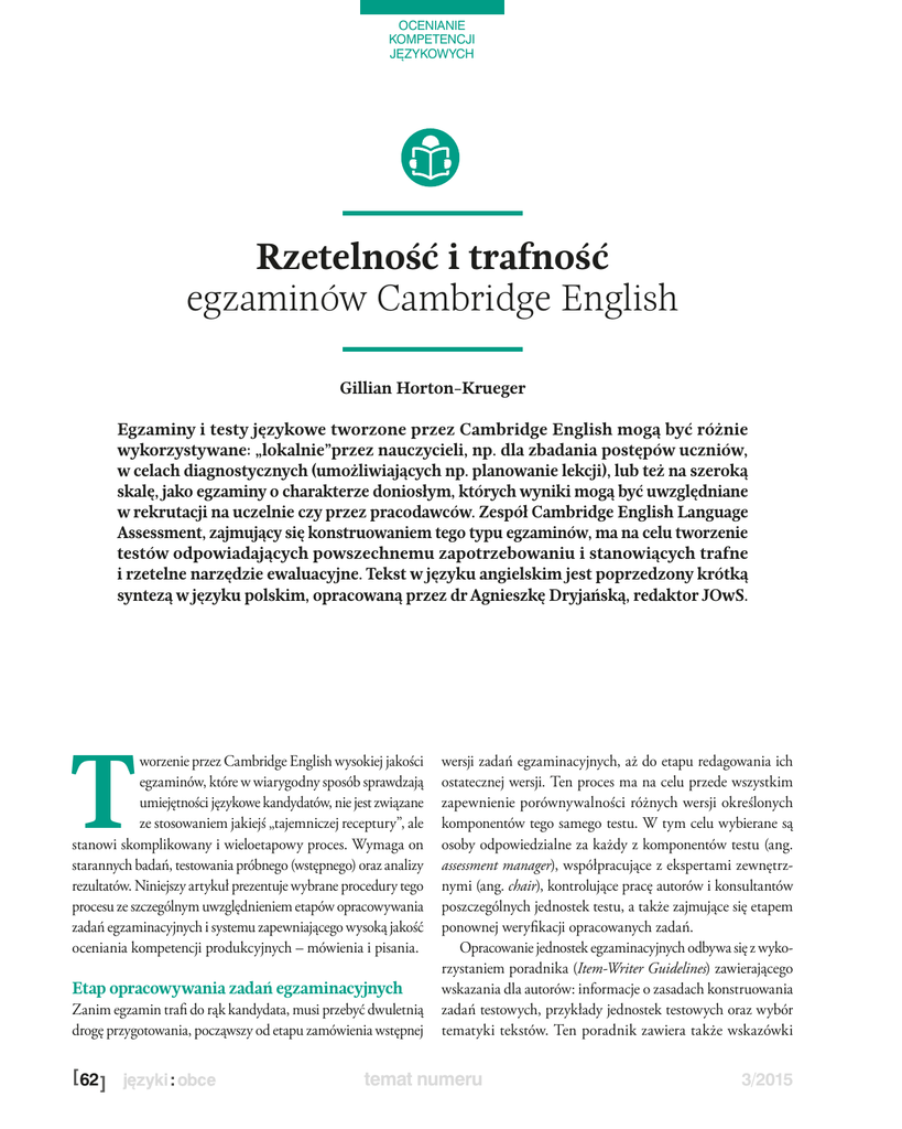 OCENIANIE KOMPETENCJI JĘZYKOWYCH Rzetelność i trafność egzaminów Cambridge English Gillian Horton-Krueger Egzaminy i testy językowe tworzone przez Cambridge English mogą być różnie wykorzystywane: „lokalnie”przez nauczycieli, np. dla zbadania postępów uczniów, w celach diagnostycznych (umożliwiających np. planowanie lekcji), lub też na szeroką skalę, jako egzaminy o charakterze doniosłym, których wyniki mogą być uwzględniane w rekrutacji na uczelnie czy przez pracodawców. Zespół Cambridge English Language Assessment, zajmujący się konstruowaniem tego typu egzaminów, ma na celu tworzenie testów odpowiadających powszechnemu zapotrzebowaniu i stanowiących trafne i rzetelne narzędzie ewaluacyjne. Tekst w języku angielskim jest poprzedzony krótką syntezą w języku polskim, opracowaną przez dr Agnieszkę Dryjańską, redaktor JOwS. T worzenie przez Cambridge English wysokiej jakości egzaminów, które w wiarygodny sposób sprawdzają umiejętności językowe kandydatów, nie jest związane ze stosowaniem jakiejś „tajemniczej receptury”, ale stanowi skomplikowany i wieloetapowy proces. Wymaga on starannych badań, testowania próbnego (wstępnego) oraz analizy rezultatów. Niniejszy artykuł prezentuje wybrane procedury tego procesu ze szczególnym uwzględnieniem etapów opracowywania zadań egzaminacyjnych i systemu zapewniającego wysoką jakość oceniania kompetencji produkcyjnych – mówienia i pisania. Etap opracowywania zadań egzaminacyjnych Zanim egzamin trafi do rąk kandydata, musi przebyć dwuletnią drogę przygotowania, począwszy od etapu zamówienia wstępnej [ 62 ] wersji zadań egzaminacyjnych, aż do etapu redagowania ich ostatecznej wersji. Ten proces ma na celu przede wszystkim zapewnienie porównywalności różnych wersji określonych komponentów tego samego testu. W tym celu wybierane są osoby odpowiedzialne za każdy z komponentów testu (ang. assessment manager), współpracujące z ekspertami zewnętrznymi (ang. chair), kontrolujące pracę autorów i konsultantów poszczególnych jednostek testu, a także zajmujące się etapem ponownej weryfikacji opracowanych zadań. Opracowanie jednostek egzaminacyjnych odbywa się z wykorzystaniem poradnika (Item-Writer Guidelines) zawierającego wskazania dla autorów: informacje o zasadach konstruowania zadań testowych, przykłady jednostek testowych oraz wybór tematyki tekstów. Ten poradnik zawiera także wskazówki temat numeru 3/2015 OCENIANIE KOMPETENCJI JĘZYKOWYCH Egzaminy Cambridge English osiągają wysoki poziom rzetelności i trafności dzięki wieloetapowej procedurze tworzenia zadań testowych. Niezwykle ważne jest zaangażowanie ekspertów mających nie tylko wiedzę teoretyczną (…), ale także bogate doświadczenie w nauczaniu języka angielskiego. usprawniające poszukiwanie tekstów źródłowych oraz niezbędne informacje z Europejskiego systemu opisu kształcenia językowego (ESOKJ) odnośnie do konkretnego poziomu w zakresie wymagań gramatycznych czy leksykalnych. Zadania, które zostaną przyjęte, po przejściu procesu edytorskiego są poddawane kluczowej procedurze – testowaniu próbnemu na reprezentatywnej dla danego egzaminu populacji uczniów. Ten etap dostarcza informacji zwrotnych dotyczących poziomu trudności pytań oraz tego, w jaki sposób badane zadania pozwalają rozróżnić zdających o wyższym i niższym poziomie. Te dane statystyczne, w połączeniu z oceną ekspertów, są brane pod uwagę przy dalszym opracowywaniu testu. Materiały, które finalnie odpowiadają wszystkim wymaganiom (odpowiednio opisane, z uwzględnieniem typu zadania, tematyki i długości tekstów czy wieku egzaminowanych) trafiają do „banku jednostek testowych” – bazy danych, z której bezpośrednio korzystają twórcy konkretnych egzaminów. Zapewnienie wysokiej jakości oceniania Zadania umożliwiające obiektywną ocenę to te niewymagające oceny eksperta: można je oceniać albo automatycznie, albo z wykorzystaniem klucza zawierającego wszystkie dopuszczone 3/2015 odpowiedzi. Ten typ oceniania jest wykorzystywany w zadaniach sprawdzających kompetencje receptywne: czytanie, słuchanie oraz test gramatyczno-leksykalny (ang. Use of English). Najbardziej złożonym zagadnieniem w zakresie oceniania jest zapewnienie rzetelnej oceny kompetencji produkcyjnych. Głównie z myślą o tym właśnie rodzaju oceniania opracowano specjalny system zapewniający jakość oceniania – Quality assurance for marking (QA). Skale ocen wykorzystywane w ocenianiu kompetencji produkcyjnych: pisania i mówienia, są tworzone w odniesieniu do zaleceń ESOKJ przez ekspertów mających bogate doświadczenie w nauczaniu języka angielskiego. Egzaminatorzy, którzy zajmują się ocenianiem kompetencji produkcyjnych kandydatów, są poddawani wieloetapowemu procesowi szkoleń i ewaluacji umiejętności egzaminacyjnych. Jest to szczególnie trudne w przypadku oceniania wypowiedzi ustnych, gdyż wymaga wyszkolenia wielkiej liczby egzaminatorów na całym świecie (20 tys.). W celu zapewnienia odpowiedniej jakości szkolenie tych egzaminatorów ma charakter kaskadowy – lider regionalny nadzoruje pewną liczbę egzaminatorów, z których każdy nadzoruje kolejną grupę dobraną już w mniejszych okręgach itd. W przypadku wypowiedzi pisemnych liczba oceniających jest mniejsza, gdyż mniej jest ośrodków centralnych, w których oceniane są przesłane prace, stąd proces szkolenia i kontroli jest prostszy. Szkolenie egzaminatorów polega na dostarczeniu im odpowiednich materiałów o charakterze zarówno merytorycznym, jak i organizacyjnym. W przypadku wypowiedzi ustnych i pisemnych udostępniane są dwa zestawy materiałów audiowizualnych: pierwszy szkoleniowy, drugi sprawdzający. Certyfikat dopuszczający do egzaminowania otrzymują tylko te osoby, których oceny prezentowanych wypowiedzi mieszczą się w zakresie ustalonym przez ekspertów. Podsumowując, egzaminy C