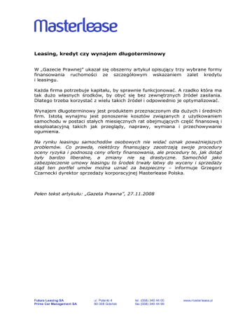 Leasing, kredyt czy wynajem długoterminowy W „Gazecie Prawnej” ukazał się obszerny artykuł opisujący trzy wybrane formy finansowania ruchomości ze szczegółowym wskazaniem zalet kredytu i leasingu. KaŜda firma potrzebuje kapitału, by sprawnie funkcjonować. A rzadko która ma tak duŜo własnych środków, by obyć się bez zewnętrznych źródeł zasilania. Dlatego trzeba korzystać z wielu takich źródeł i odpowiednio je optymalizować. Wynajem długoterminowy jest produktem przeznaczonym dla duŜych i średnich firm. Istotą wynajmu jest ponoszenie kosztów związanych z uŜytkowaniem samochodu w postaci stałych miesięcznych rat obejmujących część finansową i eksploatacyjną takich jak przeglądy, naprawy, wymiana i przechowywanie ogumienia. Na rynku leasingu samochodów osobowych nie widać oznak powaŜniejszych problemów. Co prawda, niektórzy finansujący zaostrzają swoje procedury oceny ryzyka i podnoszą ceny oferty finansowania, ale procedury te, jak dotąd były bardzo liberalne, a zmiany nie są drastyczne. Samochód jako zabezpieczenie umowy leasingu to środek trwały łatwy do wyceny i sprzedaŜy stąd ten portfel umów moŜna uznać za bezpieczny – informuje Grzegorz Czarnecki dyrektor sprzedaŜy korporacyjnej Masterlease Polska. Pełen tekst artykułu: „Gazeta Prawna”, 27.11.2008