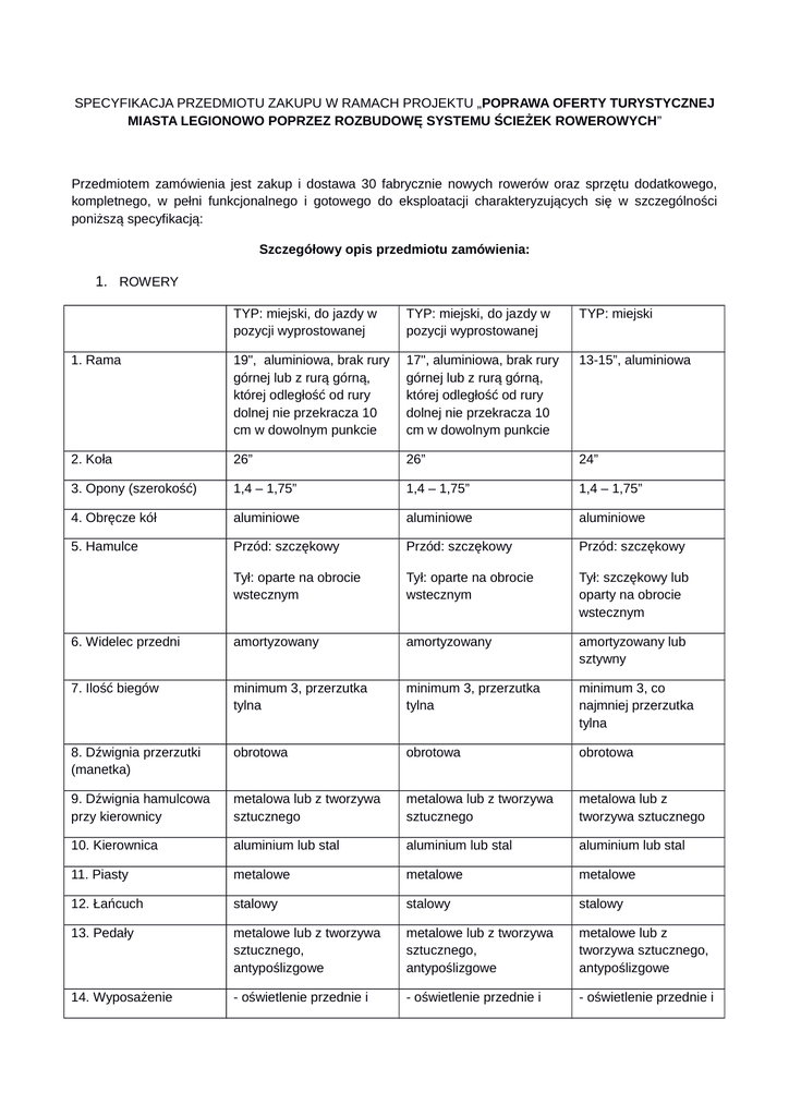 SPECYFIKACJA PRZEDMIOTU ZAKUPU W RAMACH PROJEKTU „POPRAWA OFERTY TURYSTYCZNEJ MIASTA LEGIONOWO POPRZEZ ROZBUDOWĘ SYSTEMU ŚCIEŻEK ROWEROWYCH” Przedmiotem zamówienia jest zakup i dostawa 30 fabrycznie nowych rowerów oraz sprzętu dodatkowego, kompletnego, w pełni funkcjonalnego i gotowego do eksploatacji charakteryzujących się w szczególności poniższą specyfikacją: Szczegółowy opis przedmiotu zamówienia: 1. ROWERY TYP: miejski, do jazdy w pozycji wyprostowanej TYP: miejski, do jazdy w pozycji wyprostowanej TYP: miejski 1. Rama 19", aluminiowa, brak rury górnej lub z rurą górną, której odległość od rury dolnej nie przekracza 10 cm w dowolnym punkcie 17", aluminiowa, brak rury górnej lub z rurą górną, której odległość od rury dolnej nie przekracza 10 cm w dowolnym punkcie 13-15”, aluminiowa 2. Koła 26” 26” 24” 3. Opony (szerokość) 1,4 – 1,75” 1,4 – 1,75” 1,4 – 1,75” 4. Obręcze kół aluminiowe aluminiowe aluminiowe 5. Hamulce Przód: szczękowy Przód: szczękowy Przód: szczękowy Tył: oparte na obrocie wstecznym Tył: oparte na obrocie wstecznym Tył: szczękowy lub oparty na obrocie wstecznym 6. Widelec przedni amortyzowany amortyzowany amortyzowany lub sztywny 7. Ilość biegów minimum 3, przerzutka tylna minimum 3, przerzutka tylna minimum 3, co najmniej przerzutka tylna 8. Dźwignia przerzutki (manetka) obrotowa obrotowa obrotowa 9. Dźwignia hamulcowa przy kierownicy metalowa lub z tworzywa sztucznego metalowa lub z tworzywa sztucznego metalowa lub z tworzywa sztucznego 10. Kierownica aluminium lub stal aluminium lub stal aluminium lub stal 11. Piasty metalowe metalowe metalowe 12. Łańcuch stalowy stalowy stalowy 13. Pedały metalowe lub z tworzywa sztucznego, antypoślizgowe metalowe lub z tworzywa sztucznego, antypoślizgowe metalowe lub z tworzywa sztucznego, antypoślizgowe 14. Wyposażenie - oświetlenie przednie i - oświetlenie przednie i - oświetlenie przednie i Ilość sztuk tylne: diodowe + baterie zasilające tylne: diodowe + baterie zasilające tylne: diodowe + baterie zasilające - siodło rowerowe sprężynowe - siodło rowerowe sprężynowe - siodło rowerowe sprężynowe - dzwonek - dzwonek - dzwonek - błotniki pełne - błotniki pełne - błotniki pełne - bagażnik - aluminium lub stal - bagażnik - aluminium lub stal - bagażnik - aluminium lub stal - koszyk mocowany na przód - koszyk mocowany na przód - podpórka boczna - podpórka boczna - podpórka boczna - odblaski - odblaski - lusterko - lusterko 12 13 - odblaski - lusterko 5 2. PRZYCZEPKI ROWEROWE 1. Liczba miejsc dla dzieci 2, z możliwością bezpiecznego przewożenia jednego dziecka 2. Rodzaj kołowe 3. Szerokość przyczepki 70-85 cm 4. Szerokość siedzenia minimum 50 cm 5. Wysokość oparcia minimum 60 cm 6. Koła pneumatyczne, obręcz aluminiowa 7. Oświetlenie typu LED 8. Pasy bezpieczeństwa tak Ilość sztuk 2 3. WYPOSAŻENIE UZUPEŁNIAJĄCE: - kaski rowerowe – typ „city”, kolor czarny, rozmiar M (54-57 cm) – 4 szt., rozmiar S (50-54 cm) – 6 szt. Kaski muszą być zgodne z normą europejską EN 1078. - kamizelki odblaskowe - żółty fluorescencyjny poliester, rozmiar: 45cm x 50cm (110cm – 134cm) – 4 szt. 50cm x 55cm (134cm – 158cm) – 4 szt. 55cm x 60cm (152cm – 168cm) – 4 szt. - foteliki rowerowe montowane za siedzeniem i przystosowane do wagi 22 kg – 10 szt. (w tym wyposażenie w trzypunktowe pasy bezpieczeństwa, system mocowania do bagażnika tylnego). Foteliki muszą być zgodne z normą europejską EN 14344. WYMAGANIA DODATKOWE: 1. Sprzęt musi spełniać wymogi określone w ustawie z dnia 20 czerwca 1997r. Prawo o ruchu drogowym (tekst jednolity Dz.U. 2012 nr 0 poz. 1137 z późn. zm.) i przepisach wykonawczych wydanych na podstawie tej ustawy. 2. Sprzęt musi spełniać w szczególności wymogi w zakresie warunków technicznych określone w Rozporządzeniu Ministra Infrastruktury z dnia 31 grudnia 2002 r. w sprawie warunków technicznych pojazdów oraz ich niezbędnego wyposażenia (tekst jednolity Dz.U. 2013 poz. 951). 3. Rowery, sprzęt dodatkowy oraz wyposażenie muszą być fabrycznie nowe - rok produkcji 2013 lub 2014 oraz spełniać wymagania wskazane w zapytaniu. 4. Każda jednostka sprzętu otrzyma specjalne, trwałe oznakowanie zdefiniowane przez Zamawiającego m.in. produktu „Aktywne Legionowo”. 5. Każda jednostka sprzętu otrzyma kartę gwarancyjną oraz instrukcję obsługi w języku polskim.