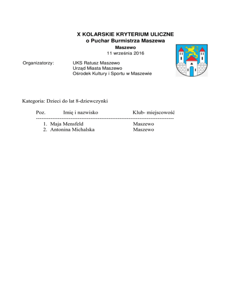 Kategoria: Dzieci do lat 8-dziewczynki Poz. Imię i nazwisko Klub- miejscowość ---------------------------------------------------------------------------1. Maja Mensfeld Maszewo 2. Antonina Michalska Maszewo